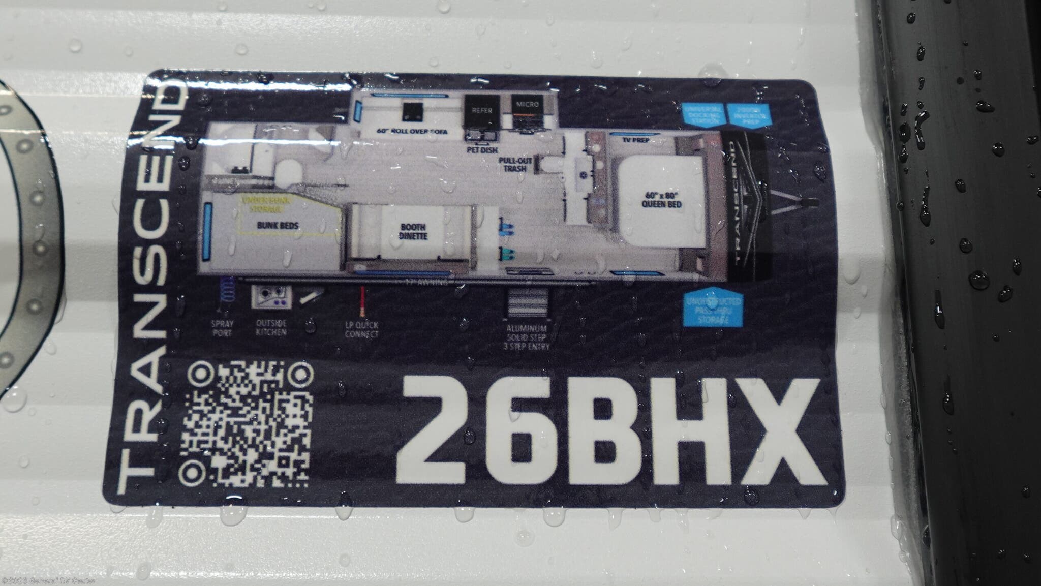 Discover the 2026 Grand Design Transcend Xplor 26BHX, a travel trailer that effortlessly combines style, comfort, and functionality for your adventures. With a length of just over 30 feet, this RV is designed to accommodate up to 10 sleepers, making it perfect for family trips or gatherings with friends. The front bedroom features a cozy queen bed, ensuring restful nights, while the bunkhouse at the rear provides additional sleeping space with double beds. The versatile convertible seating options, including a booth dinette and a 60" roll-over sofa, offer both relaxation and extra sleeping capacity. The center kitchen is equipped with a full-size electric refrigerator and a three-burner cooktop, making meal preparation a breeze. Enjoy the convenience of the outside kitchen for alfresco dining under the 17-foot powered retractable awning. The thoughtfully designed floorplan includes a rear bath with a shower curtain, ensuring privacy and comfort. With ample storage options, including under-bunk storage and unobstructed pass-thru storage, you'll have plenty of room for all your gear. Plus, the 2000W inverter prep and universal docking station enhance your camping experience with modern conveniences. Whether you're exploring the countryside or setting up at a favorite campsite, the Transcend Xplor 26BHX is your ideal home on wheels. For more details or to experience this RV firsthand, visit your nearest General RV Dealership.