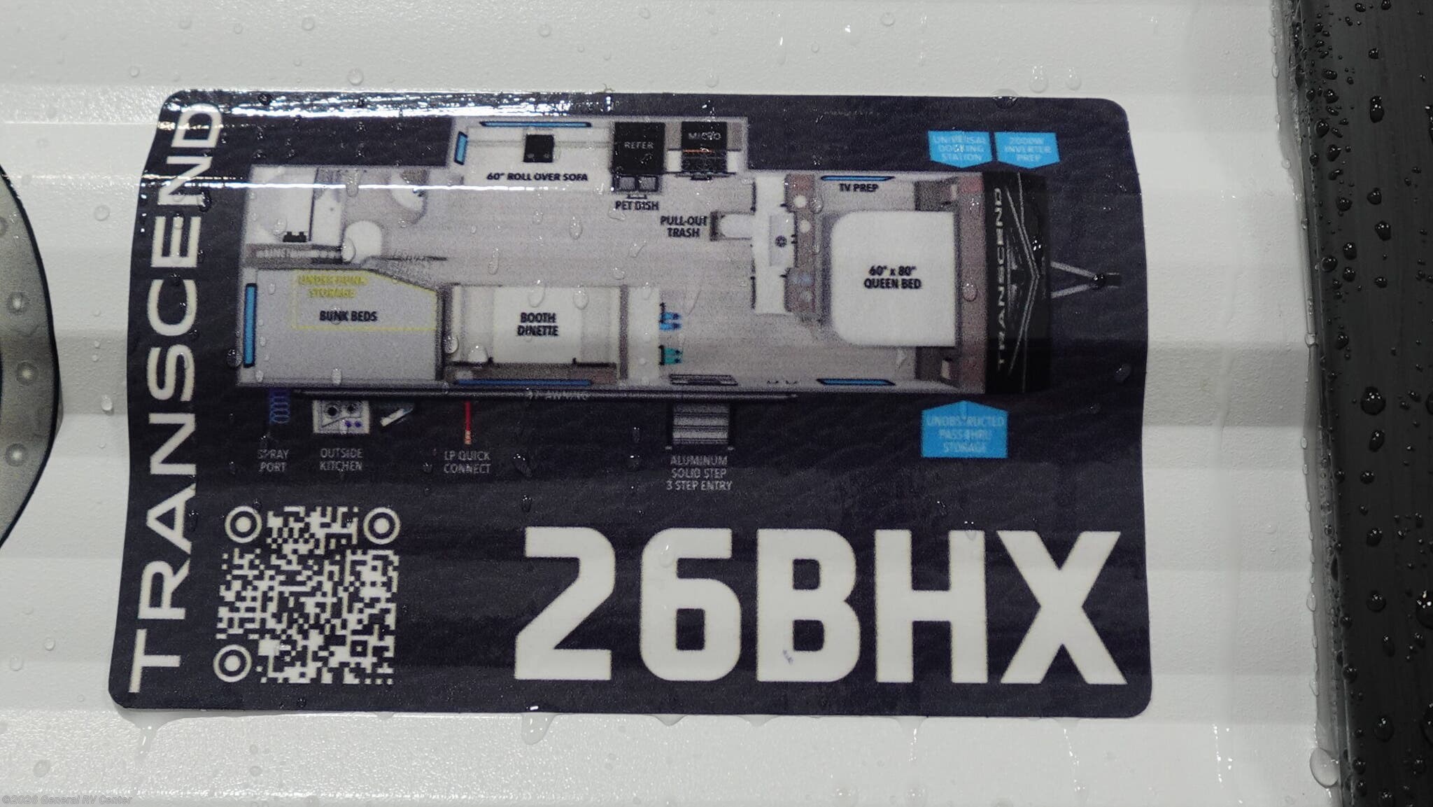 Discover the 2026 Grand Design Transcend Xplor 26BHX, a travel trailer that effortlessly combines style, comfort, and functionality for your adventures. With a length of just over 30 feet, this RV is designed to accommodate up to 10 sleepers, making it perfect for family trips or gatherings with friends. The front bedroom features a cozy queen bed, ensuring restful nights, while the bunkhouse at the rear provides additional sleeping space with double beds. The versatile convertible seating options, including a booth dinette and a 60" roll-over sofa, offer both relaxation and extra sleeping capacity. The center kitchen is equipped with a full-size electric refrigerator and a three-burner cooktop, making meal preparation a breeze. Enjoy the convenience of the outside kitchen for alfresco dining under the 17-foot powered retractable awning. The thoughtfully designed floorplan includes a rear bath with a shower curtain, ensuring privacy and comfort. With ample storage options, including under-bunk storage and unobstructed pass-thru storage, you'll have plenty of room for all your gear. Plus, the 2000W inverter prep and universal docking station enhance your camping experience with modern conveniences. Whether you're exploring the countryside or setting up at a favorite campsite, the Transcend Xplor 26BHX is your ideal home on wheels. For more details or to experience this RV firsthand, visit your nearest General RV Dealership.