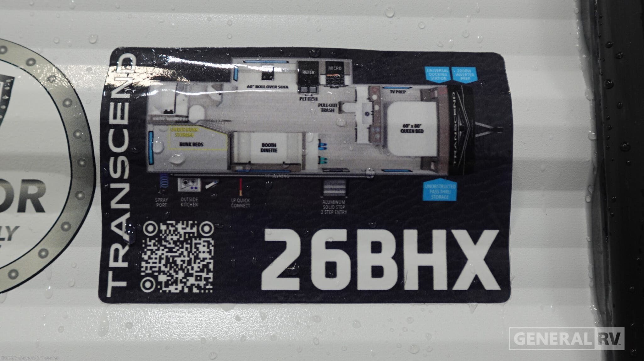 Discover the 2026 Grand Design Transcend Xplor 26BHX, a travel trailer that effortlessly combines style, comfort, and functionality for your adventures. With a length of just over 30 feet, this RV is designed to accommodate up to 10 sleepers, making it perfect for family trips or gatherings with friends. The front bedroom features a cozy queen bed, ensuring restful nights, while the bunkhouse at the rear provides additional sleeping space with double beds. The versatile convertible seating options, including a booth dinette and a 60" roll-over sofa, offer both relaxation and extra sleeping capacity. The center kitchen is equipped with a full-size electric refrigerator and a three-burner cooktop, making meal preparation a breeze. Enjoy the convenience of the outside kitchen for alfresco dining under the 17-foot powered retractable awning. The thoughtfully designed floorplan includes a rear bath with a shower curtain, ensuring privacy and comfort. With ample storage options, including under-bunk storage and unobstructed pass-thru storage, you'll have plenty of room for all your gear. Plus, the 2000W inverter prep and universal docking station enhance your camping experience with modern conveniences. Whether you're exploring the countryside or setting up at a favorite campsite, the Transcend Xplor 26BHX is your ideal home on wheels. For more details or to experience this RV firsthand, visit your nearest General RV Dealership.