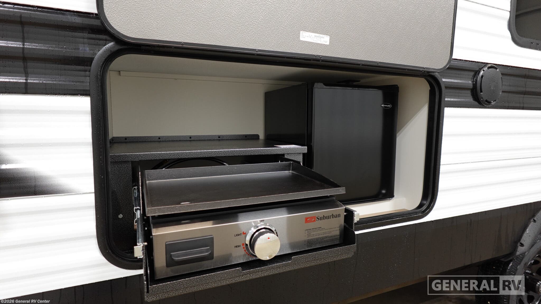 Grand Design Transcend Xplor travel trailer 26BHX highlights: Double-Size Bunk Beds with Curtains Booth Dinette Entry Counter with Shoe Storage Queen Bed 60" Roll Over Sofa Camping with your larger family or when you want to take along a few extra friends is easy with this trailer. This unit sleeps nine with the double-size bunks in the rear corner, the 60" roll over sofa, and the queen bed in the front semi-private bedroom. The booth dinette can also be used to sleep a guest or two little ones at night once converted. Prepare your meals on the three-burner cooktop indoors, or out on the two-burner cooktop at the outside kitchen! You'll also find a handy exterior spray port and an outdoor refrigerator for cold drinks! It will be so easy to fill the dog's food bowl with the added pet dish under the refrigerator, and the full bath in this model means you don't have to use the camp's facilities. Having a 17' awning outside along with a large unobstructed pass-through compartment allows you extended living outdoors and plenty of space for all of your gear! The customer-focused, quality-built Transcend Xplor travel trailers by Grand Design are your ticket to fun and adventure. You will appreciate the power tongue jack when it comes time to set up, as well as the all-in-one utility center and the detachable power cord with an LED light. These models include many outlets throughout, USB ports to charge your gadgets, and a JBL exterior speaker to listen to your favorite tunes. The interior of the Transcend Xplor will have you feeling right at home with upgraded residential furniture, residential countertops, residential cabinet doors, and the list goes on!