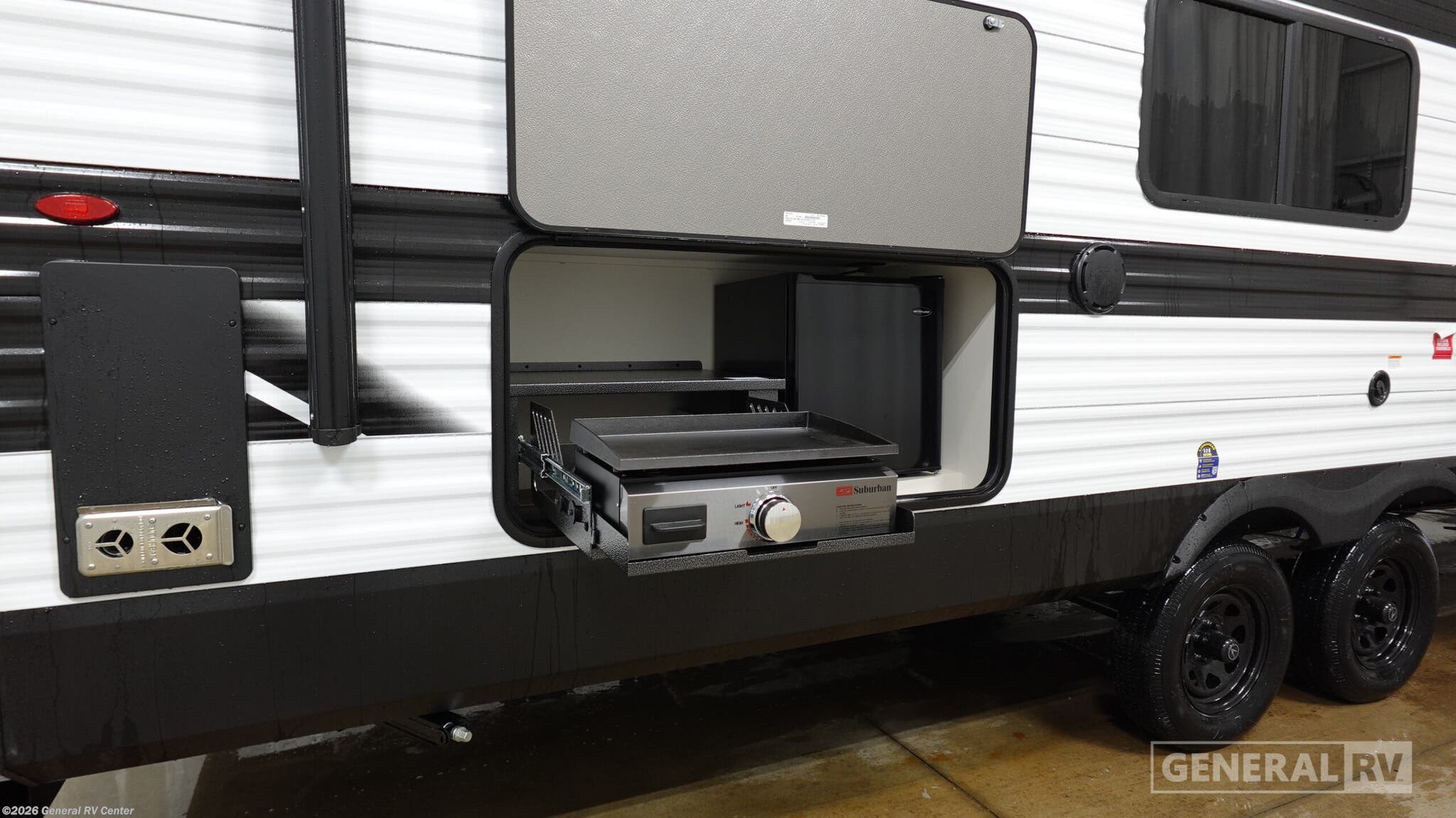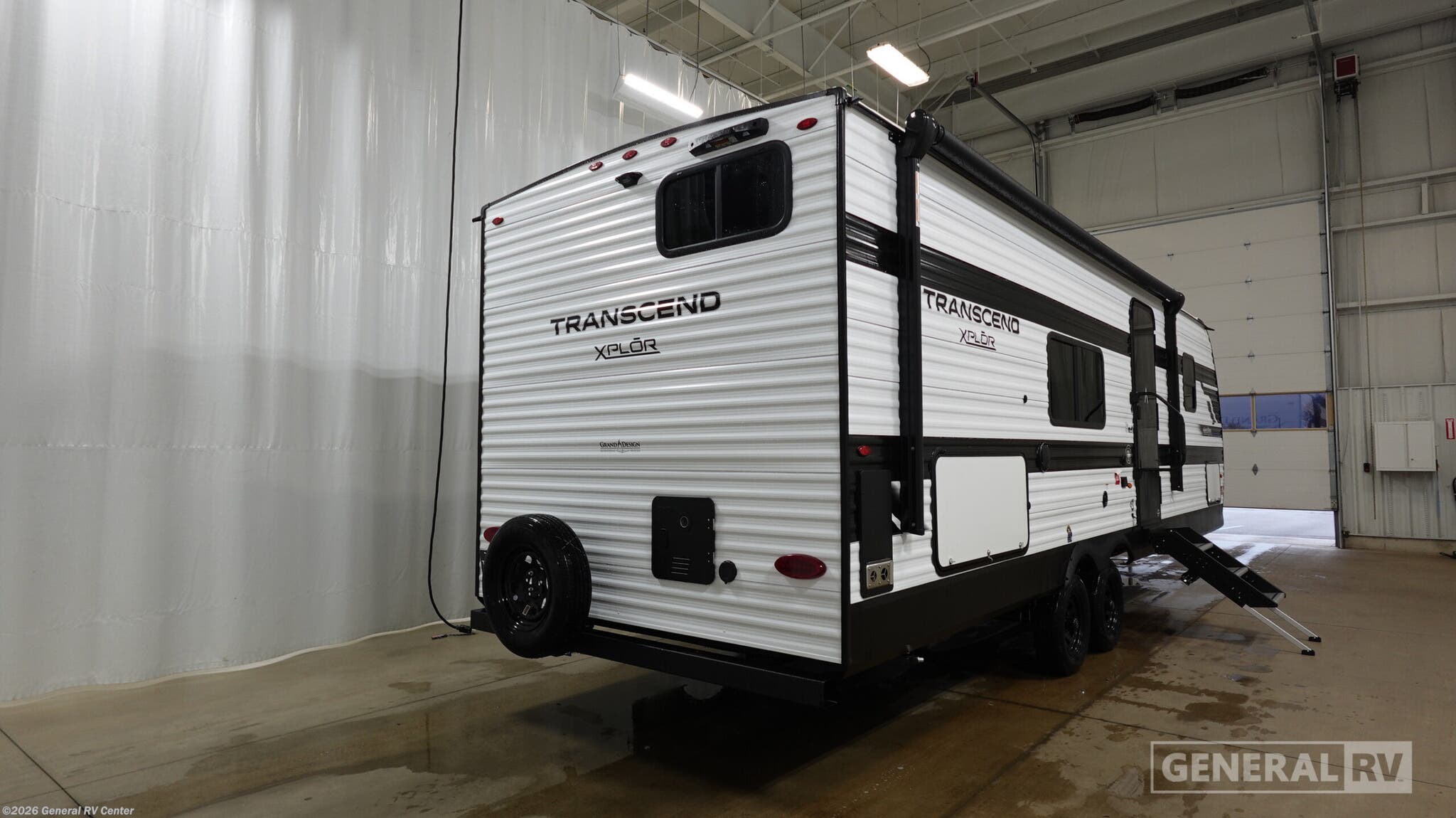 Grand Design Transcend Xplor travel trailer 26BHX highlights: Double-Size Bunk Beds with Curtains Booth Dinette Entry Counter with Shoe Storage Queen Bed 60" Roll Over Sofa Camping with your larger family or when you want to take along a few extra friends is easy with this trailer. This unit sleeps nine with the double-size bunks in the rear corner, the 60" roll over sofa, and the queen bed in the front semi-private bedroom. The booth dinette can also be used to sleep a guest or two little ones at night once converted. Prepare your meals on the three-burner cooktop indoors, or out on the two-burner cooktop at the outside kitchen! You'll also find a handy exterior spray port and an outdoor refrigerator for cold drinks! It will be so easy to fill the dog's food bowl with the added pet dish under the refrigerator, and the full bath in this model means you don't have to use the camp's facilities. Having a 17' awning outside along with a large unobstructed pass-through compartment allows you extended living outdoors and plenty of space for all of your gear! The customer-focused, quality-built Transcend Xplor travel trailers by Grand Design are your ticket to fun and adventure. You will appreciate the power tongue jack when it comes time to set up, as well as the all-in-one utility center and the detachable power cord with an LED light. These models include many outlets throughout, USB ports to charge your gadgets, and a JBL exterior speaker to listen to your favorite tunes. The interior of the Transcend Xplor will have you feeling right at home with upgraded residential furniture, residential countertops, residential cabinet doors, and the list goes on!