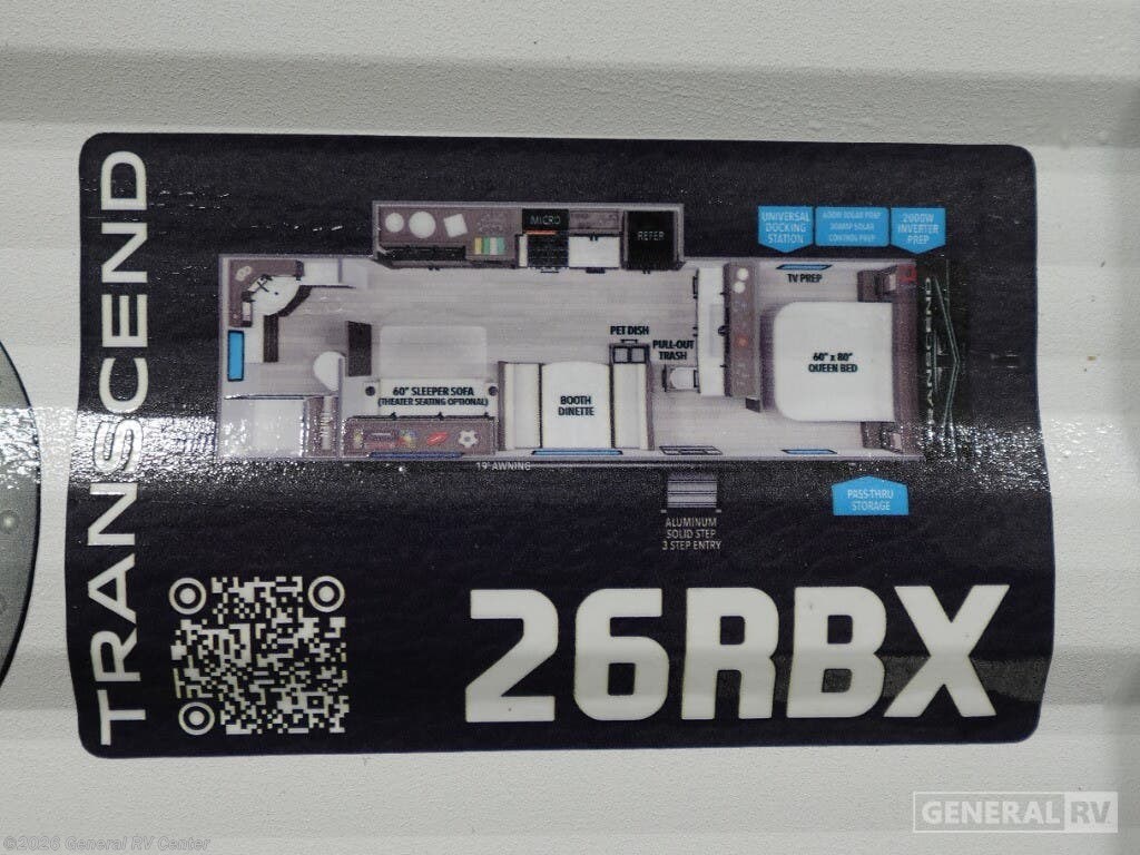 Experience the freedom of the open road with the 2025 Grand Design Transcend Xplor 26RBX. This travel trailer is designed to be your perfect home away from home, offering comfort and convenience for up to six travelers. With its thoughtfully crafted layout, you'll find a spacious center kitchen equipped with a three-burner cooktop and a full-size electric refrigerator, making meal preparation a breeze. The center living area features a cozy 60” sleeper sofa and a booth dinette, perfect for relaxing or entertaining guests. The front bedroom boasts a luxurious 60” x 80” queen bed, ensuring restful nights under the stars. Step outside and enjoy the great outdoors under the expansive 19 ft. powered retractable awning, perfect for shade on sunny days or shelter during a light rain. The rear bath provides ample space and privacy, complete with a stylish plastic and glass shower. With a robust fresh water capacity of 56 gallons and generous gray and black water tanks, your adventures can last longer without the need for frequent stops. The Transcend Xplor 26RBX is also equipped with a universal docking station and solar prep, making it ready for extended off-grid exploration. This RV is more than just a vehicle; it's a gateway to unforgettable memories. Whether you're embarking on a weekend getaway or a cross-country journey, the Transcend Xplor 26RBX combines functionality and style to enhance every moment on the road. For more details or to see it in person, visit your nearest General RV dealership.