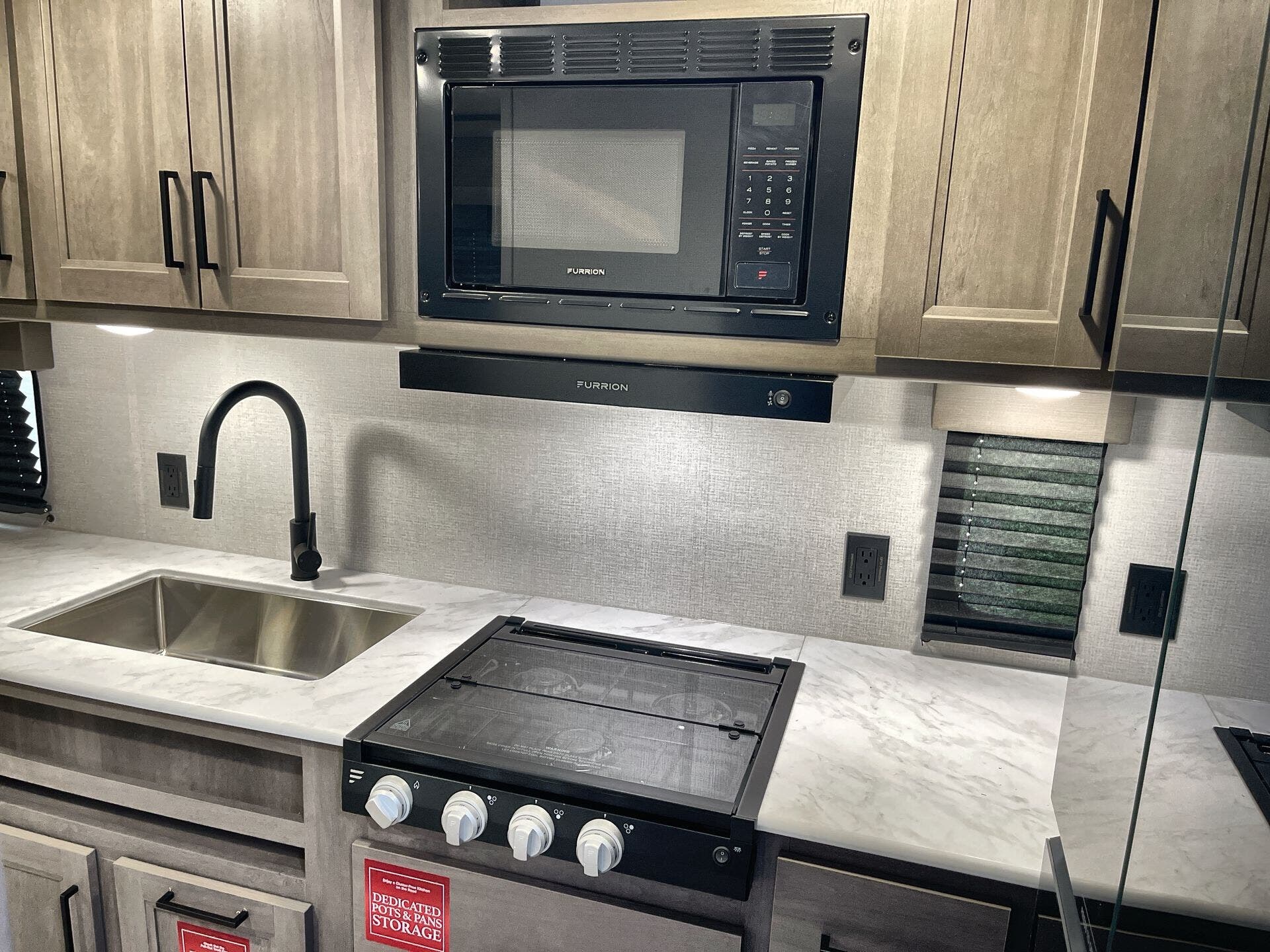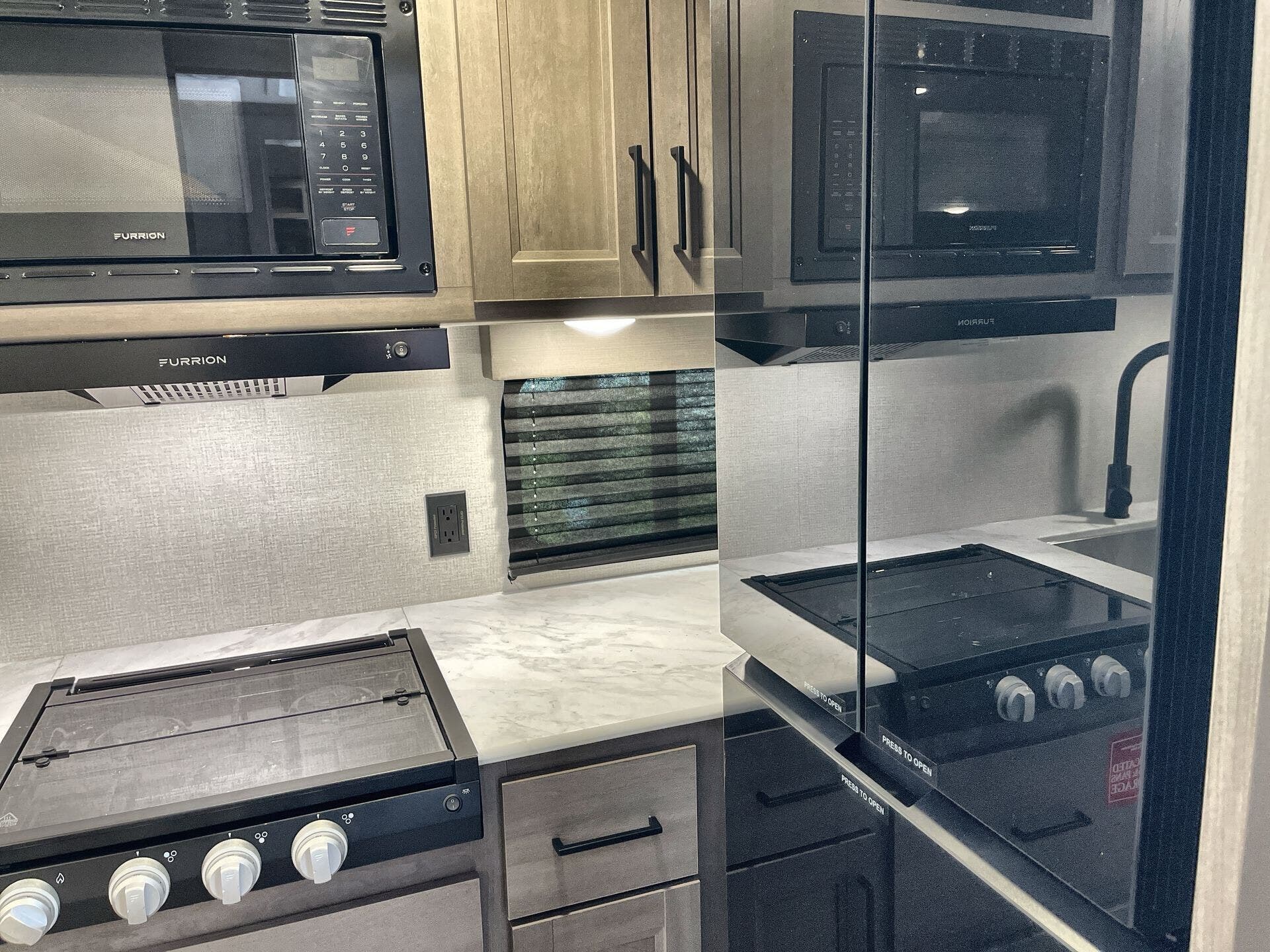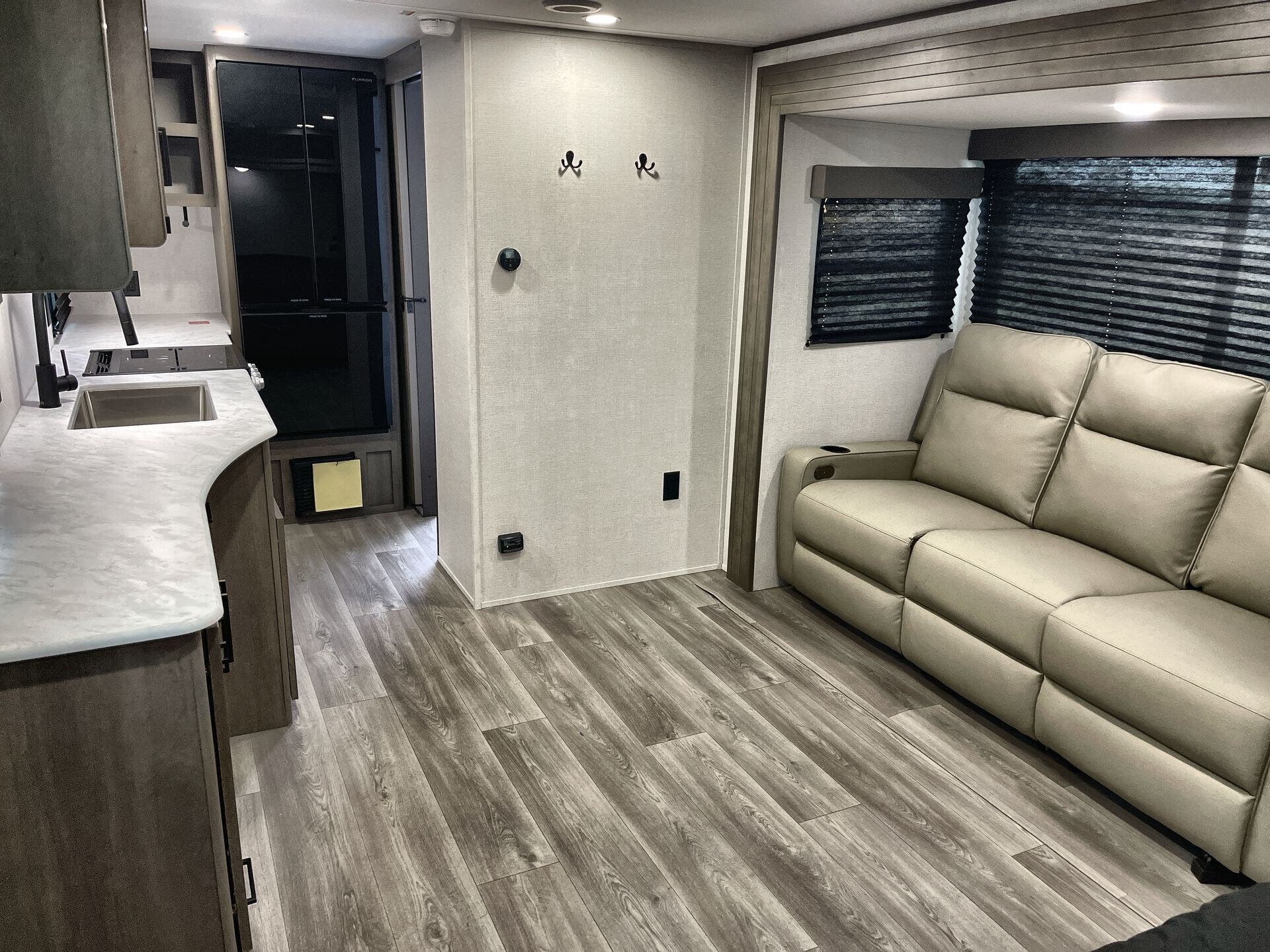 This travel trailer highlights a practical kitchen area with essential appliances, including a microwave, refrigerator, and a stove top burner. The kitchen features a sink, overhead cabinetry, and a medicine cabinet, providing ample storage and functionality. The living space is complete with theater seating and a TV antenna, perfect for relaxing after a day of exploration.