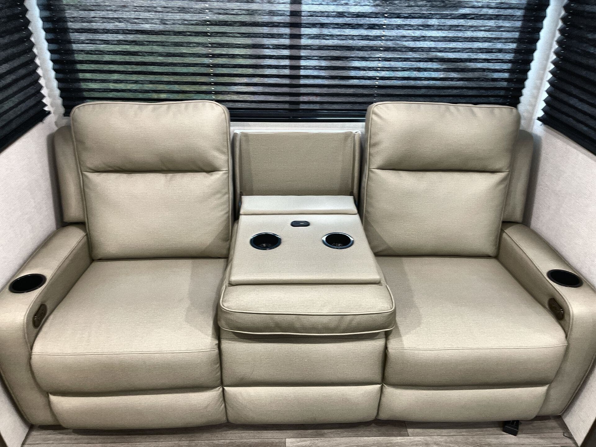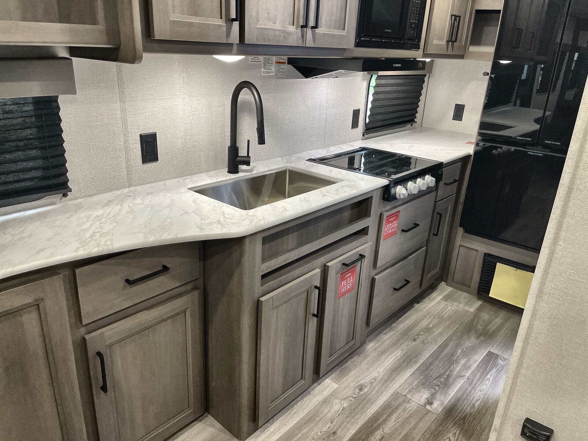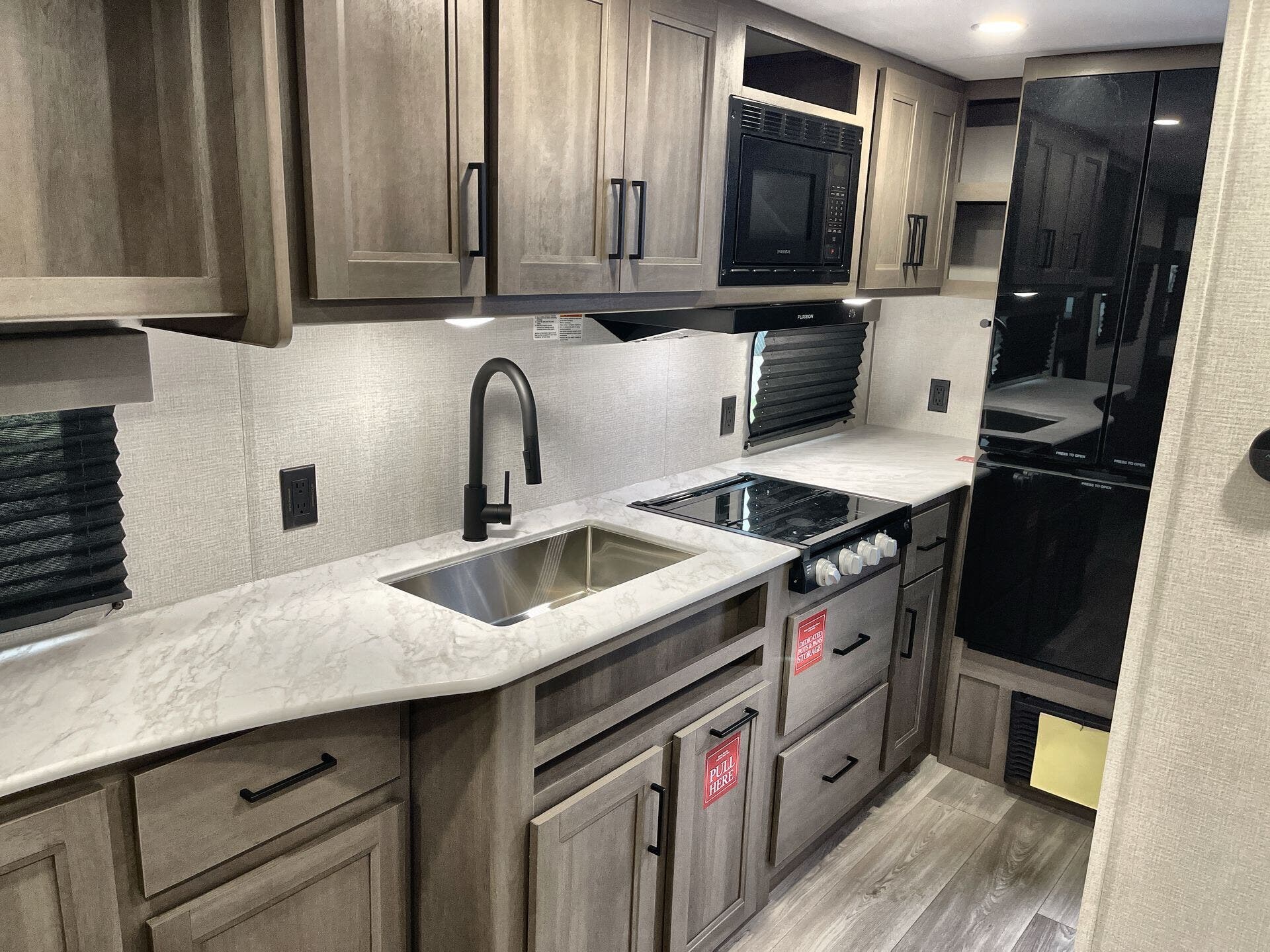 This travel trailer highlights a practical kitchen area with essential appliances, including a microwave, refrigerator, and a stove top burner. The kitchen features a sink, overhead cabinetry, and a medicine cabinet, providing ample storage and functionality. The living space is complete with theater seating and a TV antenna, perfect for relaxing after a day of exploration.