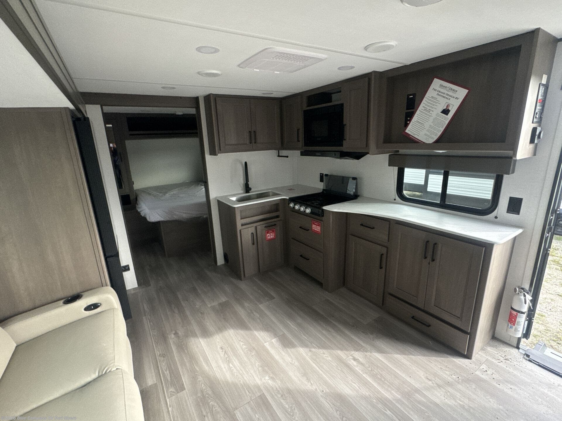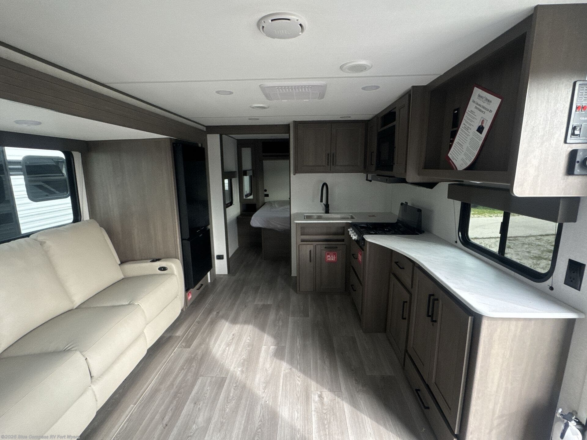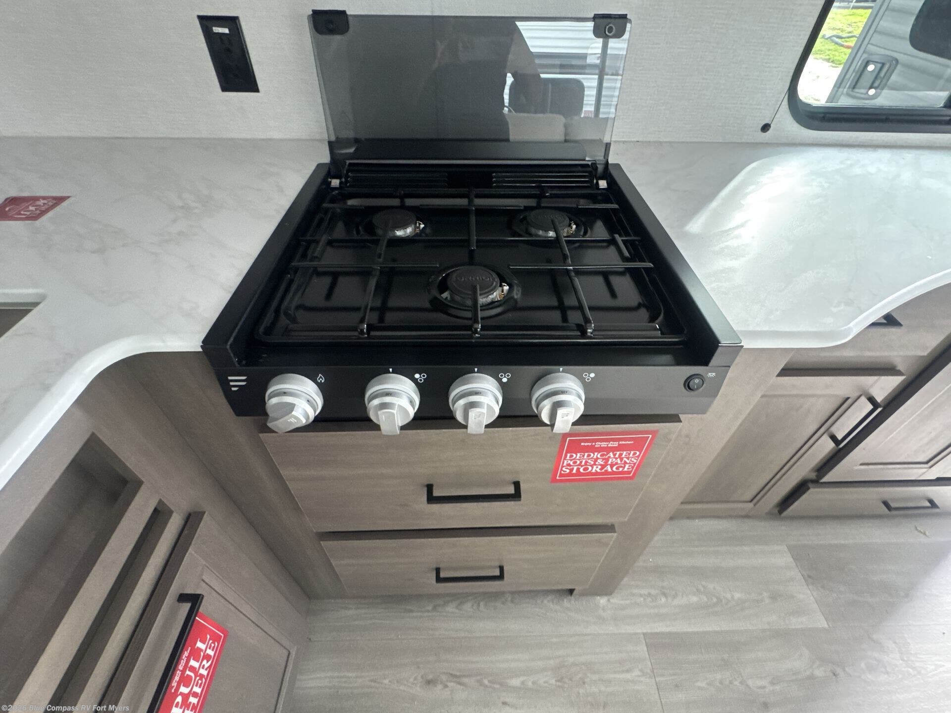 Pack your bags and head for the campground in this spacious travel trailer! Once you arrive, you can unload the pass-thru storage, then make lunch on the exterior griddle with a 1.7 cu. ft. exterior refrigerator. The U-shaped dinette slide will provide a place to dine if you decide not to stay outside under the 16' power awning. Optional theater seats can be chosen in place of the dinette for even more comfort! You'll sleep soundly on the queen bed in the front bedroom, and the full rear bath lets you freshen up each day.