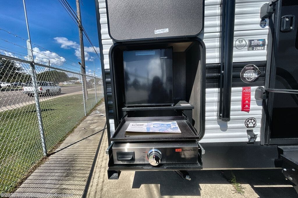 Pack your bags and head for the campground in this spacious travel trailer! Once you arrive, you can unload the pass-thru storage, then make lunch on the exterior griddle with a 1.7 cu. ft. exterior refrigerator. The U-shaped dinette slide will provide a place to dine if you decide not to stay outside under the 16' power awning. Optional theater seats can be chosen in place of the dinette for even more comfort! You'll sleep soundly on the queen bed in the front bedroom, and the full rear bath lets you freshen up each day.