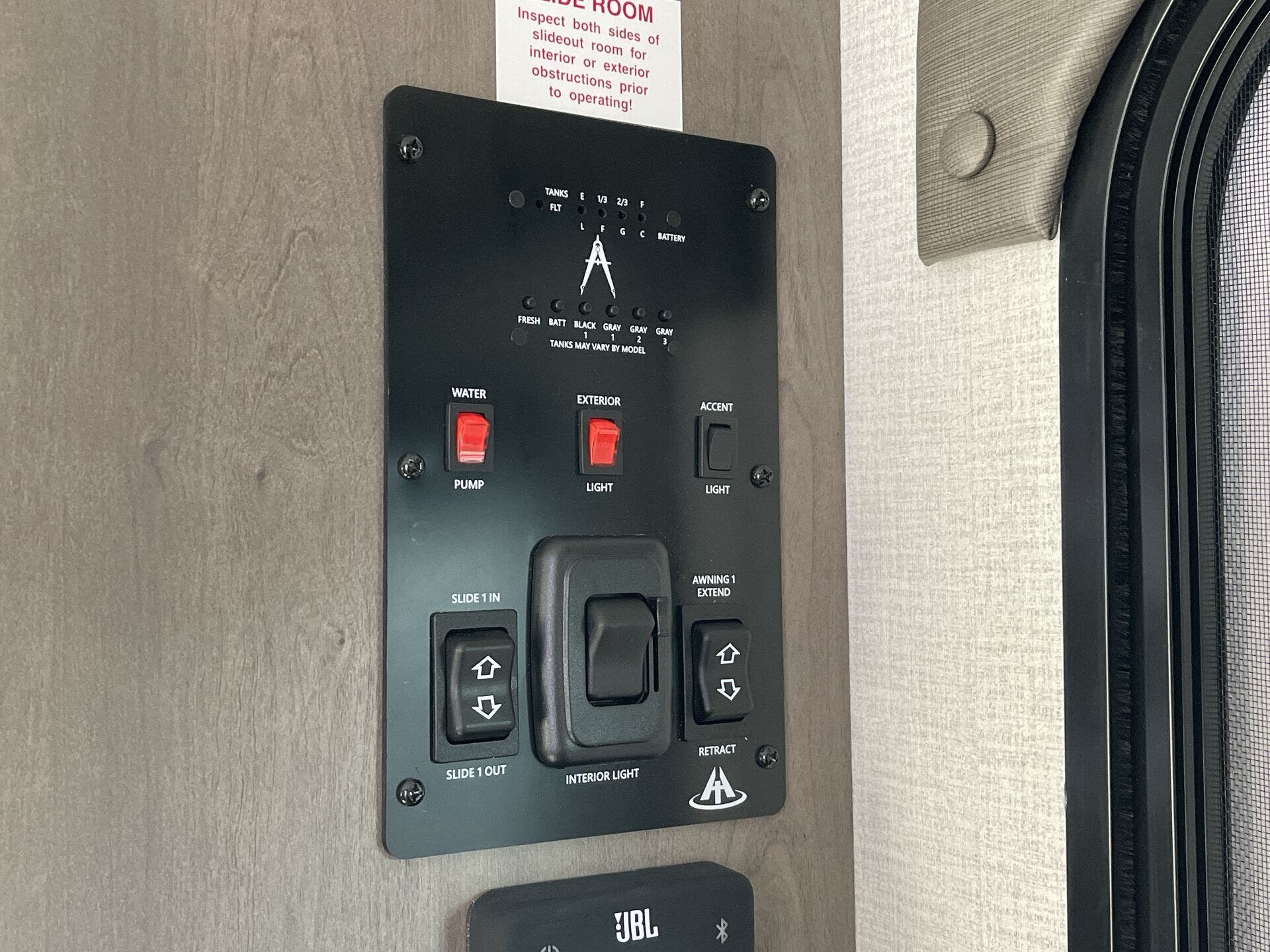 Awning, Hitch, Leveling Jacks, Pass Thru Storage, Power Roof Vent, Roof Vent, Screen Door, Slideout, Spare Tire Kit -