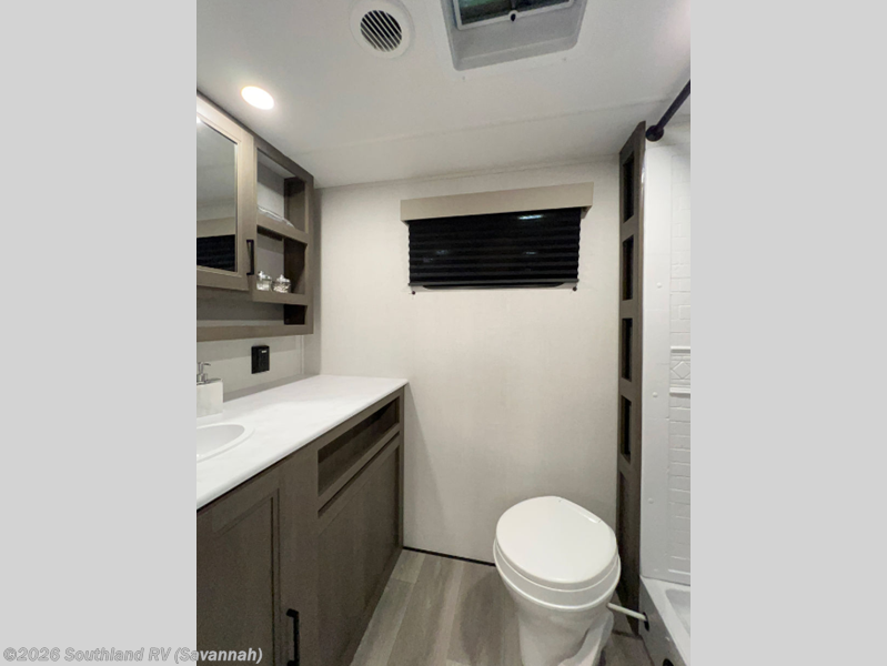 Pack your bags and head for the campground in this spacious travel trailer! Once you arrive, you can unload the pass-thru storage, then make lunch on the exterior griddle with a 1.7 cu. ft. exterior refrigerator. The U-shaped dinette slide will provide a place to dine if you decide not to stay outside under the 16' power awning. Optional theater seats can be chosen in place of the dinette for even more comfort! You'll sleep soundly on the queen bed in the front bedroom, and the full rear bath lets you freshen up each day.