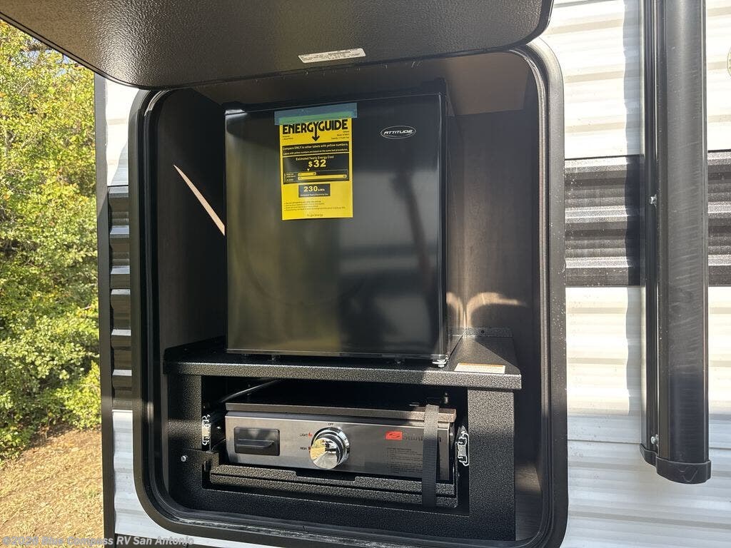Pack your bags and head for the campground in this spacious travel trailer! Once you arrive, you can unload the pass-thru storage, then make lunch on the exterior griddle with a 1.7 cu. ft. exterior refrigerator. The U-shaped dinette slide will provide a place to dine if you decide not to stay outside under the 16' power awning. Optional theater seats can be chosen in place of the dinette for even more comfort! You'll sleep soundly on the queen bed in the front bedroom, and the full rear bath lets you freshen up each day.