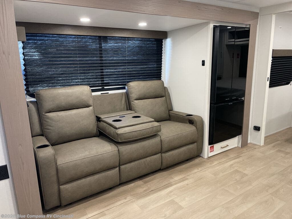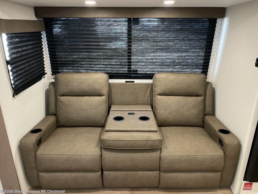 Pack your bags and head for the campground in this spacious travel trailer! Once you arrive, you can unload the pass-thru storage, then make lunch on the exterior griddle with a 1.7 cu. ft. exterior refrigerator. The U-shaped dinette slide will provide a place to dine if you decide not to stay outside under the 16' power awning. Optional theater seats can be chosen in place of the dinette for even more comfort! You'll sleep soundly on the queen bed in the front bedroom, and the full rear bath lets you freshen up each day.
