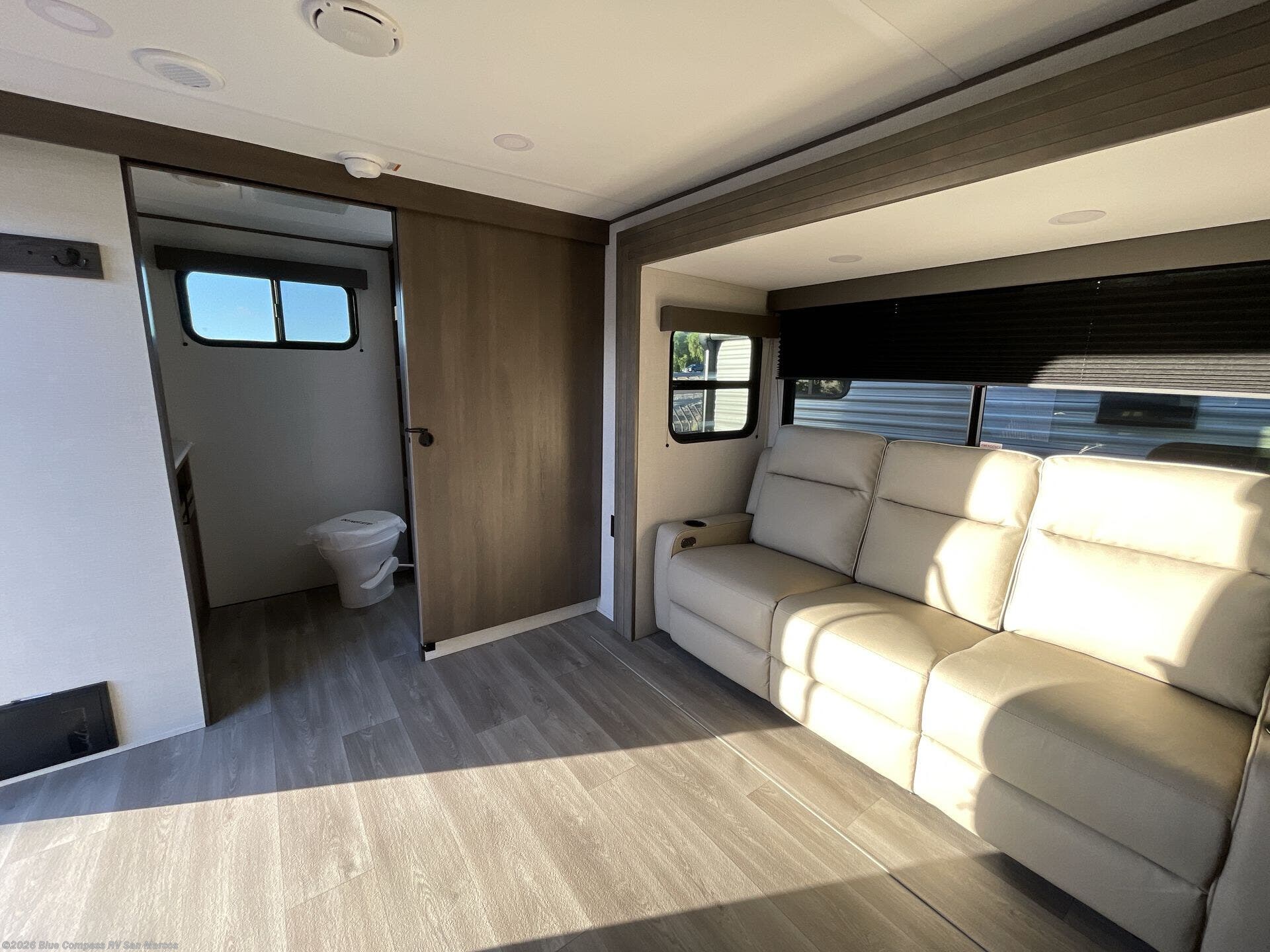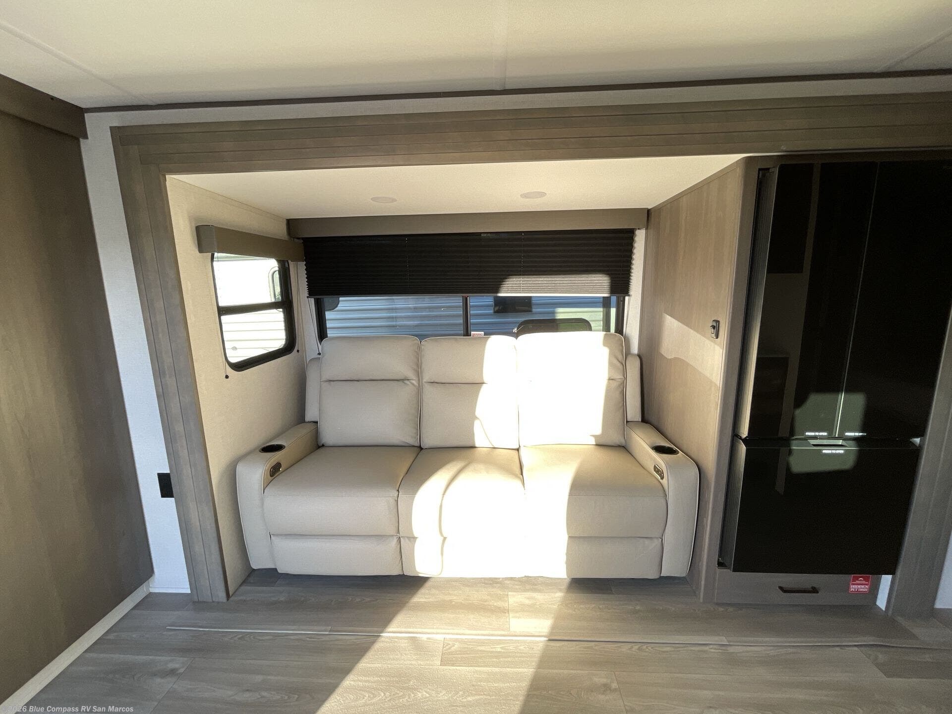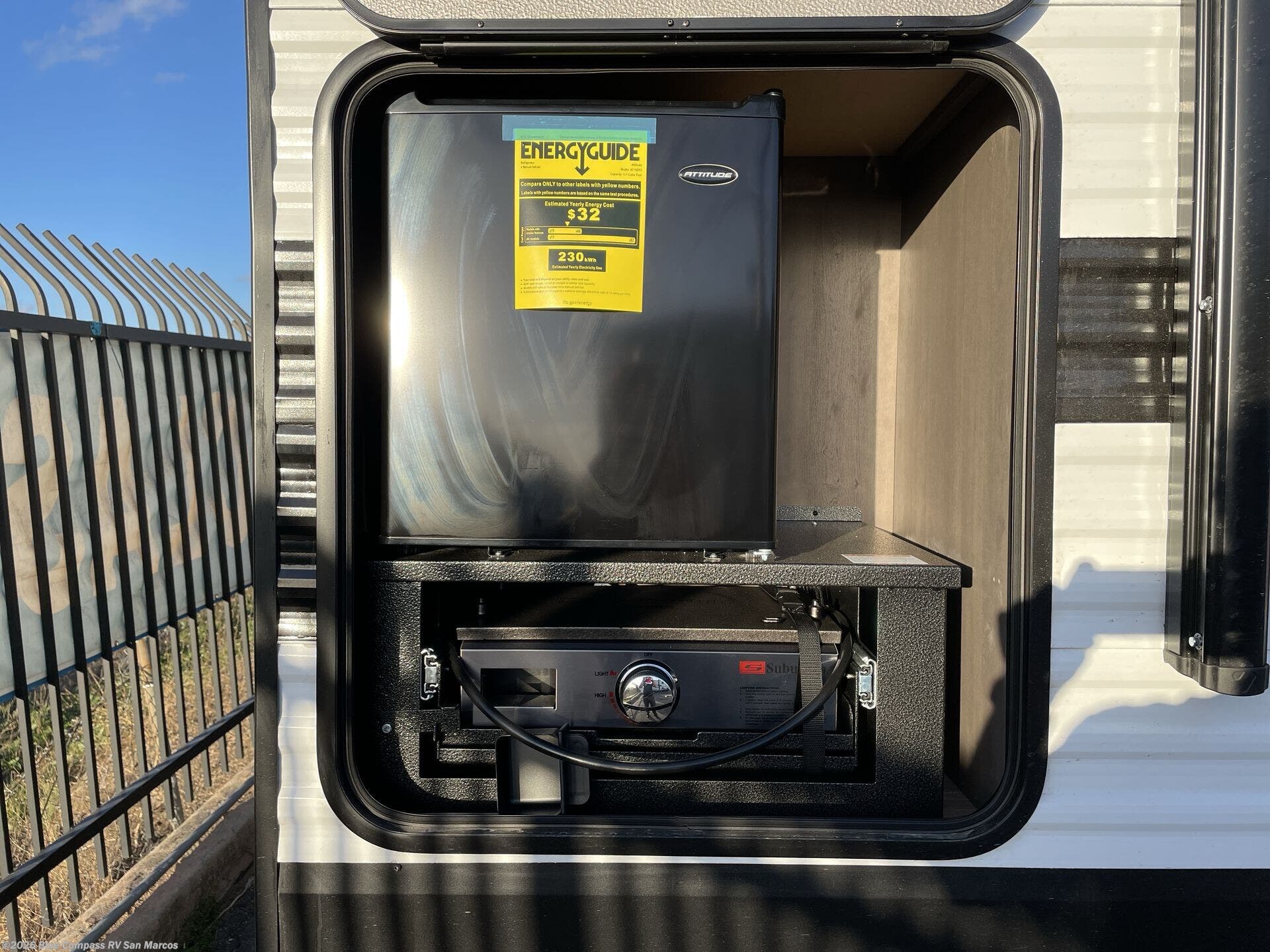 Pack your bags and head for the campground in this spacious travel trailer! Once you arrive, you can unload the pass-thru storage, then make lunch on the exterior griddle with a 1.7 cu. ft. exterior refrigerator. The U-shaped dinette slide will provide a place to dine if you decide not to stay outside under the 16' power awning. Optional theater seats can be chosen in place of the dinette for even more comfort! You'll sleep soundly on the queen bed in the front bedroom, and the full rear bath lets you freshen up each day.