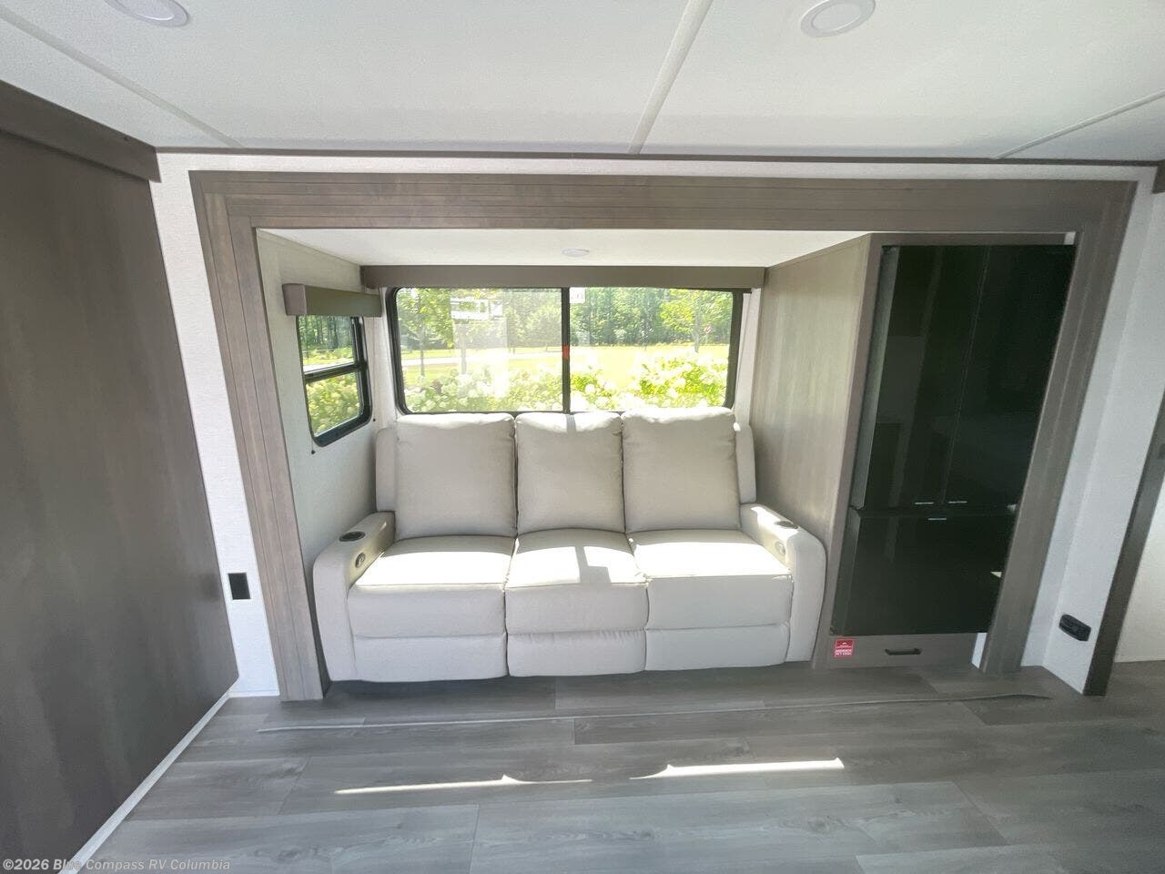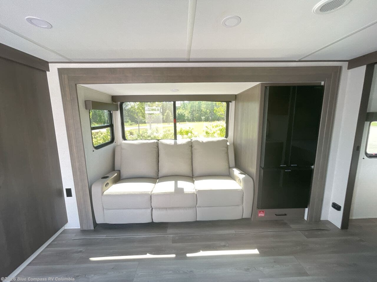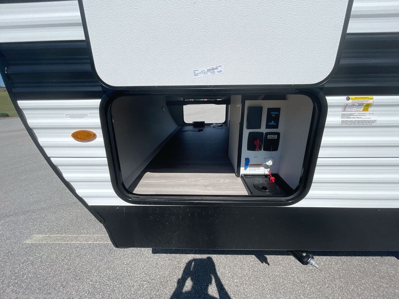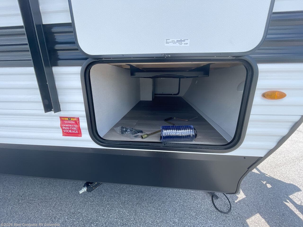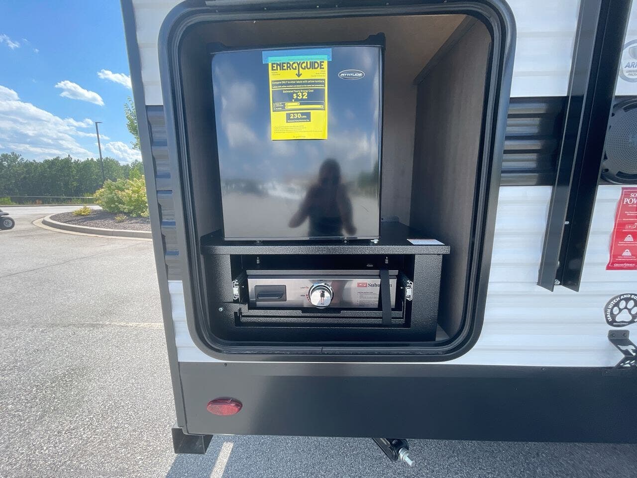 Pack your bags and head for the campground in this spacious travel trailer! Once you arrive, you can unload the pass-thru storage, then make lunch on the exterior griddle with a 1.7 cu. ft. exterior refrigerator. The U-shaped dinette slide will provide a place to dine if you decide not to stay outside under the 16' power awning. Optional theater seats can be chosen in place of the dinette for even more comfort! You'll sleep soundly on the queen bed in the front bedroom, and the full rear bath lets you freshen up each day.