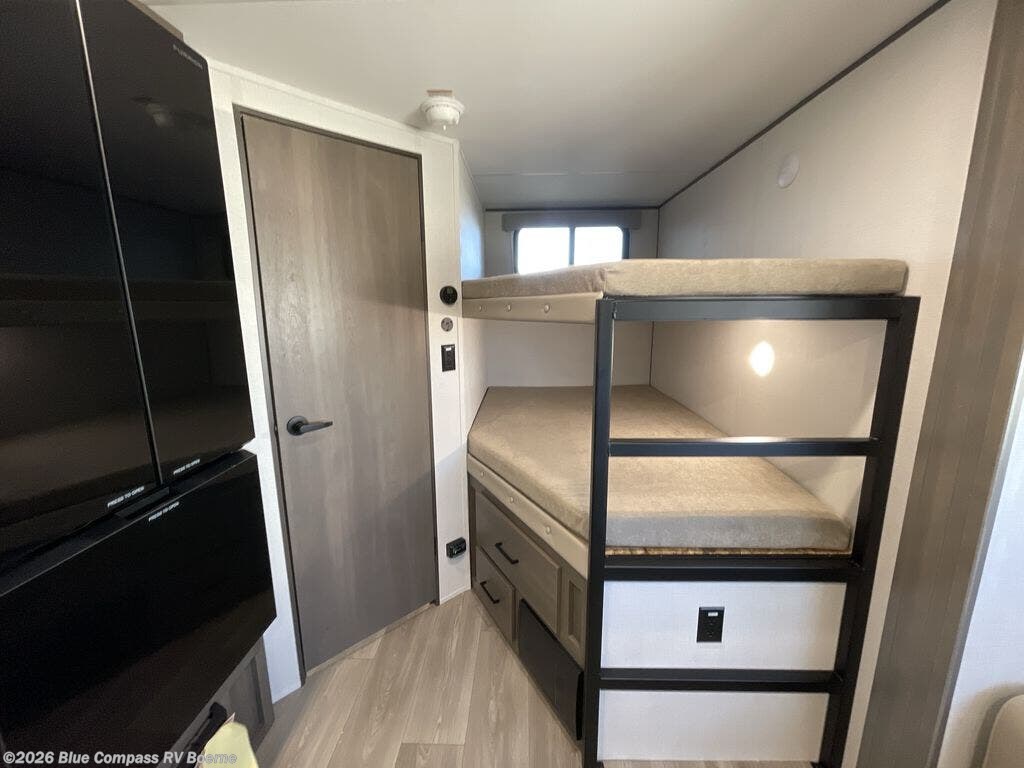 This fantastic travel trailer is designed to provide the ultimate in comfort, convenience, and adventure! The double-size bunk beds are perfect for kids, providing ample sleeping space and an under-bed storage space for all your belongings. The full bathroom features a linen closet, providing convenient storage for towels and toiletries. In the kitchen area, the U-shaped dinette is a great spot for creating memories that will last a lifetime, the refrigerator keeps your food and drinks fresh, while the microwave provides a quick and easy way to prepare meals. And for major convenience, the pull-out trash makes cleaning up a simple task. Take a nap in the comfortable front queen bed, which is a serene retreat, providing a comfortable spot to rest and relax. Jump to the exterior in a comfortable way with the double entry/exit door providing added convenience and flexibility, while the exterior awning provides shade and protection from the elements. The pass-through storage offers ample space for your outdoor gear and equipment.