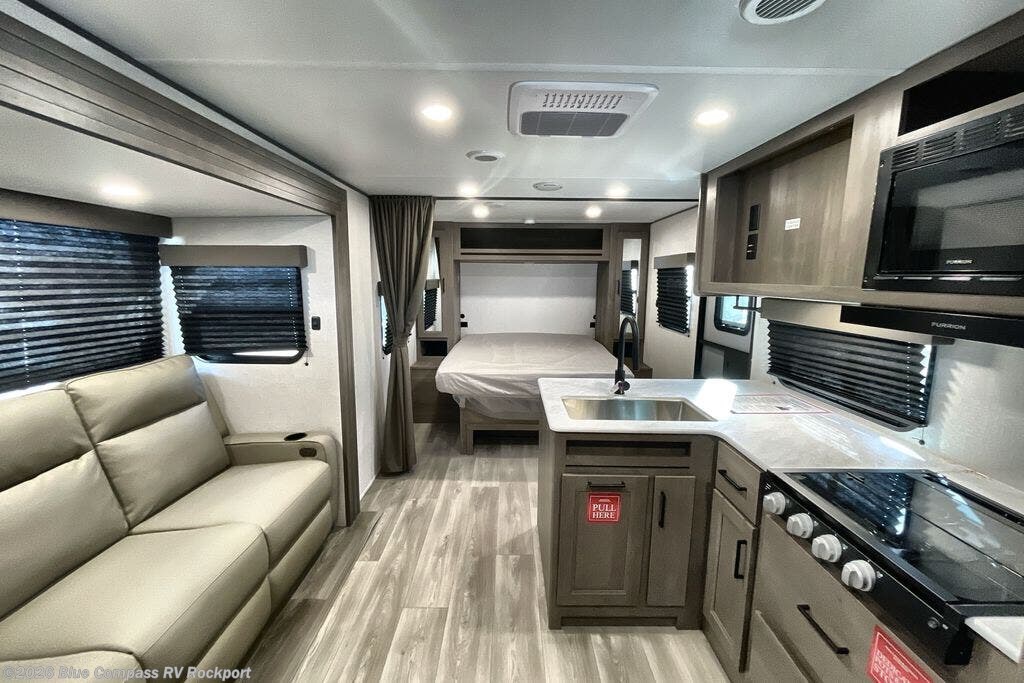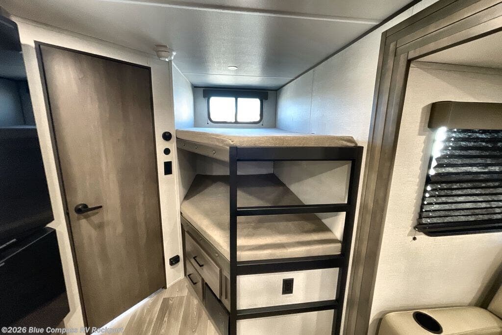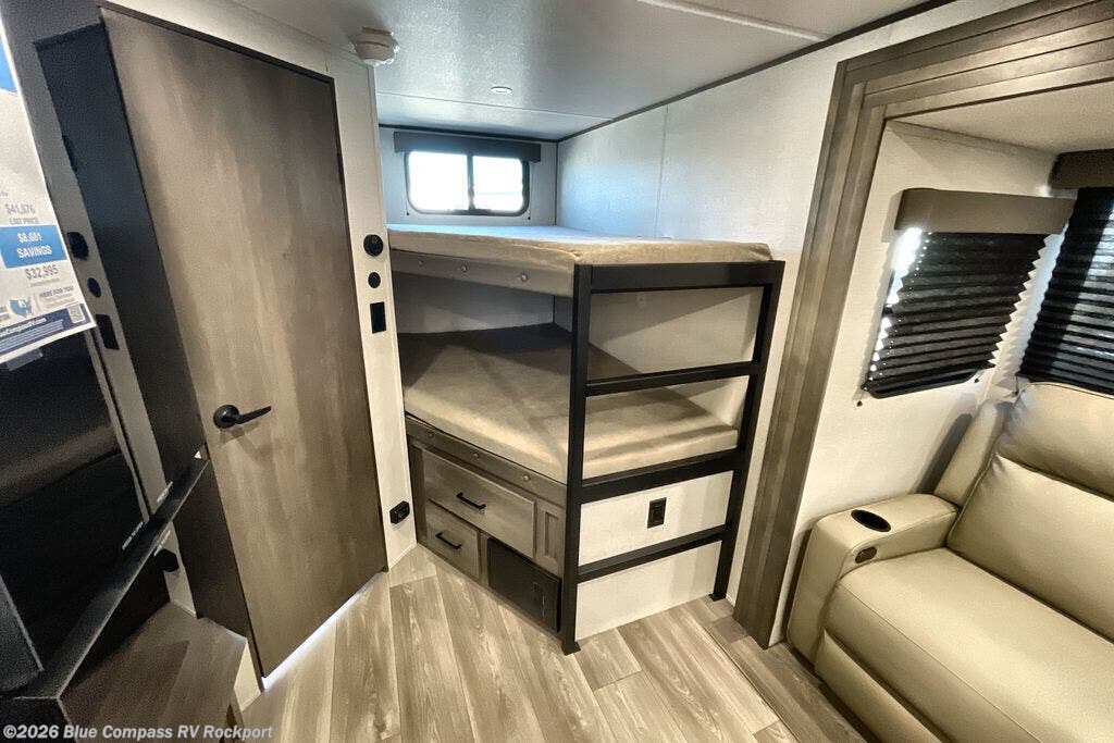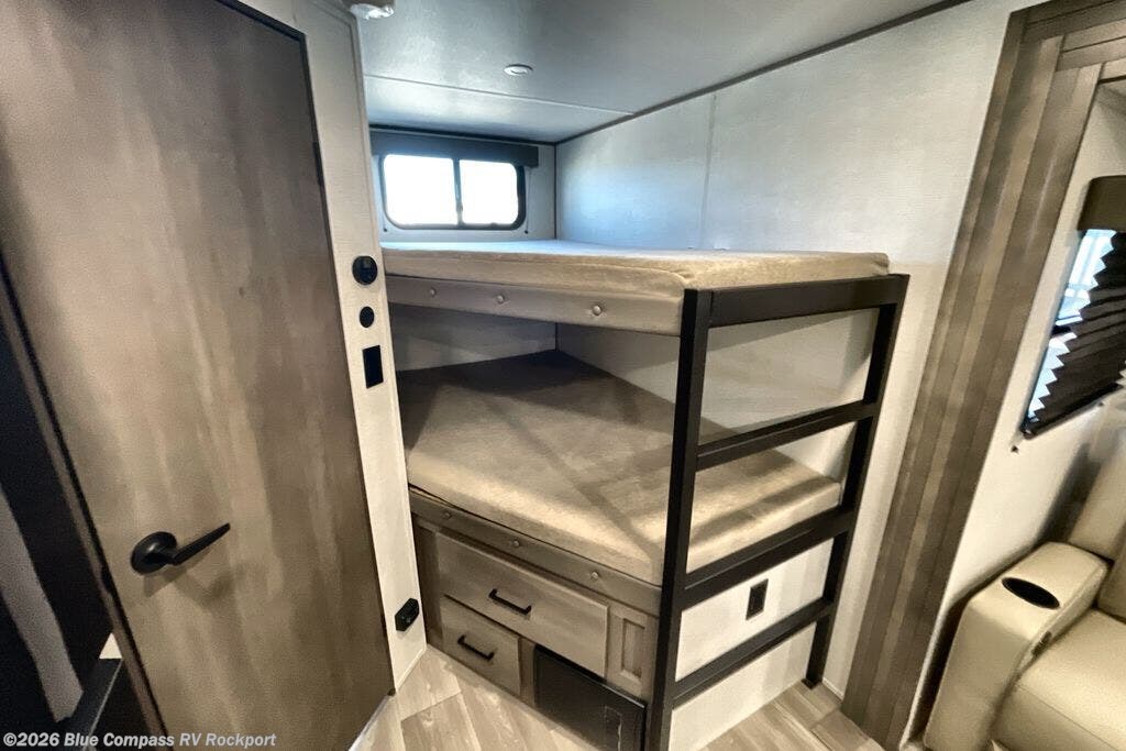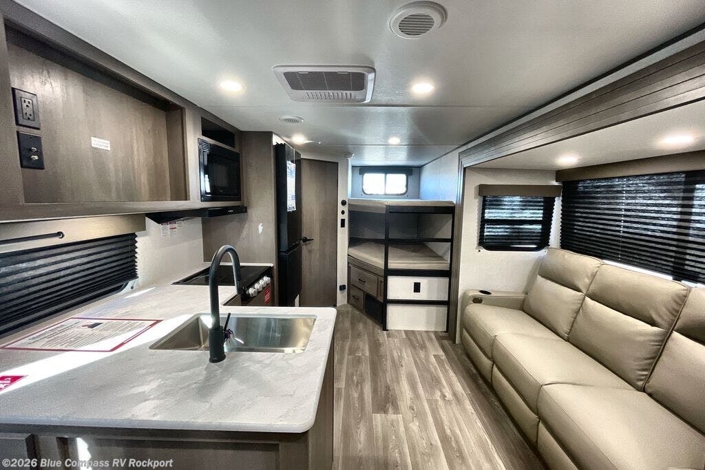 This fantastic travel trailer is designed to provide the ultimate in comfort, convenience, and adventure! The double-size bunk beds are perfect for kids, providing ample sleeping space and an under-bed storage space for all your belongings. The full bathroom features a linen closet, providing convenient storage for towels and toiletries. In the kitchen area, the U-shaped dinette is a great spot for creating memories that will last a lifetime, the refrigerator keeps your food and drinks fresh, while the microwave provides a quick and easy way to prepare meals. And for major convenience, the pull-out trash makes cleaning up a simple task. Take a nap in the comfortable front queen bed, which is a serene retreat, providing a comfortable spot to rest and relax. Jump to the exterior in a comfortable way with the double entry/exit door providing added convenience and flexibility, while the exterior awning provides shade and protection from the elements. The pass-through storage offers ample space for your outdoor gear and equipment.