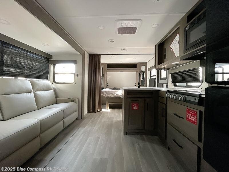 This fantastic travel trailer is designed to provide the ultimate in comfort, convenience, and adventure! The double-size bunk beds are perfect for kids, providing ample sleeping space and an under-bed storage space for all your belongings. The full bathroom features a linen closet, providing convenient storage for towels and toiletries. In the kitchen area, the U-shaped dinette is a great spot for creating memories that will last a lifetime, the refrigerator keeps your food and drinks fresh, while the microwave provides a quick and easy way to prepare meals. And for major convenience, the pull-out trash makes cleaning up a simple task. Take a nap in the comfortable front queen bed, which is a serene retreat, providing a comfortable spot to rest and relax. Jump to the exterior in a comfortable way with the double entry/exit door providing added convenience and flexibility, while the exterior awning provides shade and protection from the elements. The pass-through storage offers ample space for your outdoor gear and equipment.