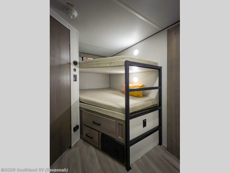 This fantastic travel trailer is designed to provide the ultimate in comfort, convenience, and adventure! The double-size bunk beds are perfect for kids, providing ample sleeping space and an under-bed storage space for all your belongings. The full bathroom features a linen closet, providing convenient storage for towels and toiletries. In the kitchen area, the U-shaped dinette is a great spot for creating memories that will last a lifetime, the refrigerator keeps your food and drinks fresh, while the microwave provides a quick and easy way to prepare meals. And for major convenience, the pull-out trash makes cleaning up a simple task. Take a nap in the comfortable front queen bed, which is a serene retreat, providing a comfortable spot to rest and relax. Jump to the exterior in a comfortable way with the double entry/exit door providing added convenience and flexibility, while the exterior awning provides shade and protection from the elements. The pass-through storage offers ample space for your outdoor gear and equipment.