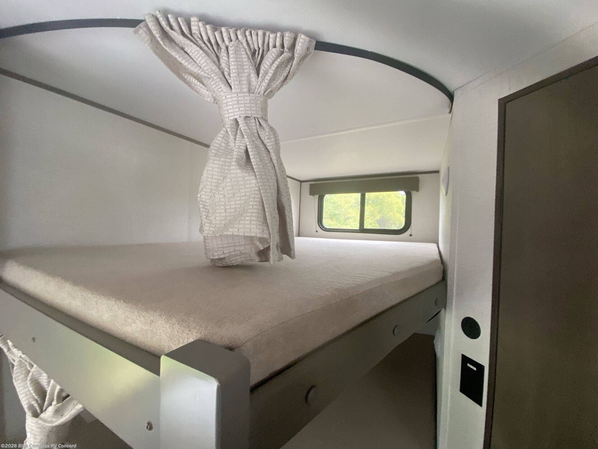 This is the perfect travel trailer if you like to camp with friends and family. Since there are double-size bunks, a queen bed in the front bedroom, plus a booth dinette and sofa, you can sleep eight campers each night! The three burner range and microwave in the kitchen will let you cook meals each day, and the 12V refrigerator will keep your cold items fresh. This model also includes a counter with extra storage underneath, a pull-out trash can storage for convenience, and a full bath to freshen up in each day. And you'll love having your own space in the front bedroom with a privacy curtain, dual wardrobes, and TV prep if you want to add a television!