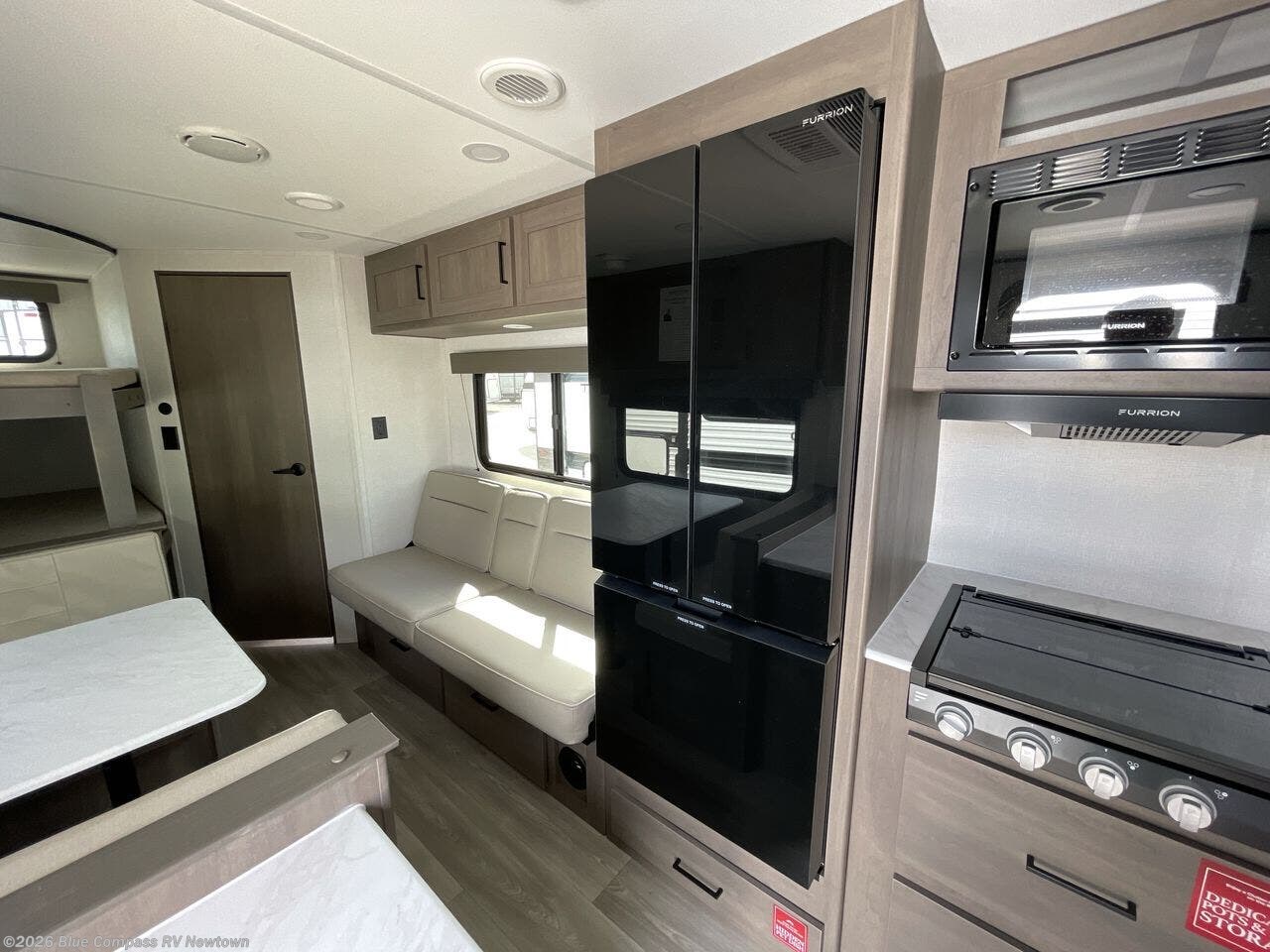 This is the perfect travel trailer if you like to camp with friends and family. Since there are double-size bunks, a queen bed in the front bedroom, plus a booth dinette and sofa, you can sleep eight campers each night! The three burner range and microwave in the kitchen will let you cook meals each day, and the 12V refrigerator will keep your cold items fresh. This model also includes a counter with extra storage underneath, a pull-out trash can storage for convenience, and a full bath to freshen up in each day. And you'll love having your own space in the front bedroom with a privacy curtain, dual wardrobes, and TV prep if you want to add a television!