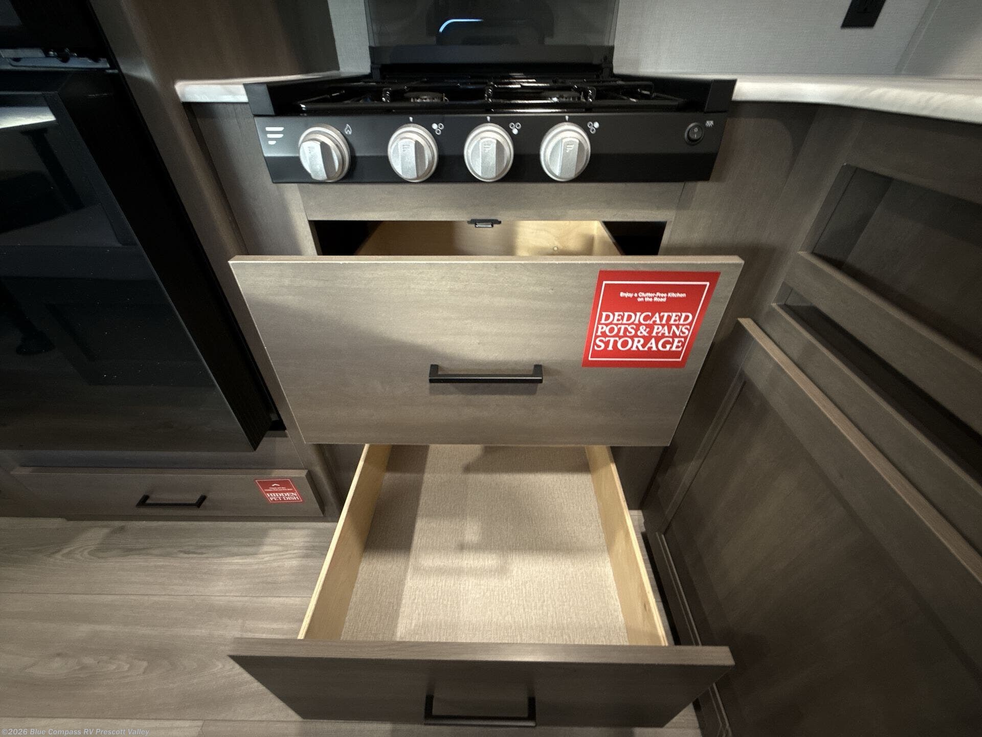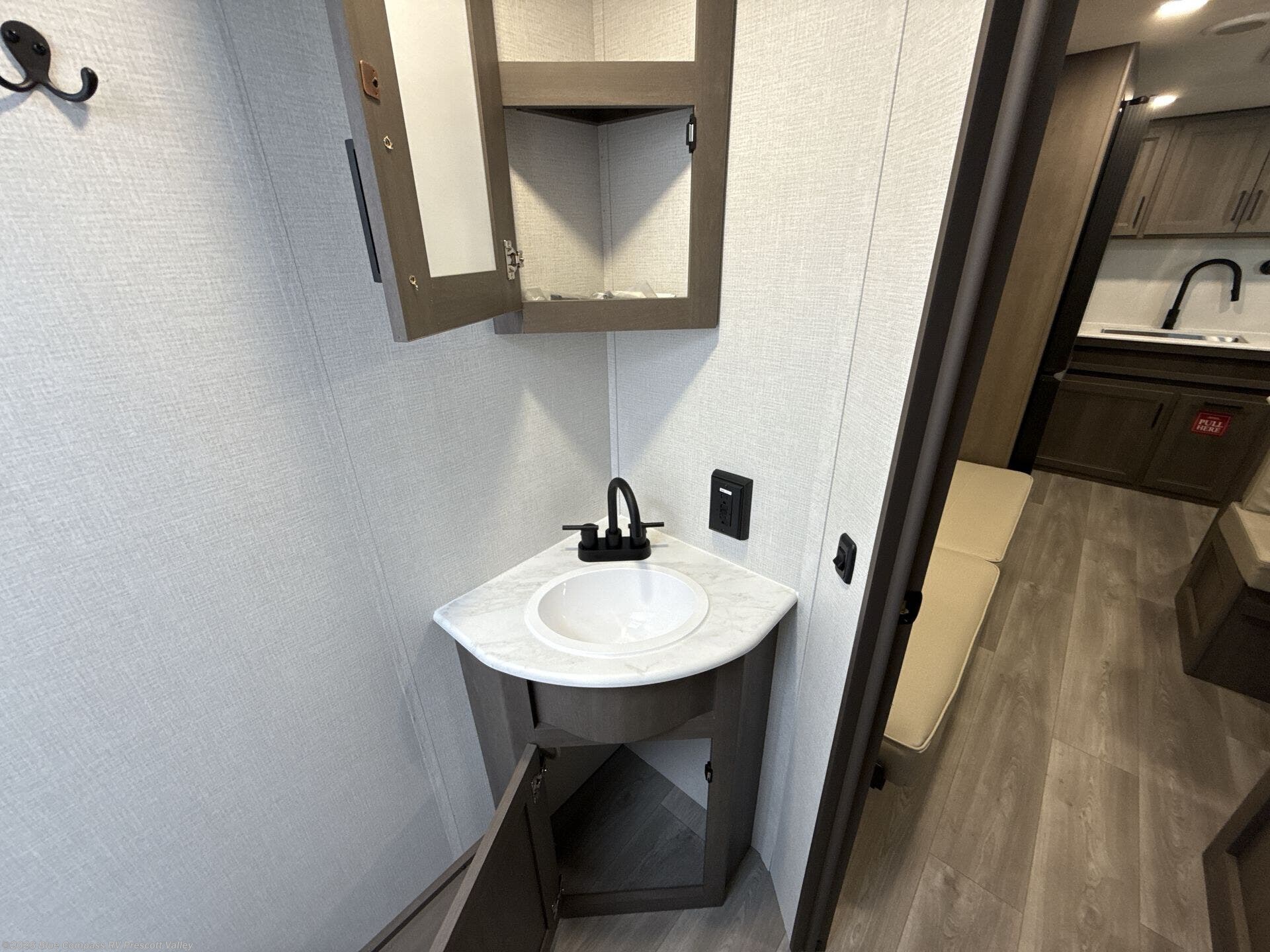This is the perfect travel trailer if you like to camp with friends and family. Since there are double-size bunks, a queen bed in the front bedroom, plus a booth dinette and sofa, you can sleep eight campers each night! The three burner range and microwave in the kitchen will let you cook meals each day, and the 12V refrigerator will keep your cold items fresh. This model also includes a counter with extra storage underneath, a pull-out trash can storage for convenience, and a full bath to freshen up in each day. And you'll love having your own space in the front bedroom with a privacy curtain, dual wardrobes, and TV prep if you want to add a television!