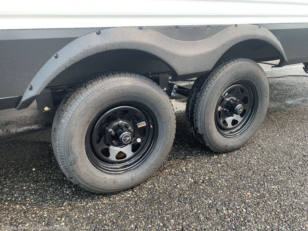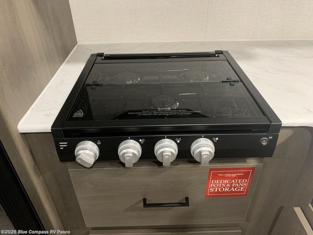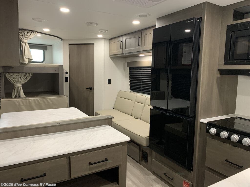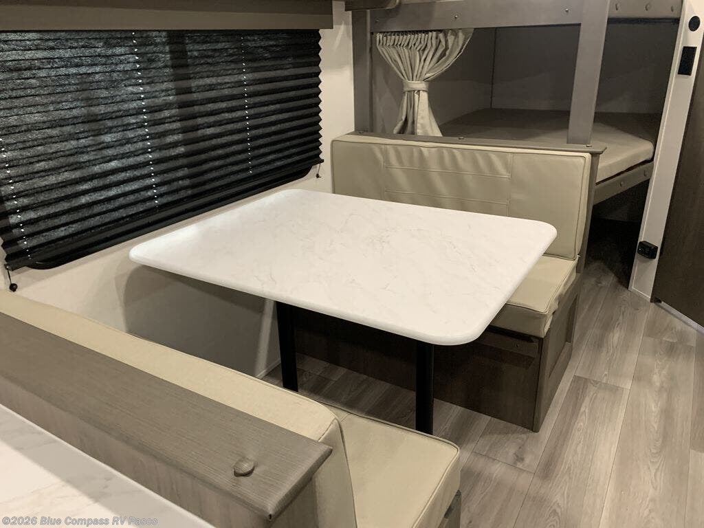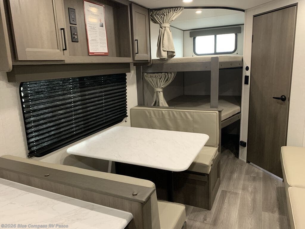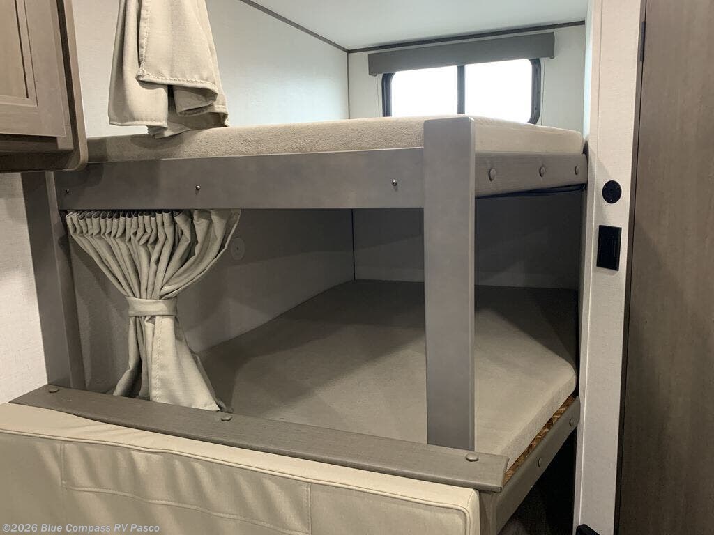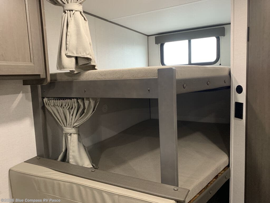 This is the perfect travel trailer if you like to camp with friends and family. Since there are double-size bunks, a queen bed in the front bedroom, plus a booth dinette and sofa, you can sleep eight campers each night! The three burner range and microwave in the kitchen will let you cook meals each day, and the 12V refrigerator will keep your cold items fresh. This model also includes a counter with extra storage underneath, a pull-out trash can storage for convenience, and a full bath to freshen up in each day. And you'll love having your own space in the front bedroom with a privacy curtain, dual wardrobes, and TV prep if you want to add a television!