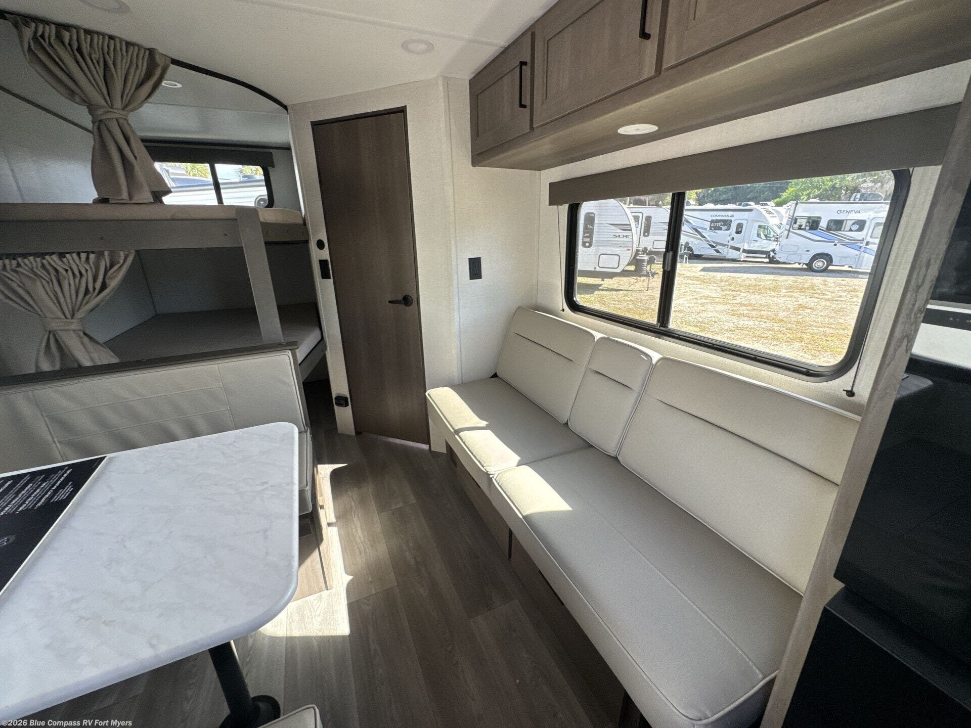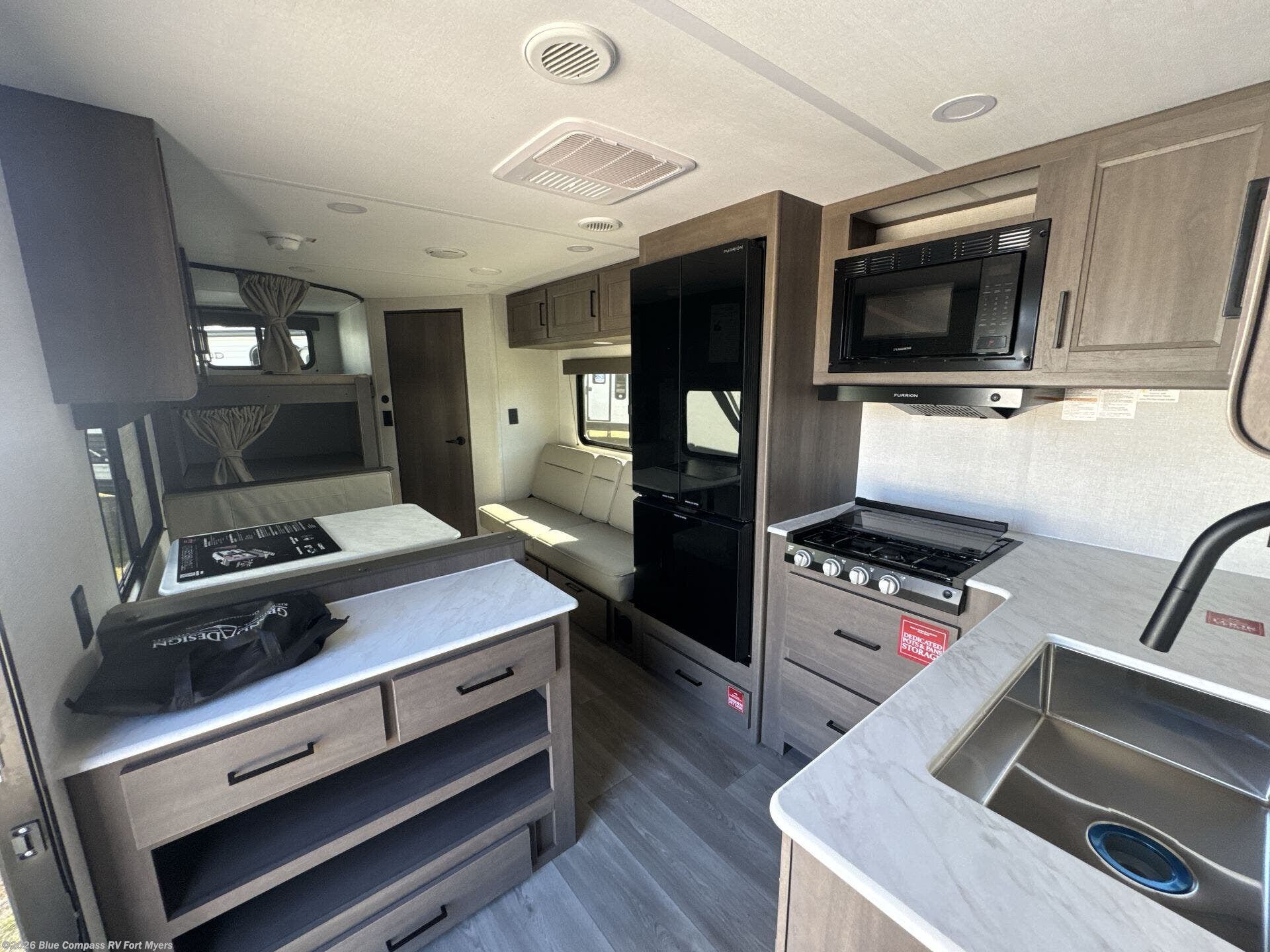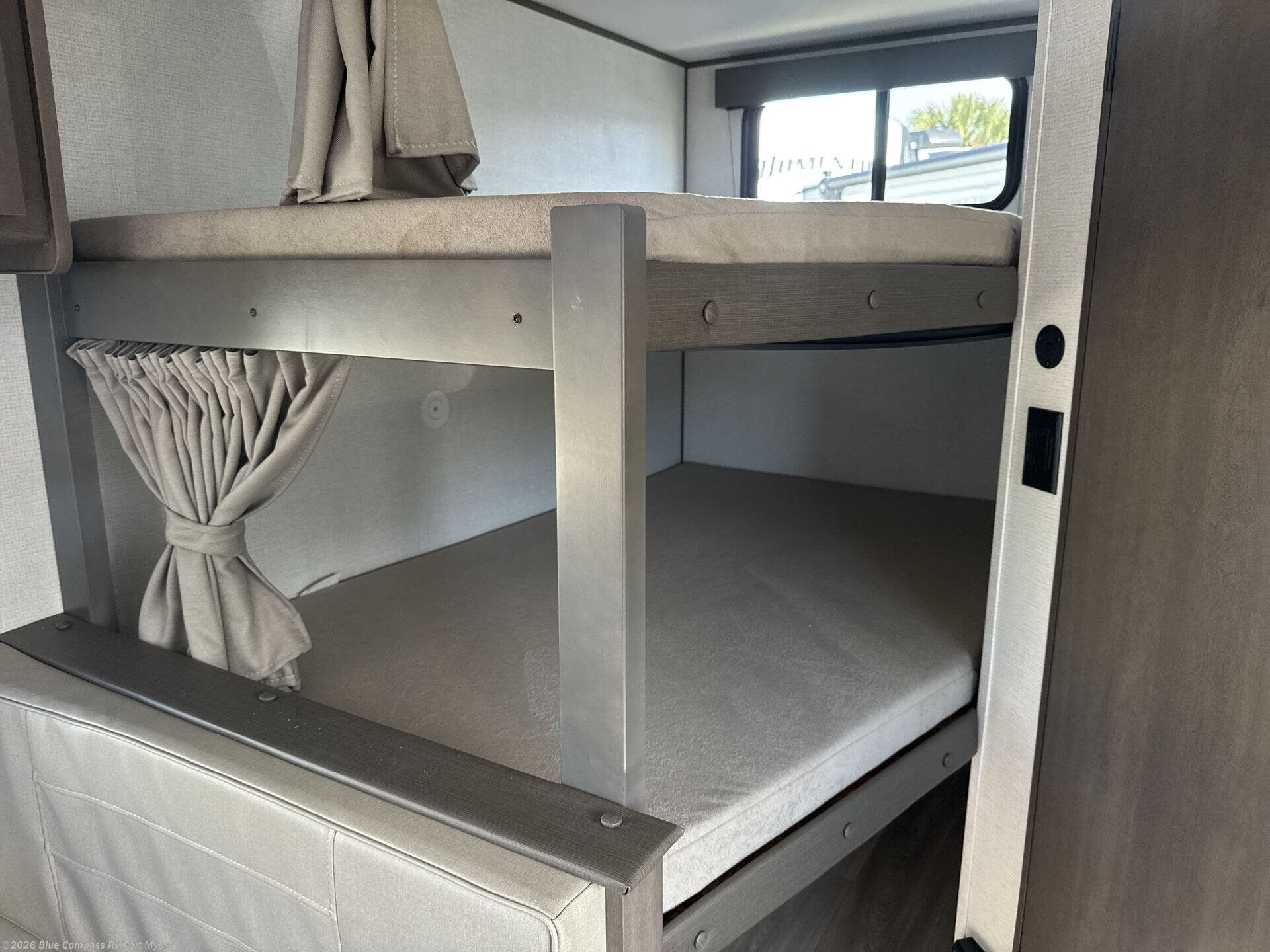 This is the perfect travel trailer if you like to camp with friends and family. Since there are double-size bunks, a queen bed in the front bedroom, plus a booth dinette and sofa, you can sleep eight campers each night! The three burner range and microwave in the kitchen will let you cook meals each day, and the 12V refrigerator will keep your cold items fresh. This model also includes a counter with extra storage underneath, a pull-out trash can storage for convenience, and a full bath to freshen up in each day. And you'll love having your own space in the front bedroom with a privacy curtain, dual wardrobes, and TV prep if you want to add a television!