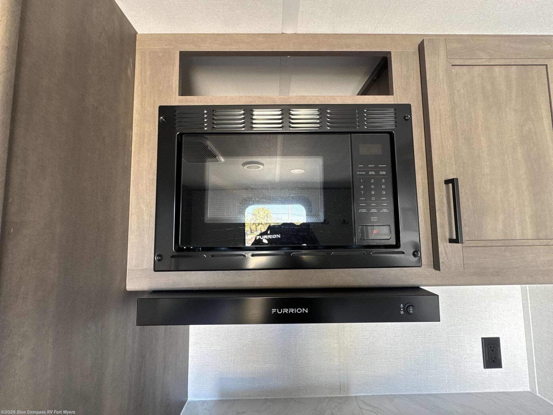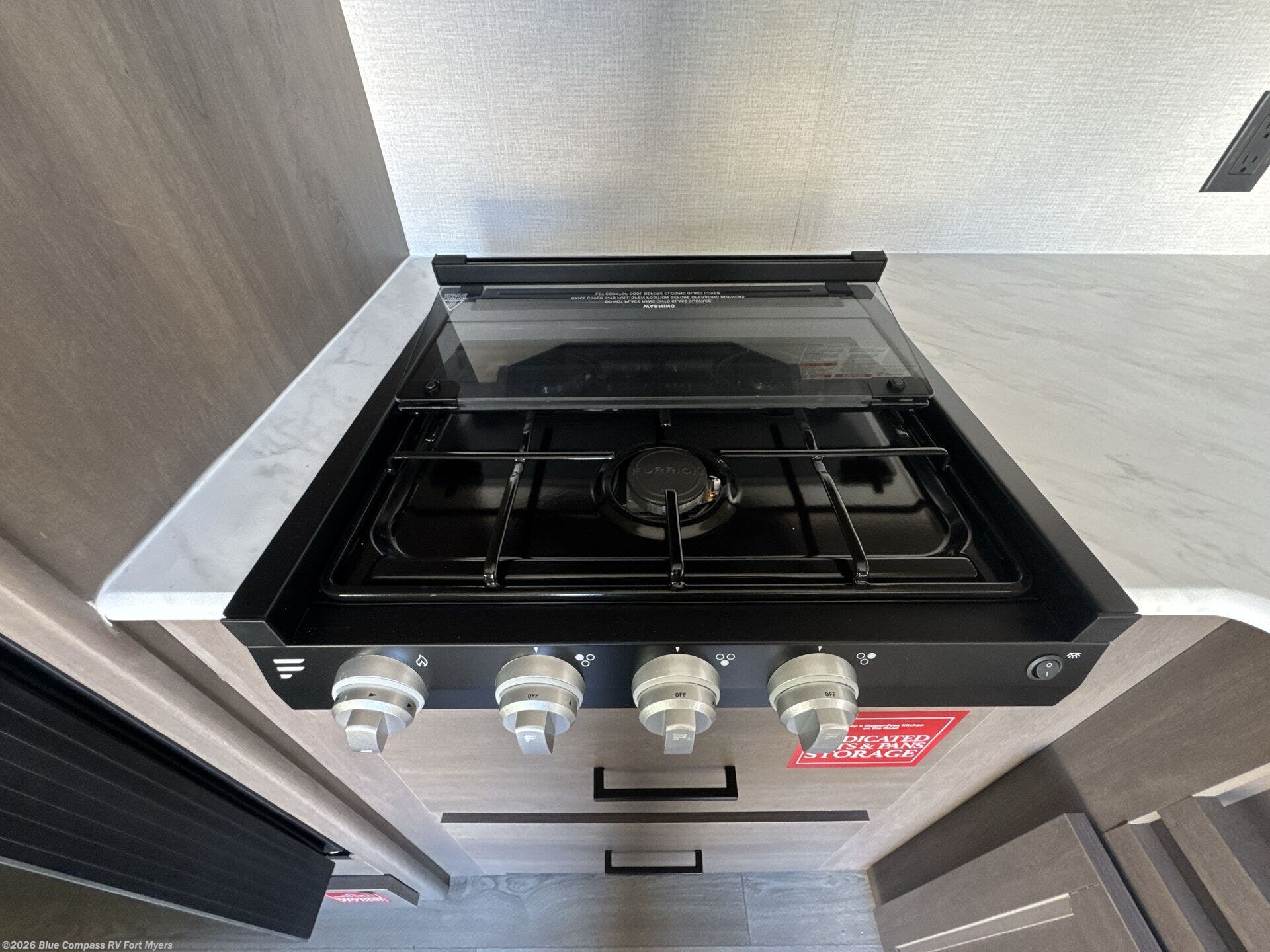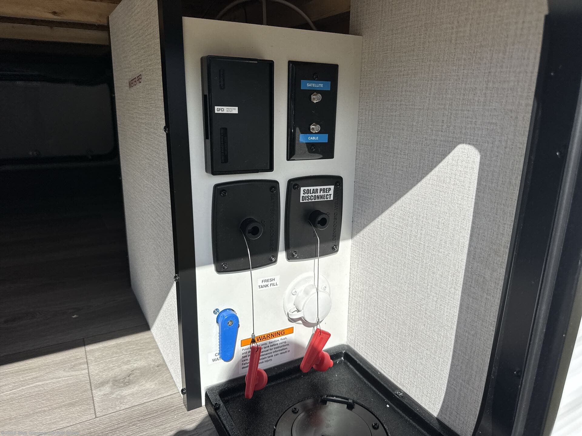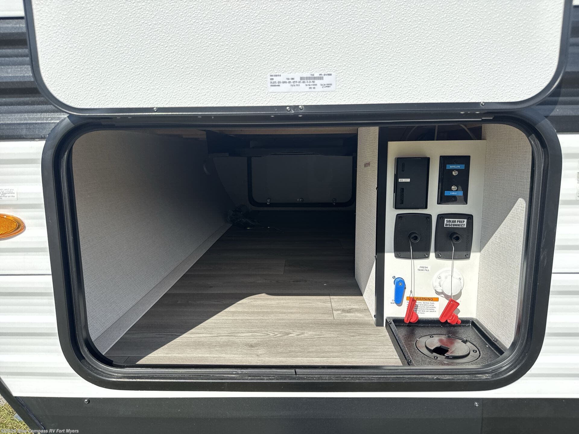 This is the perfect travel trailer if you like to camp with friends and family. Since there are double-size bunks, a queen bed in the front bedroom, plus a booth dinette and sofa, you can sleep eight campers each night! The three burner range and microwave in the kitchen will let you cook meals each day, and the 12V refrigerator will keep your cold items fresh. This model also includes a counter with extra storage underneath, a pull-out trash can storage for convenience, and a full bath to freshen up in each day. And you'll love having your own space in the front bedroom with a privacy curtain, dual wardrobes, and TV prep if you want to add a television!