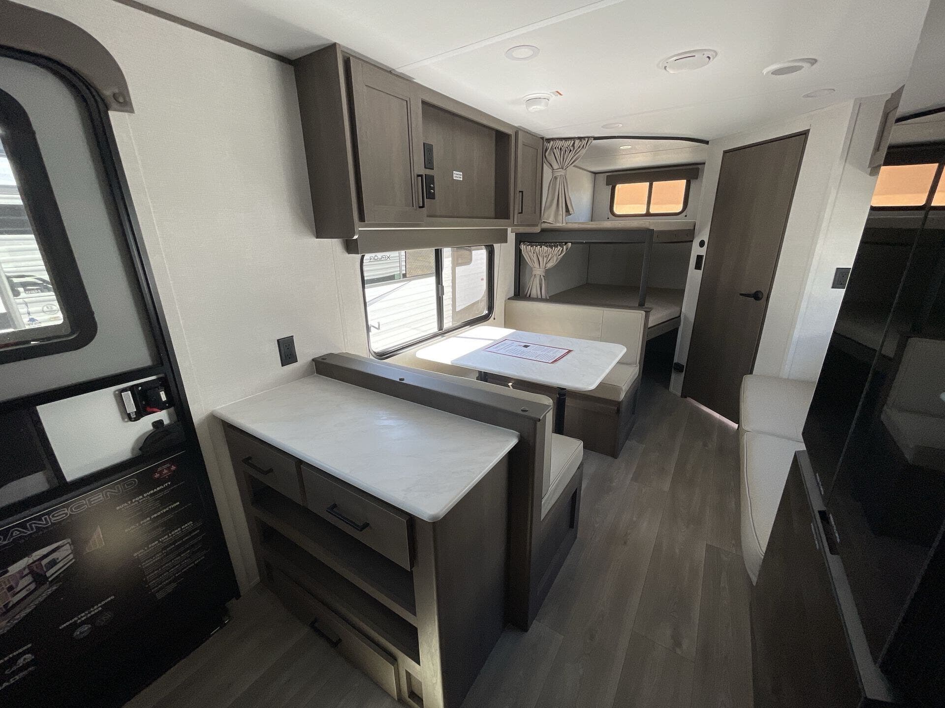 The front private bedroom offers a peaceful retreat with a queen bed, wardrobe storage, and overhead cabinets, while the full bathroom includes a spacious shower, vanity, and linen storage for convenience. Outside, the 24BHX features a power awning with LED lighting, pass-through storage, and durable construction built for all-season adventures. With its combination of comfort, functionality, and family-friendly design, the 2026 Grand Design Transcend Xplor 24BHX is the perfect travel trailer for creating lasting memories on every journey.