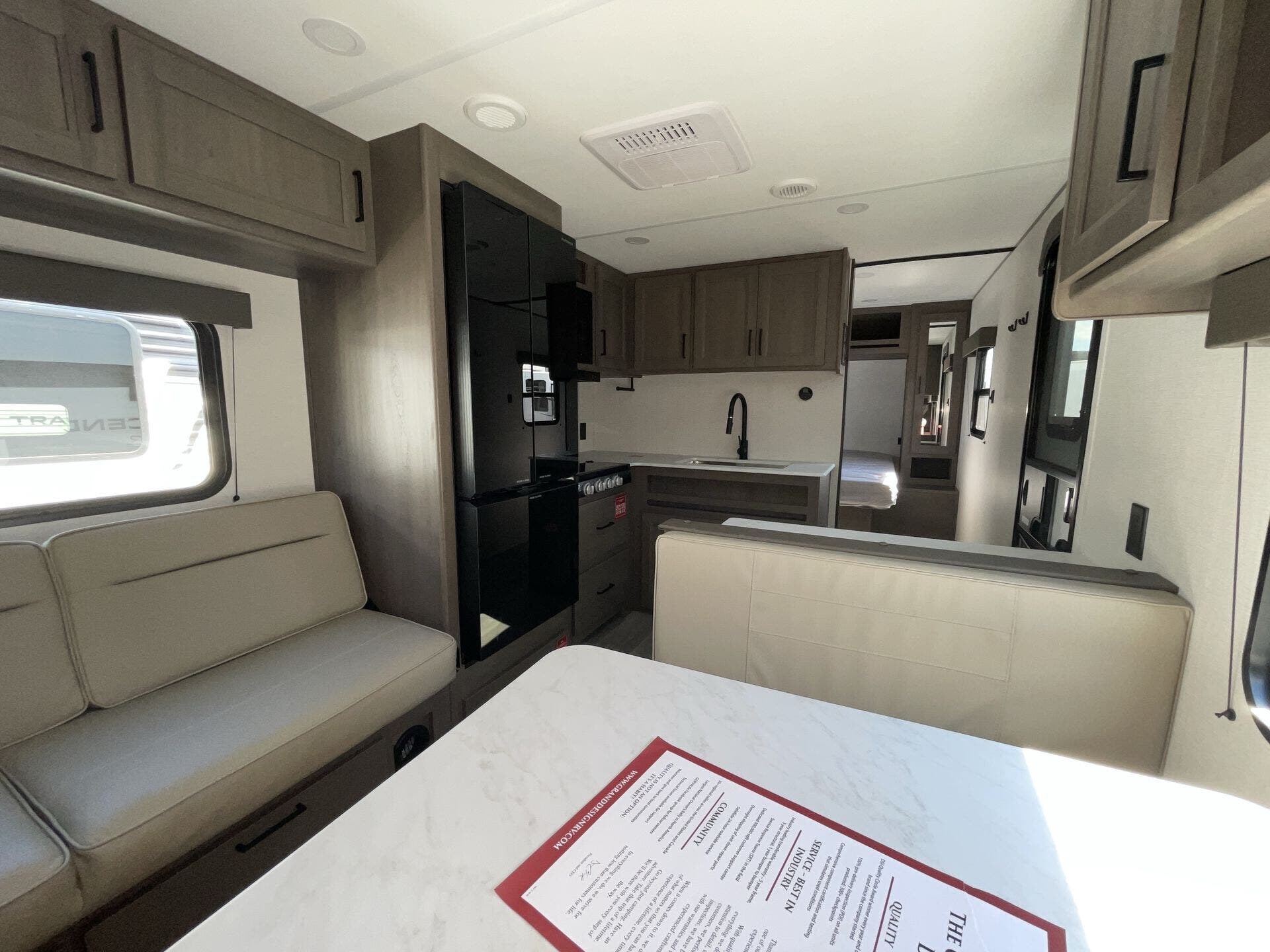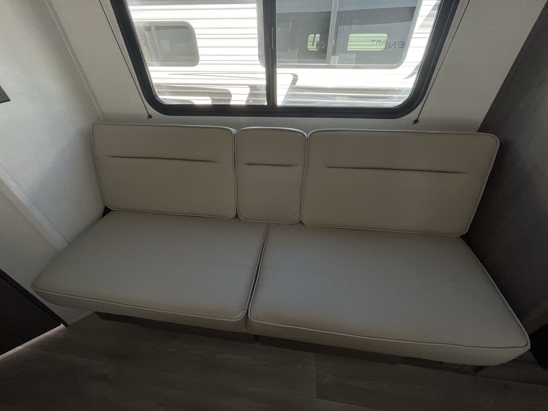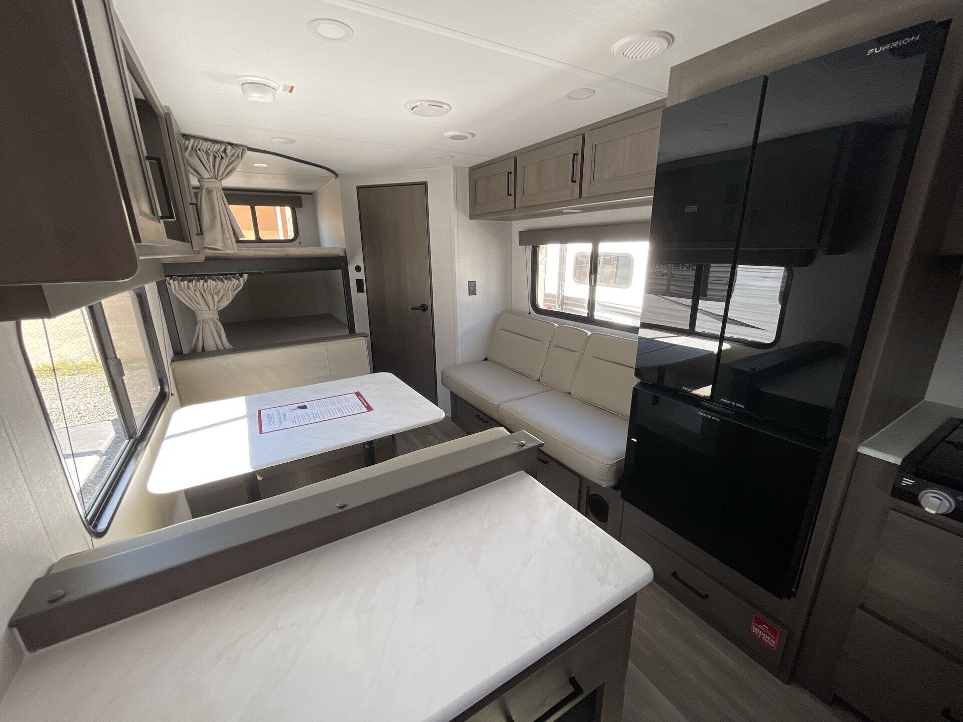 Inside, the 24BHX offers a smart layout that maximizes every inch of space. The rear bunkhouse provides multiple sleeping areas for kids or guests, while the main living area features a U-shaped dinette and a cozy tri-fold sofa for dining, relaxing, or entertainment. The kitchen is fully equipped with stainless steel appliances, solid-surface countertops, a pantry, and ample storage, making meal preparation simple and enjoyable. Large windows throughout the trailer create a bright, open, and inviting atmosphere for the whole family.