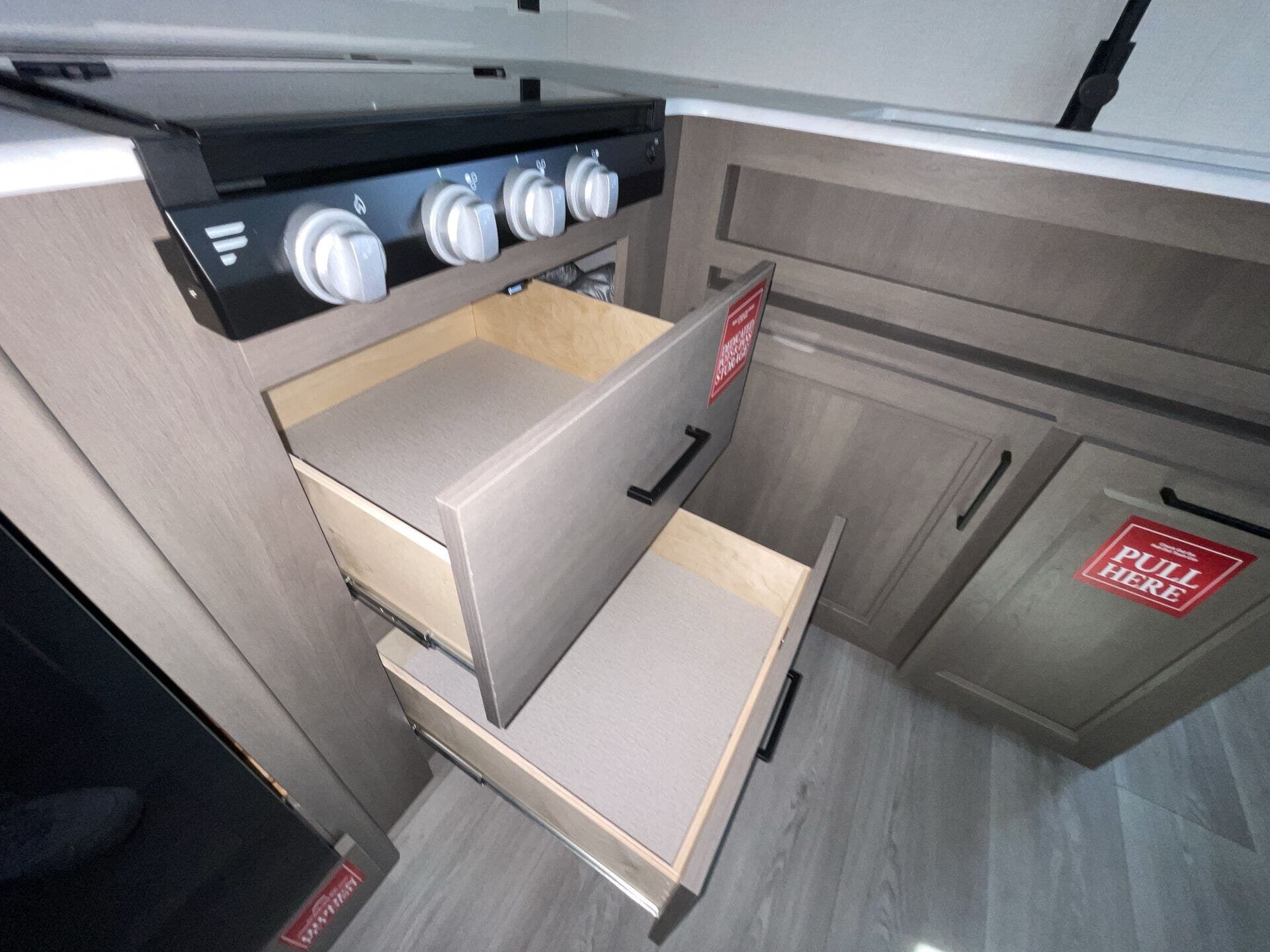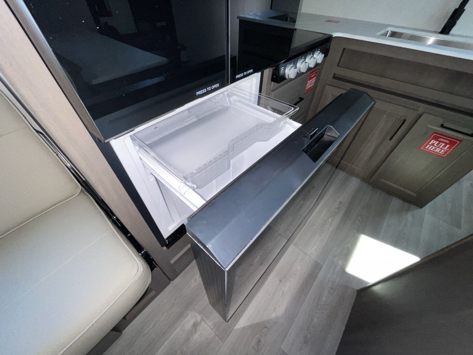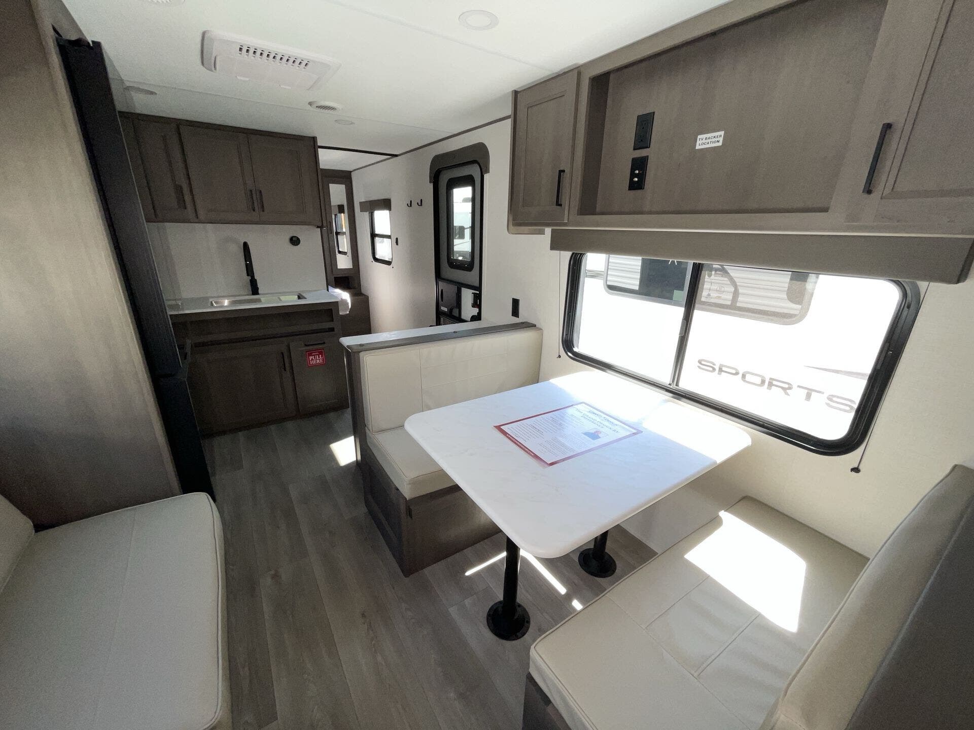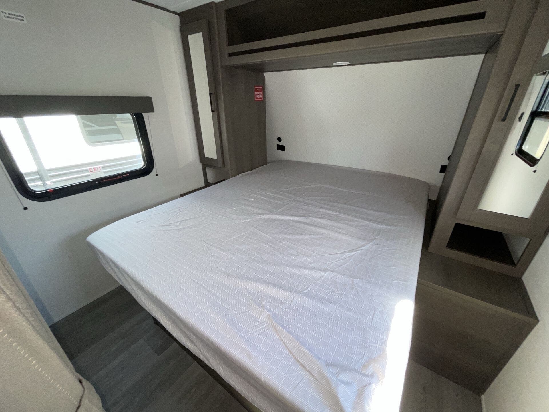 Inside, the 24BHX offers a smart layout that maximizes every inch of space. The rear bunkhouse provides multiple sleeping areas for kids or guests, while the main living area features a U-shaped dinette and a cozy tri-fold sofa for dining, relaxing, or entertainment. The kitchen is fully equipped with stainless steel appliances, solid-surface countertops, a pantry, and ample storage, making meal preparation simple and enjoyable. Large windows throughout the trailer create a bright, open, and inviting atmosphere for the whole family.