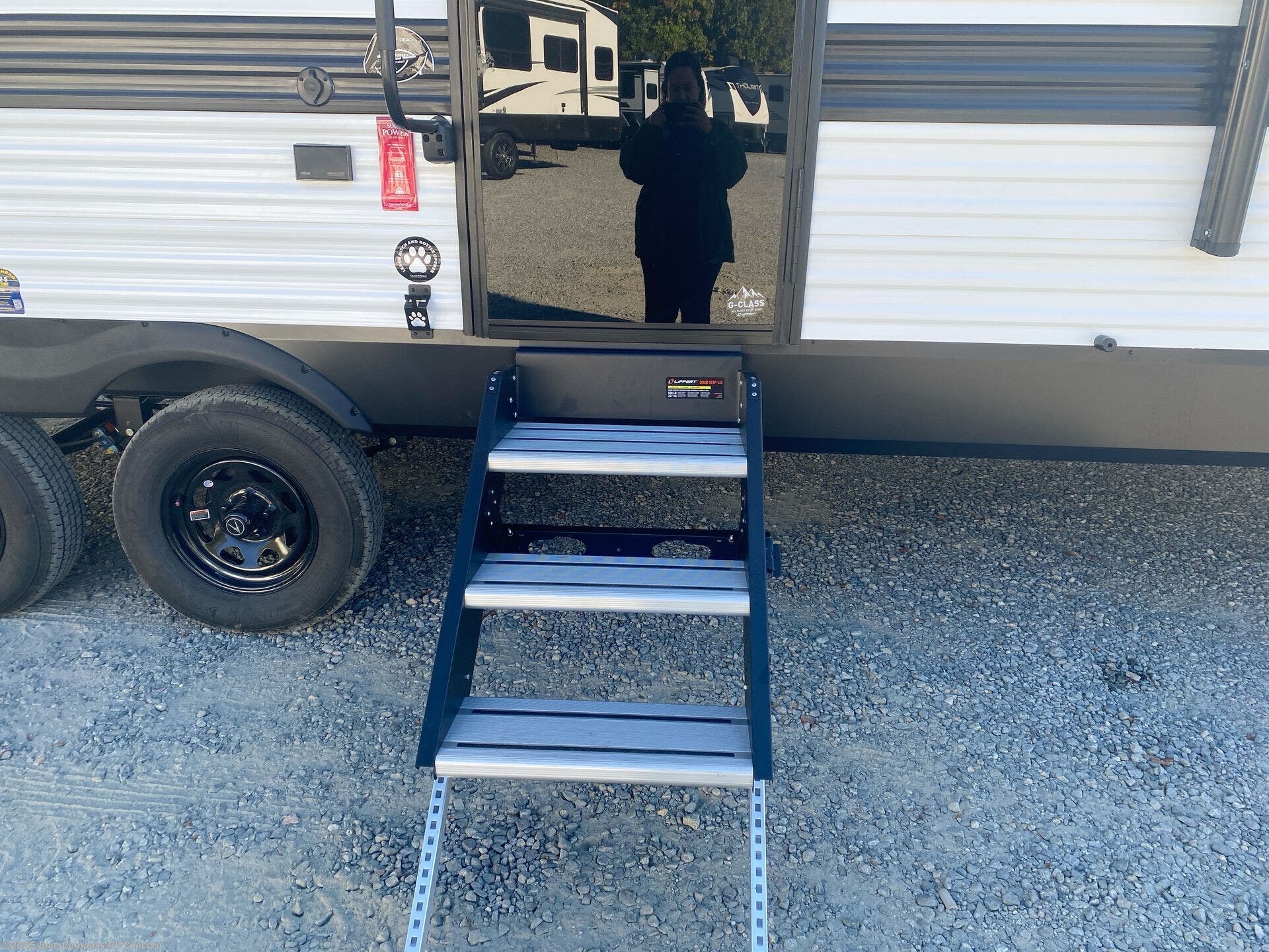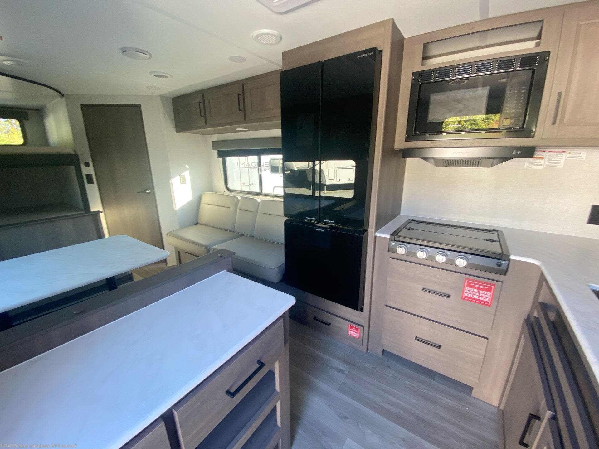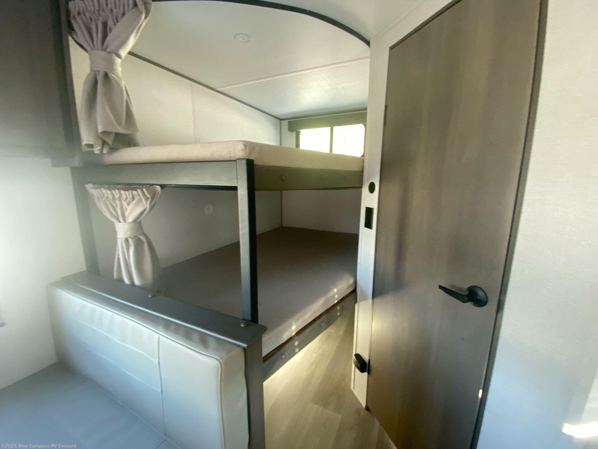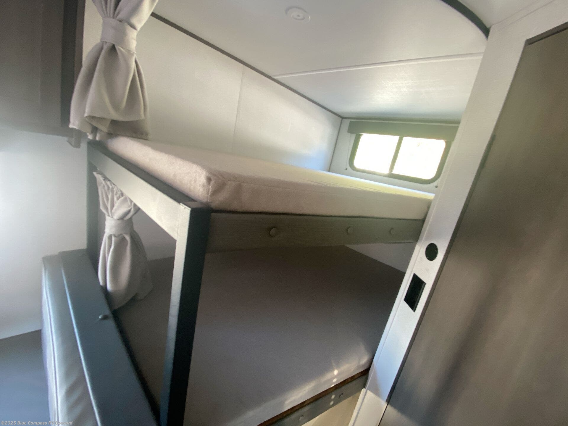 This is the perfect travel trailer if you like to camp with friends and family. Since there are double-size bunks, a queen bed in the front bedroom, plus a booth dinette and sofa, you can sleep eight campers each night! The three burner range and microwave in the kitchen will let you cook meals each day, and the 12V refrigerator will keep your cold items fresh. This model also includes a counter with extra storage underneath, a pull-out trash can storage for convenience, and a full bath to freshen up in each day. And you'll love having your own space in the front bedroom with a privacy curtain, dual wardrobes, and TV prep if you want to add a television!