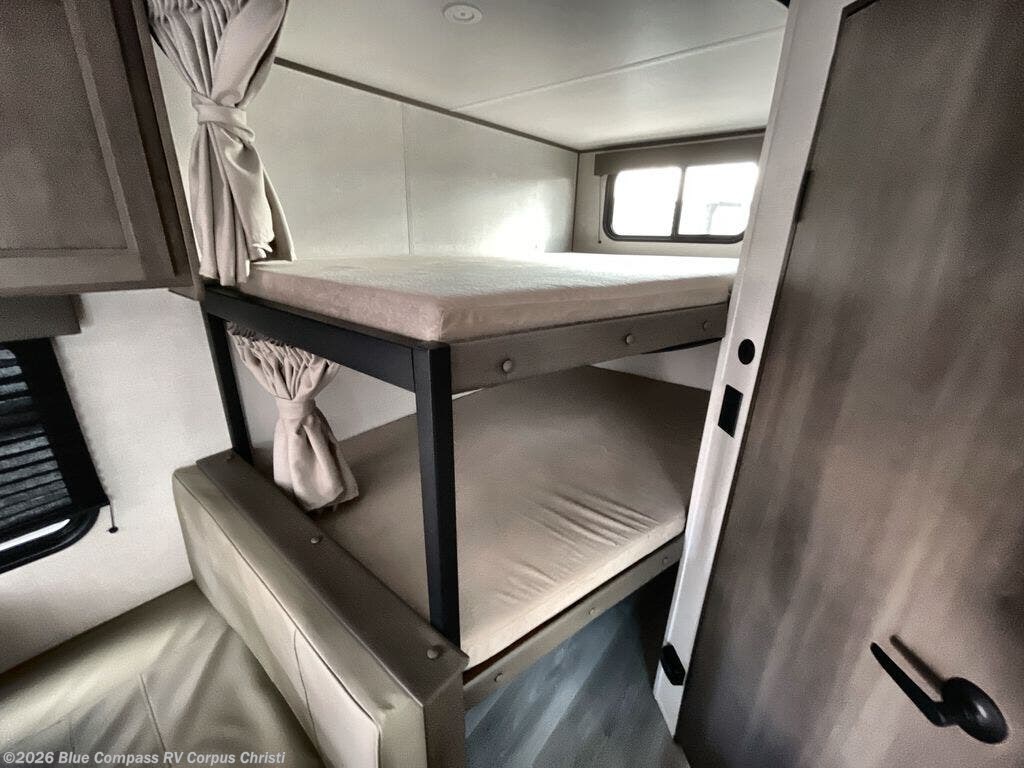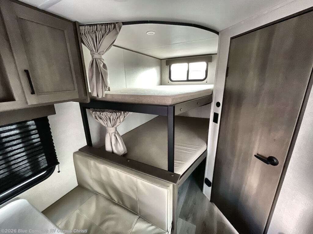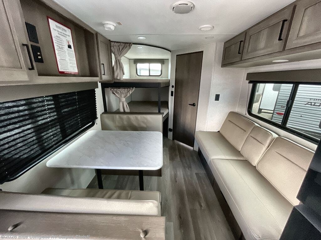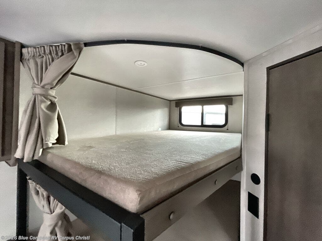 This is the perfect travel trailer if you like to camp with friends and family. Since there are double-size bunks, a queen bed in the front bedroom, plus a booth dinette and sofa, you can sleep eight campers each night! The three burner range and microwave in the kitchen will let you cook meals each day, and the 12V refrigerator will keep your cold items fresh. This model also includes a counter with extra storage underneath, a pull-out trash can storage for convenience, and a full bath to freshen up in each day. And you'll love having your own space in the front bedroom with a privacy curtain, dual wardrobes, and TV prep if you want to add a television!