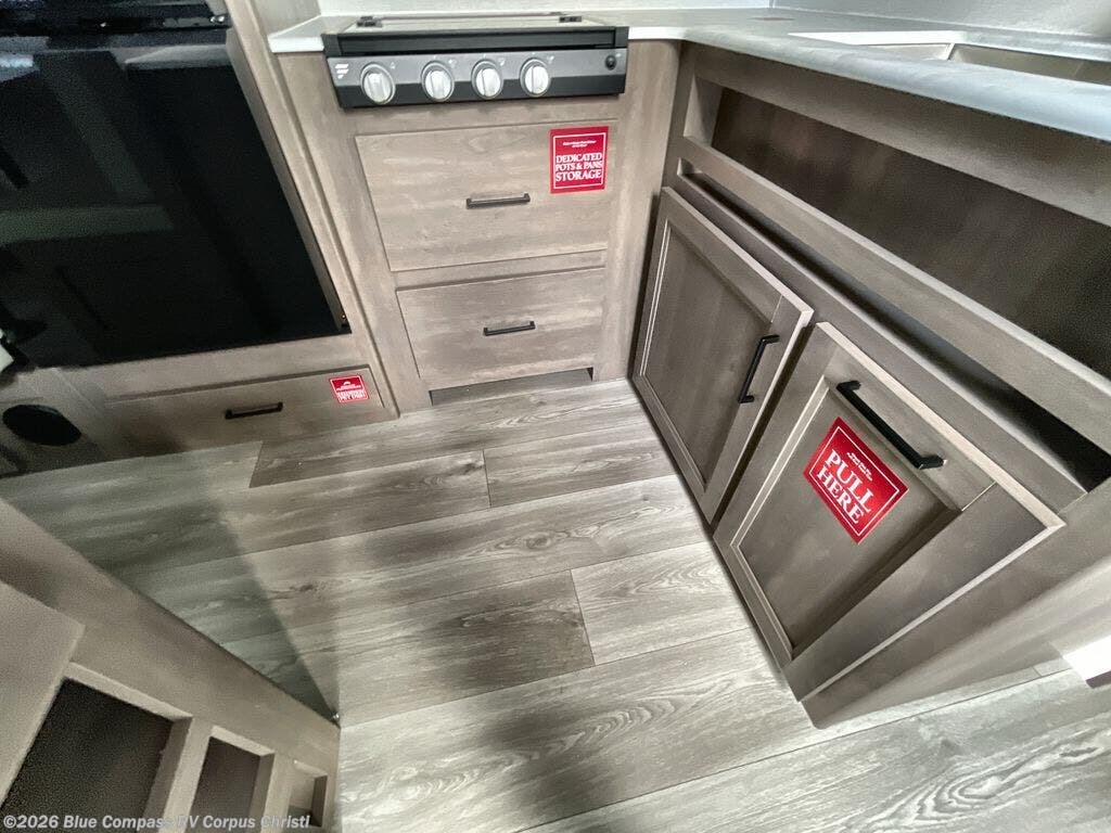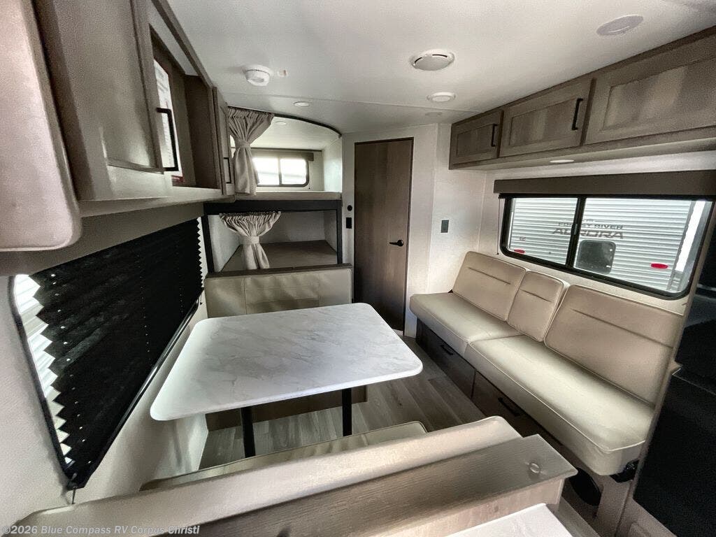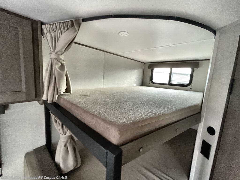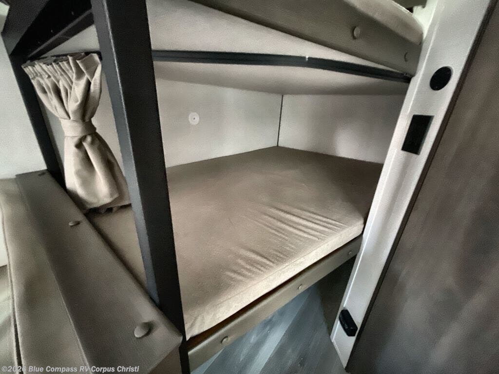 This is the perfect travel trailer if you like to camp with friends and family. Since there are double-size bunks, a queen bed in the front bedroom, plus a booth dinette and sofa, you can sleep eight campers each night! The three burner range and microwave in the kitchen will let you cook meals each day, and the 12V refrigerator will keep your cold items fresh. This model also includes a counter with extra storage underneath, a pull-out trash can storage for convenience, and a full bath to freshen up in each day. And you'll love having your own space in the front bedroom with a privacy curtain, dual wardrobes, and TV prep if you want to add a television!