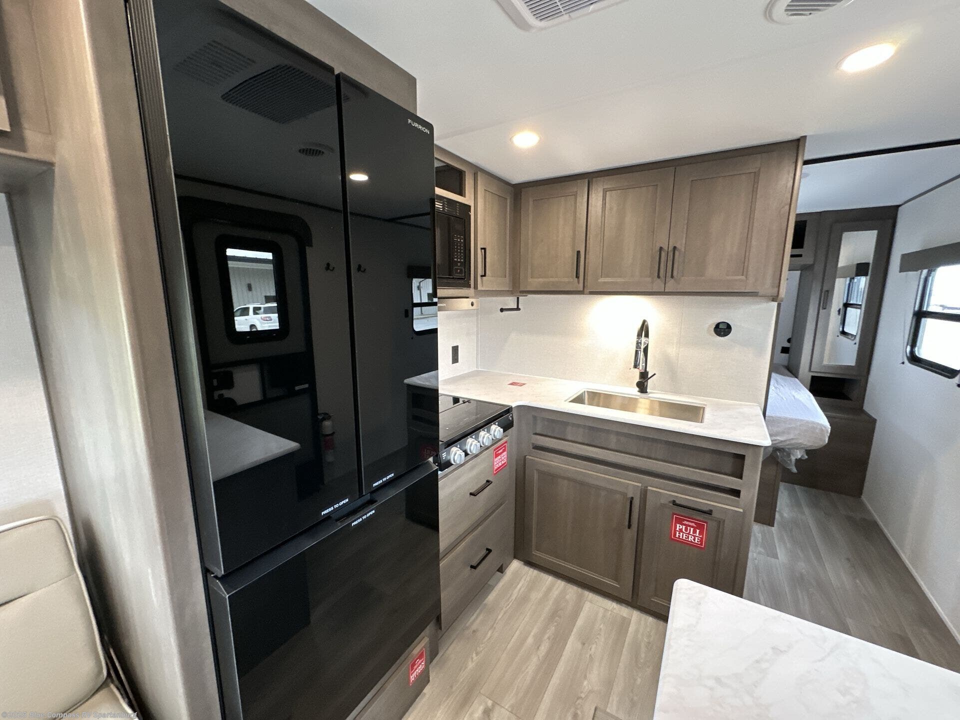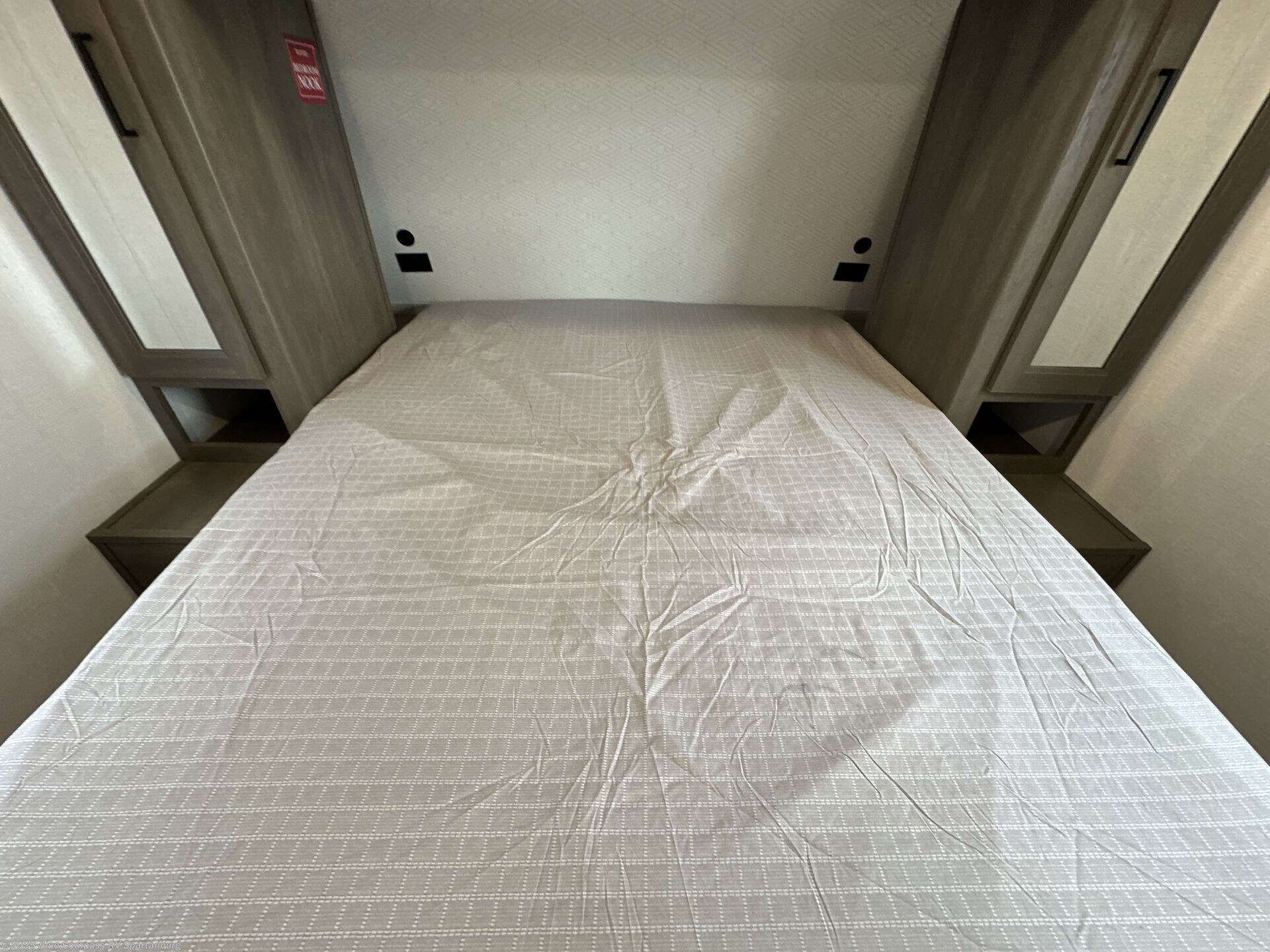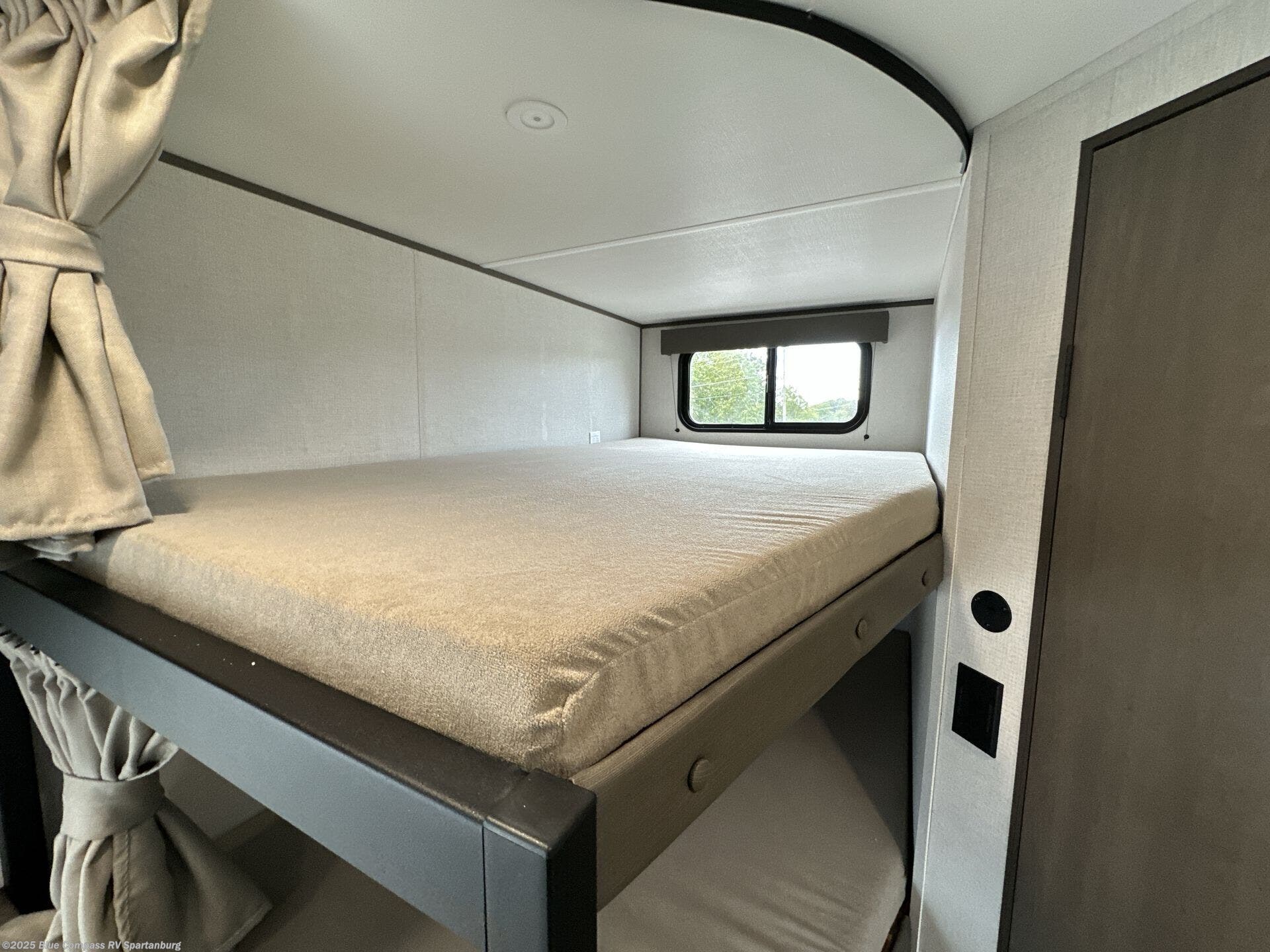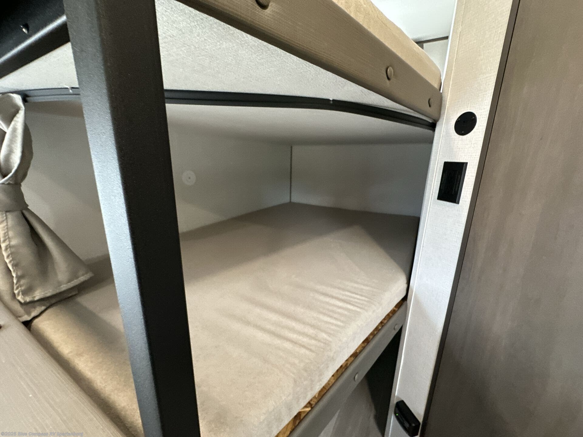 This is the perfect travel trailer if you like to camp with friends and family. Since there are double-size bunks, a queen bed in the front bedroom, plus a booth dinette and sofa, you can sleep eight campers each night! The three burner range and microwave in the kitchen will let you cook meals each day, and the 12V refrigerator will keep your cold items fresh. This model also includes a counter with extra storage underneath, a pull-out trash can storage for convenience, and a full bath to freshen up in each day. And you'll love having your own space in the front bedroom with a privacy curtain, dual wardrobes, and TV prep if you want to add a television!