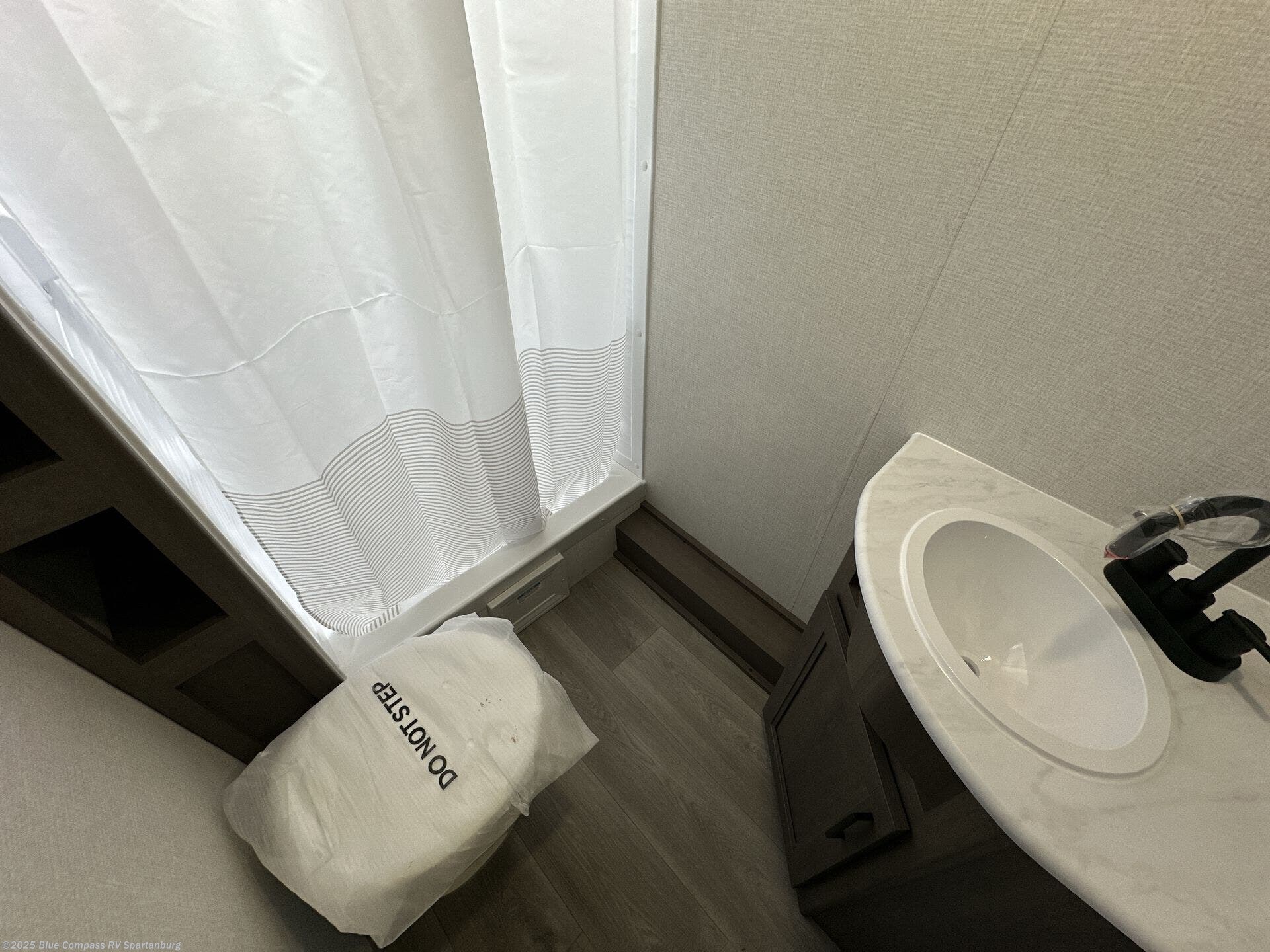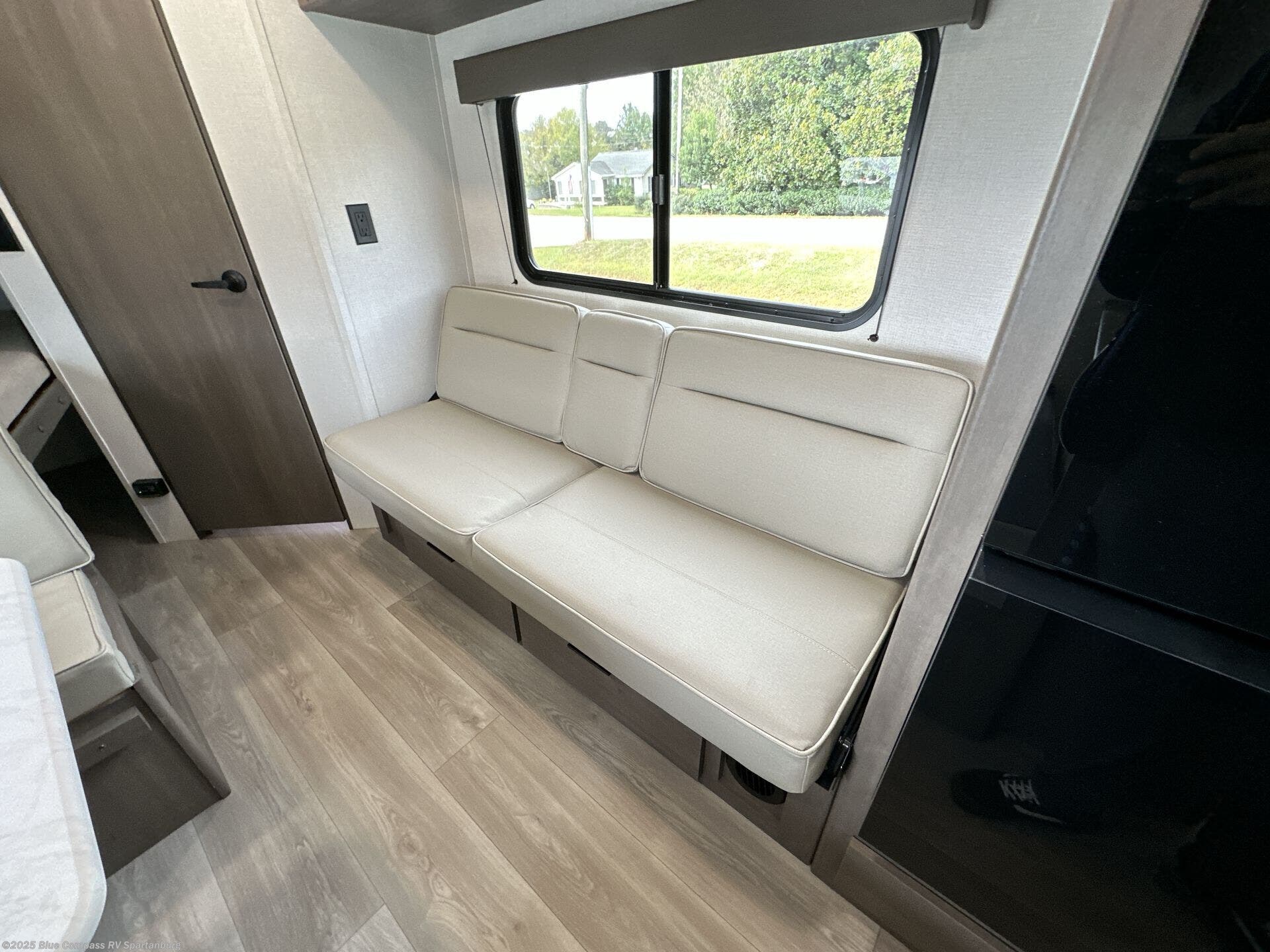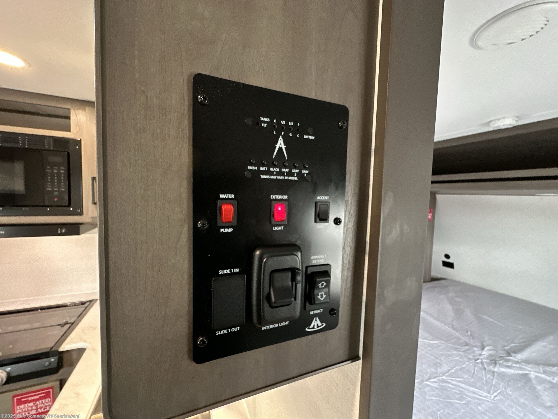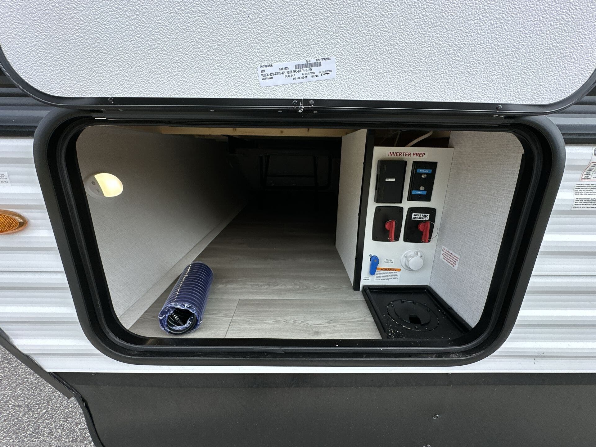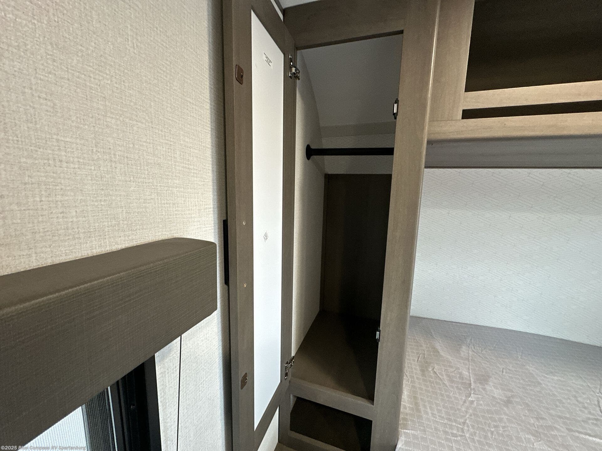 This is the perfect travel trailer if you like to camp with friends and family. Since there are double-size bunks, a queen bed in the front bedroom, plus a booth dinette and sofa, you can sleep eight campers each night! The three burner range and microwave in the kitchen will let you cook meals each day, and the 12V refrigerator will keep your cold items fresh. This model also includes a counter with extra storage underneath, a pull-out trash can storage for convenience, and a full bath to freshen up in each day. And you'll love having your own space in the front bedroom with a privacy curtain, dual wardrobes, and TV prep if you want to add a television!