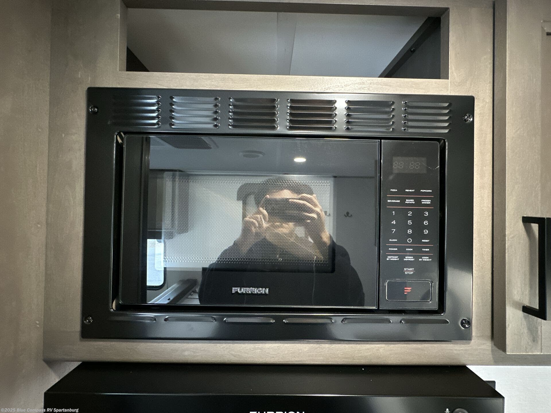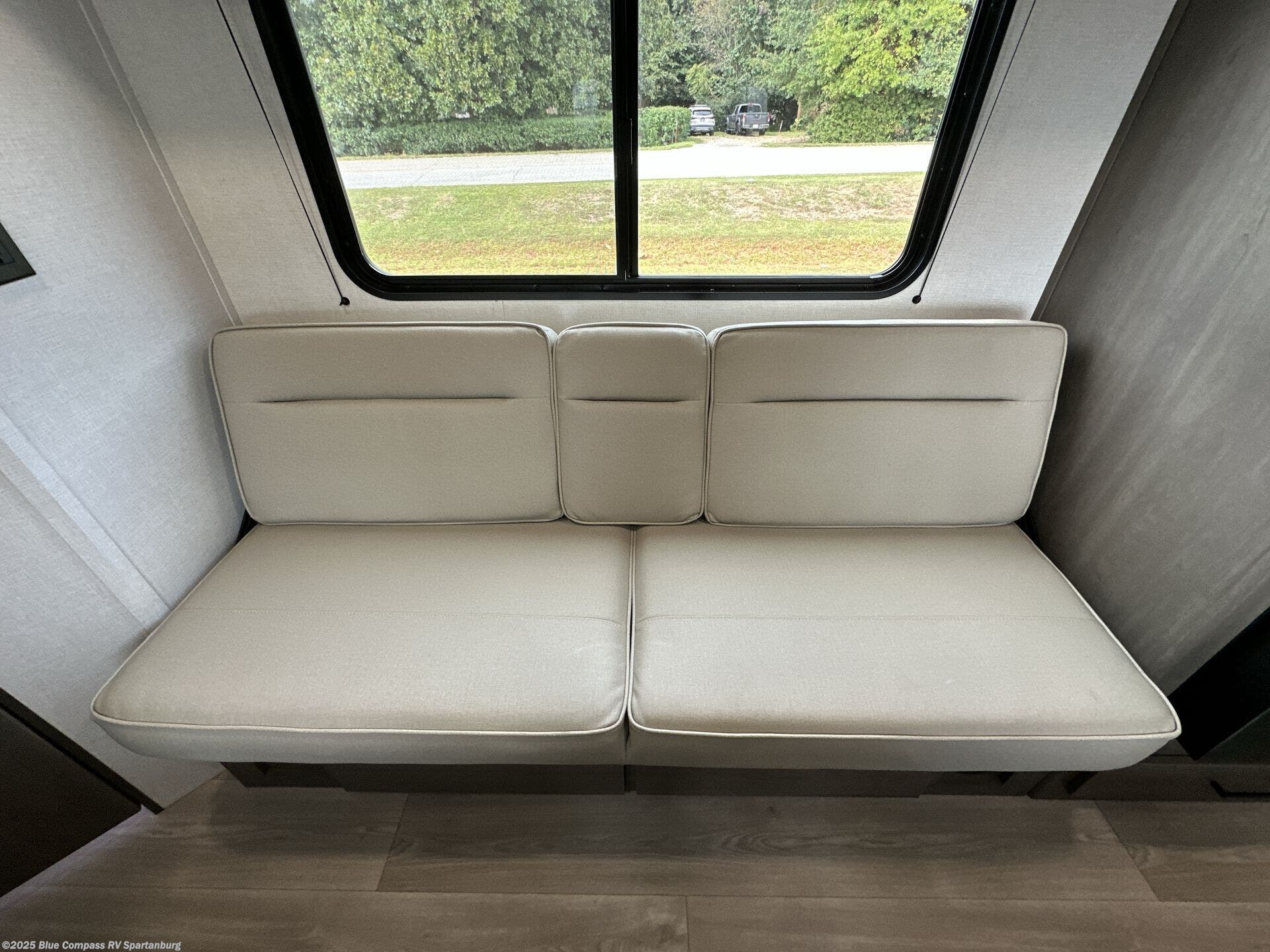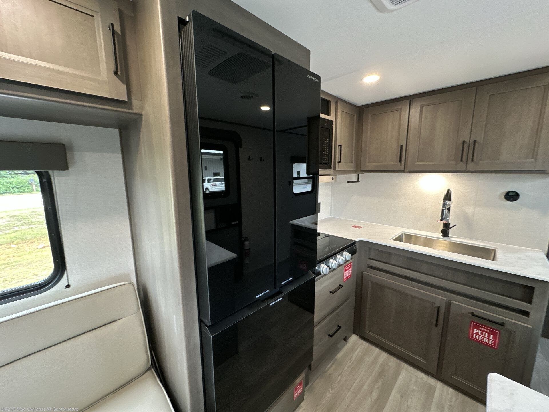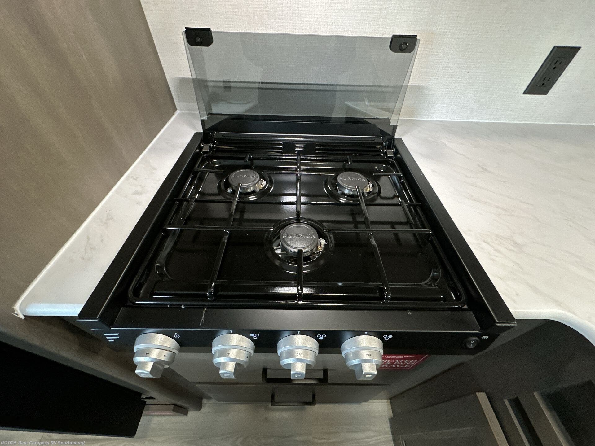 This is the perfect travel trailer if you like to camp with friends and family. Since there are double-size bunks, a queen bed in the front bedroom, plus a booth dinette and sofa, you can sleep eight campers each night! The three burner range and microwave in the kitchen will let you cook meals each day, and the 12V refrigerator will keep your cold items fresh. This model also includes a counter with extra storage underneath, a pull-out trash can storage for convenience, and a full bath to freshen up in each day. And you'll love having your own space in the front bedroom with a privacy curtain, dual wardrobes, and TV prep if you want to add a television!