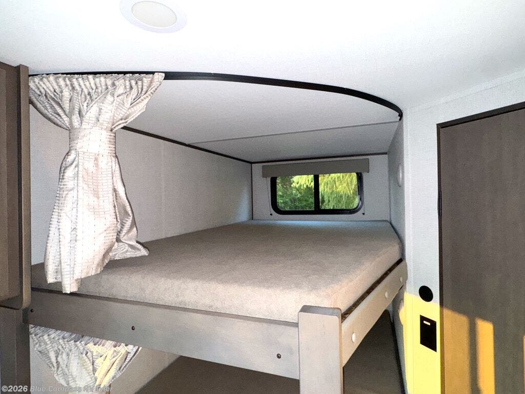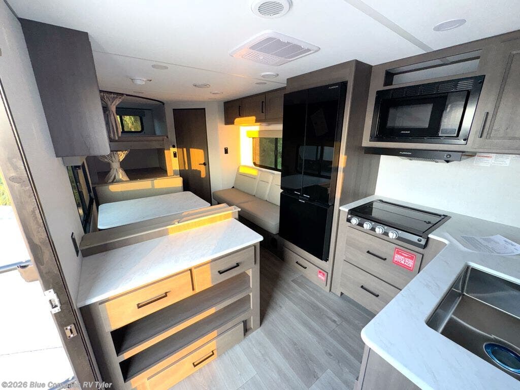 This is the perfect travel trailer if you like to camp with friends and family. Since there are double-size bunks, a queen bed in the front bedroom, plus a booth dinette and sofa, you can sleep eight campers each night! The three burner range and microwave in the kitchen will let you cook meals each day, and the 12V refrigerator will keep your cold items fresh. This model also includes a counter with extra storage underneath, a pull-out trash can storage for convenience, and a full bath to freshen up in each day. And you'll love having your own space in the front bedroom with a privacy curtain, dual wardrobes, and TV prep if you want to add a television!
