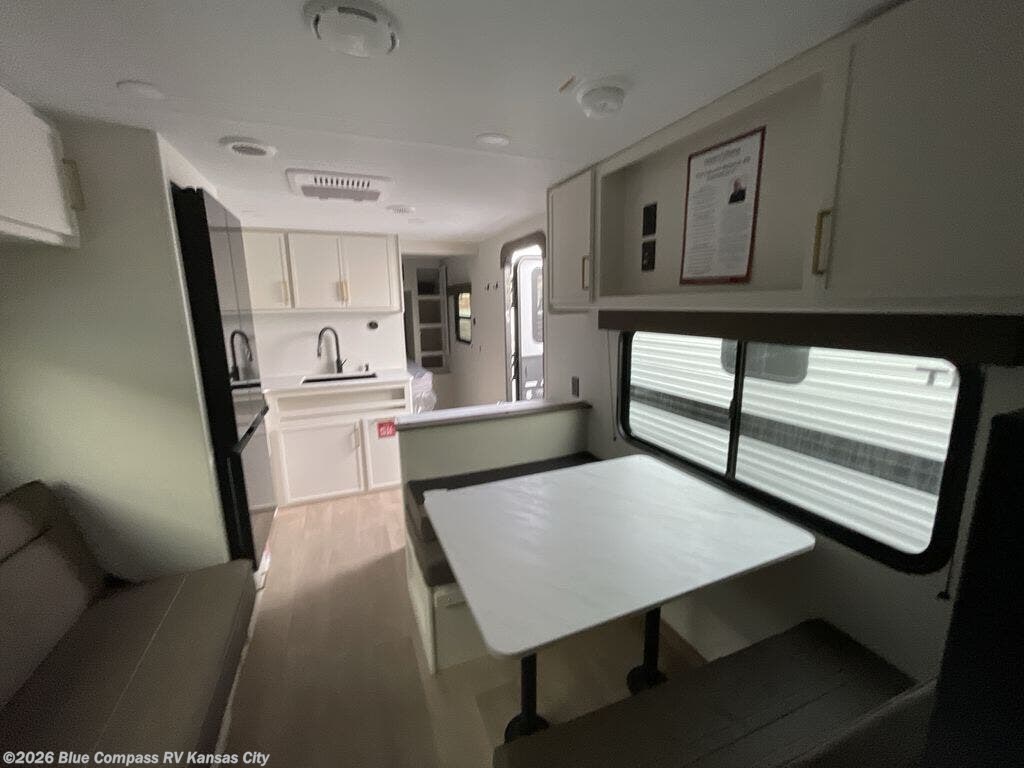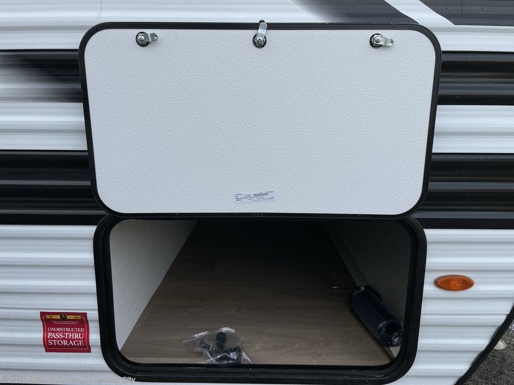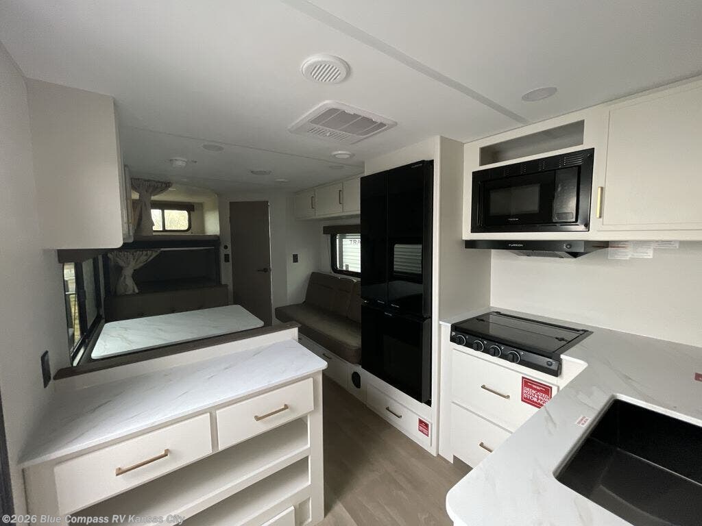 This is the perfect travel trailer if you like to camp with friends and family. Since there are double-size bunks, a queen bed in the front bedroom, plus a booth dinette and sofa, you can sleep eight campers each night! The three burner range and microwave in the kitchen will let you cook meals each day, and the 12V refrigerator will keep your cold items fresh. This model also includes a counter with extra storage underneath, a pull-out trash can storage for convenience, and a full bath to freshen up in each day. And you'll love having your own space in the front bedroom with a privacy curtain, dual wardrobes, and TV prep if you want to add a television!