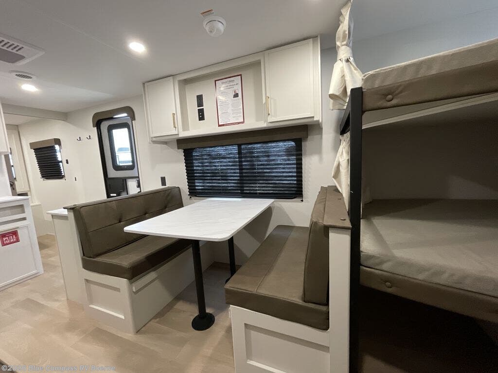 This is the perfect travel trailer if you like to camp with friends and family. Since there are double-size bunks, a queen bed in the front bedroom, plus a booth dinette and sofa, you can sleep eight campers each night! The three burner range and microwave in the kitchen will let you cook meals each day, and the 12V refrigerator will keep your cold items fresh. This model also includes a counter with extra storage underneath, a pull-out trash can storage for convenience, and a full bath to freshen up in each day. And you'll love having your own space in the front bedroom with a privacy curtain, dual wardrobes, and TV prep if you want to add a television!