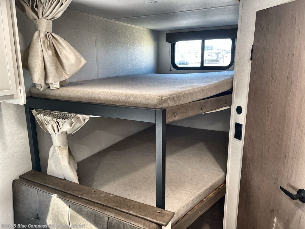 This is the perfect travel trailer if you like to camp with friends and family. Since there are double-size bunks, a queen bed in the front bedroom, plus a booth dinette and sofa, you can sleep eight campers each night! The three burner range and microwave in the kitchen will let you cook meals each day, and the 12V refrigerator will keep your cold items fresh. This model also includes a counter with extra storage underneath, a pull-out trash can storage for convenience, and a full bath to freshen up in each day. And you'll love having your own space in the front bedroom with a privacy curtain, dual wardrobes, and TV prep if you want to add a television!