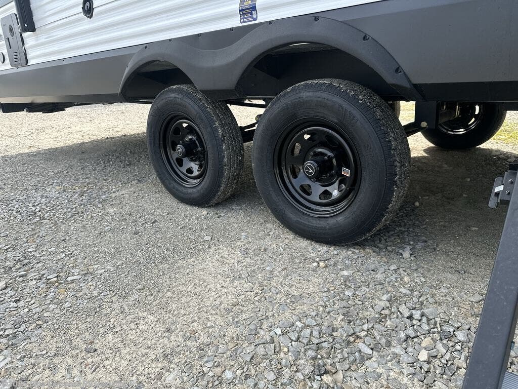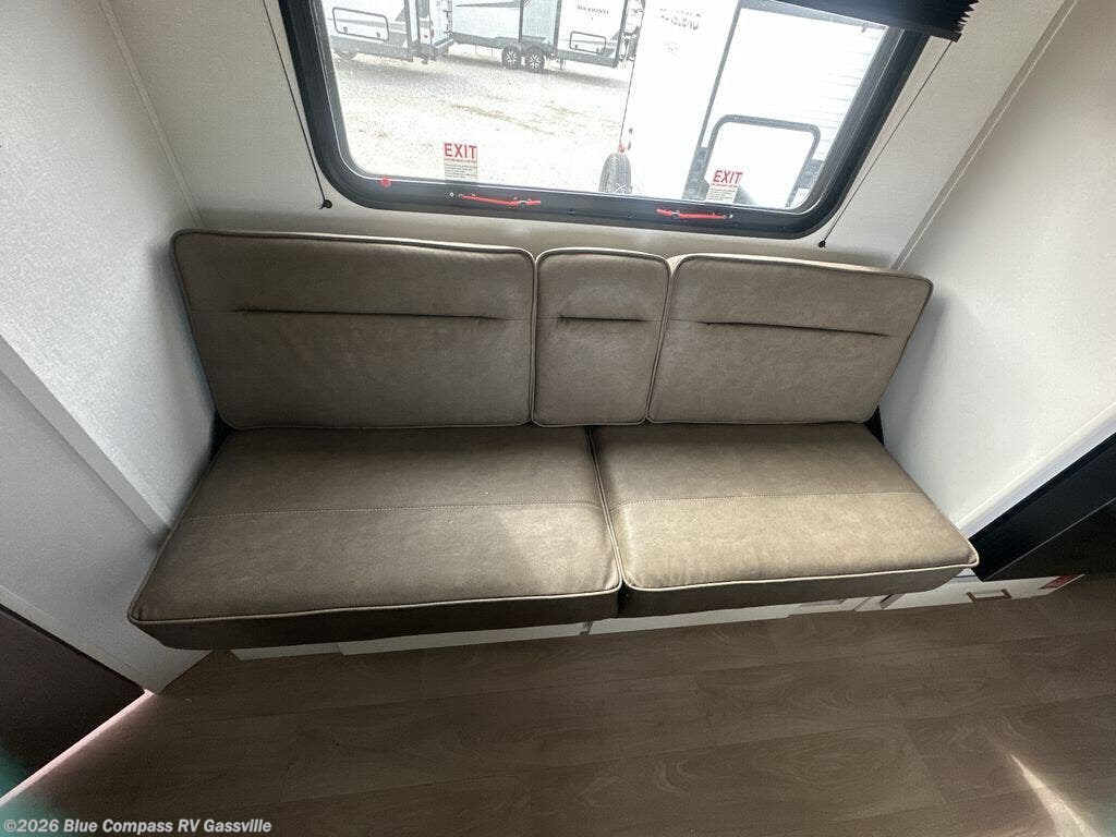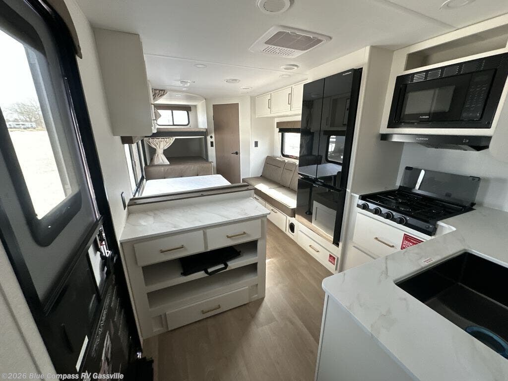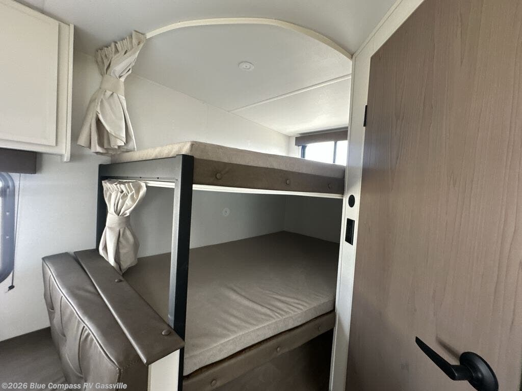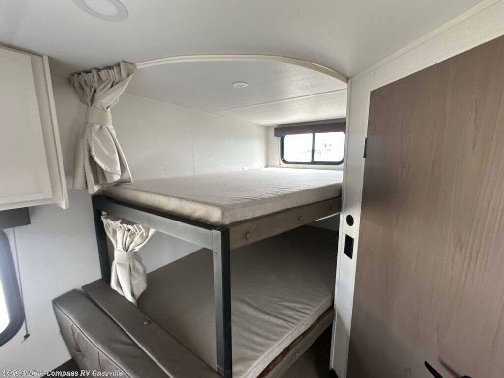 This is the perfect travel trailer if you like to camp with friends and family. Since there are double-size bunks, a queen bed in the front bedroom, plus a booth dinette and sofa, you can sleep eight campers each night! The three burner range and microwave in the kitchen will let you cook meals each day, and the 12V refrigerator will keep your cold items fresh. This model also includes a counter with extra storage underneath, a pull-out trash can storage for convenience, and a full bath to freshen up in each day. And you'll love having your own space in the front bedroom with a privacy curtain, dual wardrobes, and TV prep if you want to add a television!