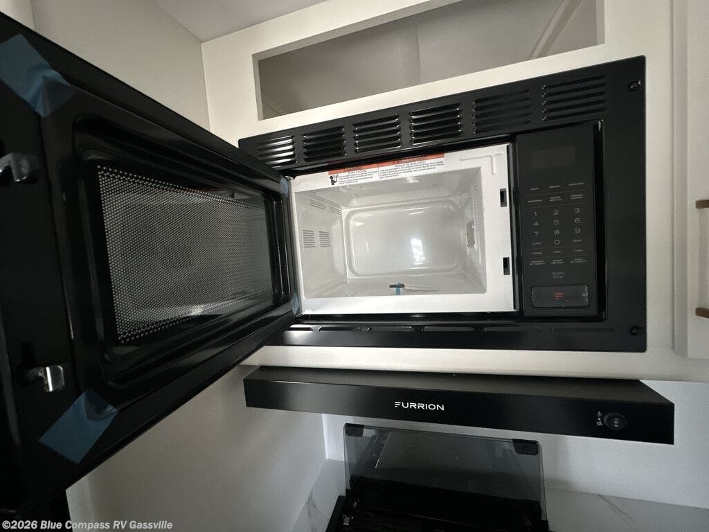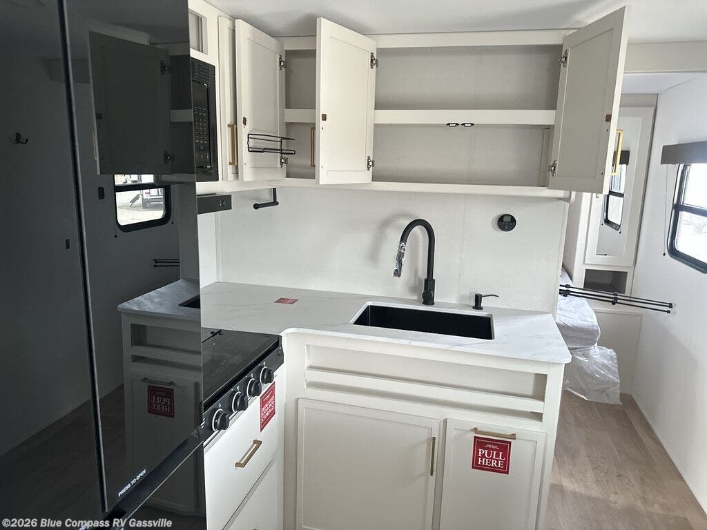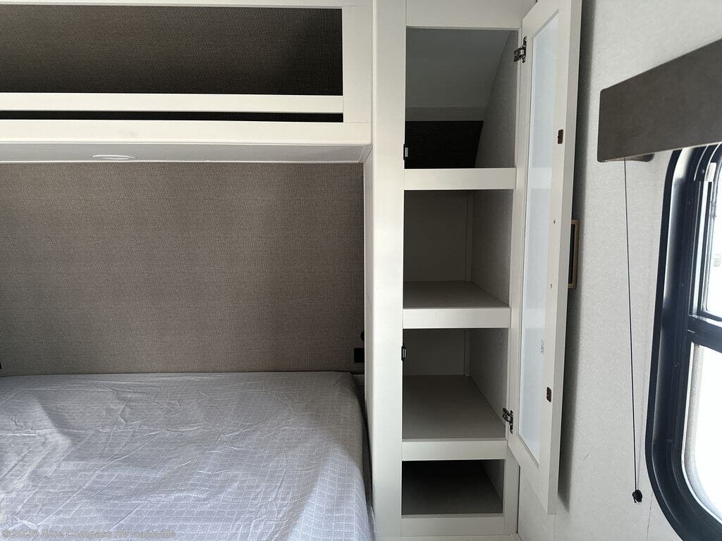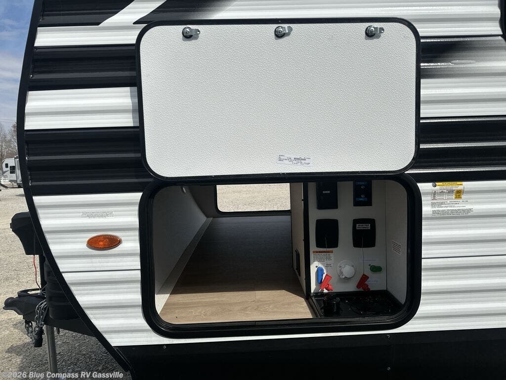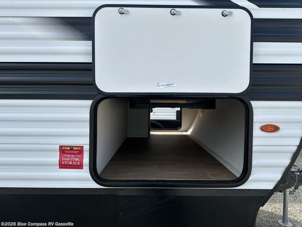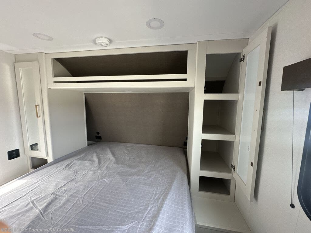 This is the perfect travel trailer if you like to camp with friends and family. Since there are double-size bunks, a queen bed in the front bedroom, plus a booth dinette and sofa, you can sleep eight campers each night! The three burner range and microwave in the kitchen will let you cook meals each day, and the 12V refrigerator will keep your cold items fresh. This model also includes a counter with extra storage underneath, a pull-out trash can storage for convenience, and a full bath to freshen up in each day. And you'll love having your own space in the front bedroom with a privacy curtain, dual wardrobes, and TV prep if you want to add a television!