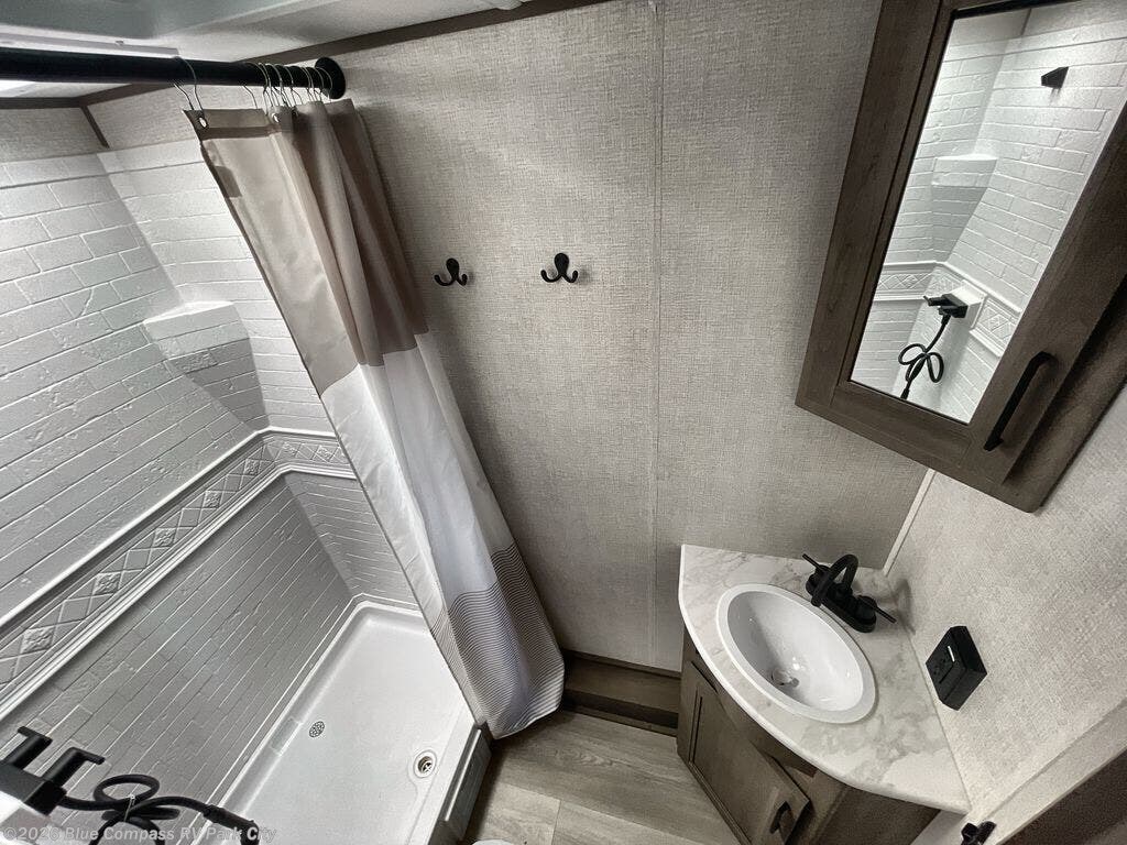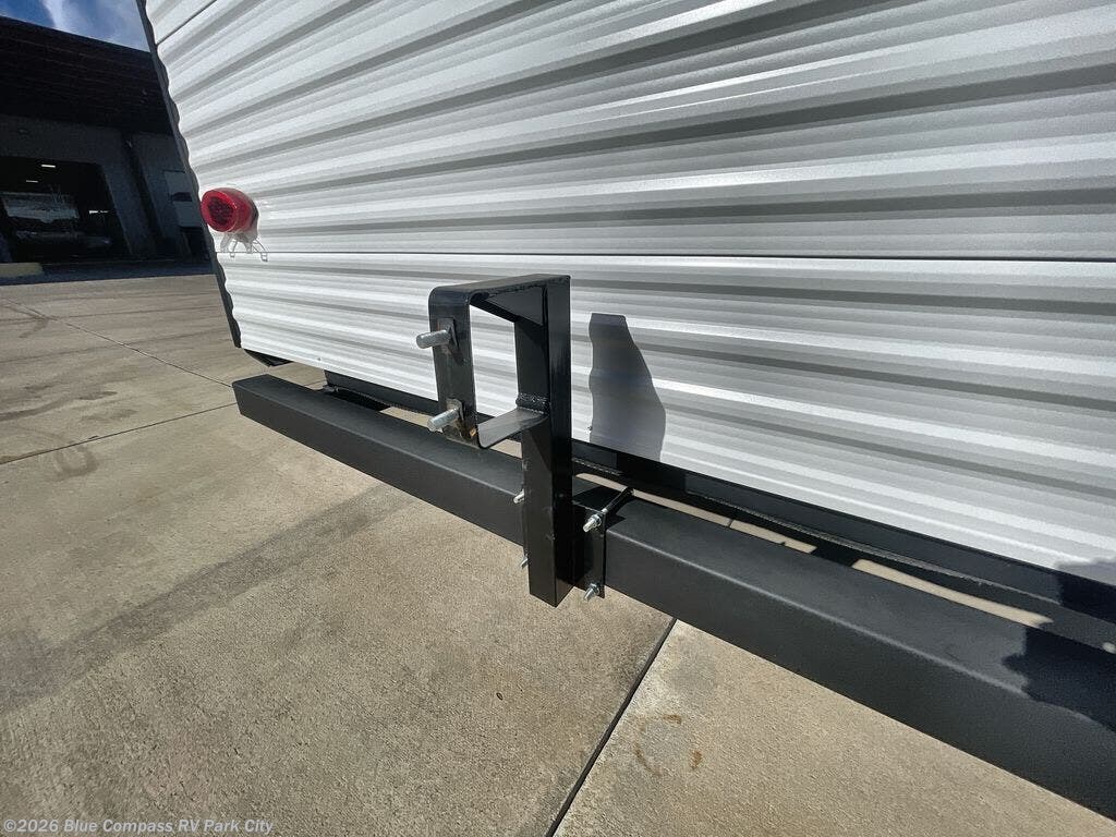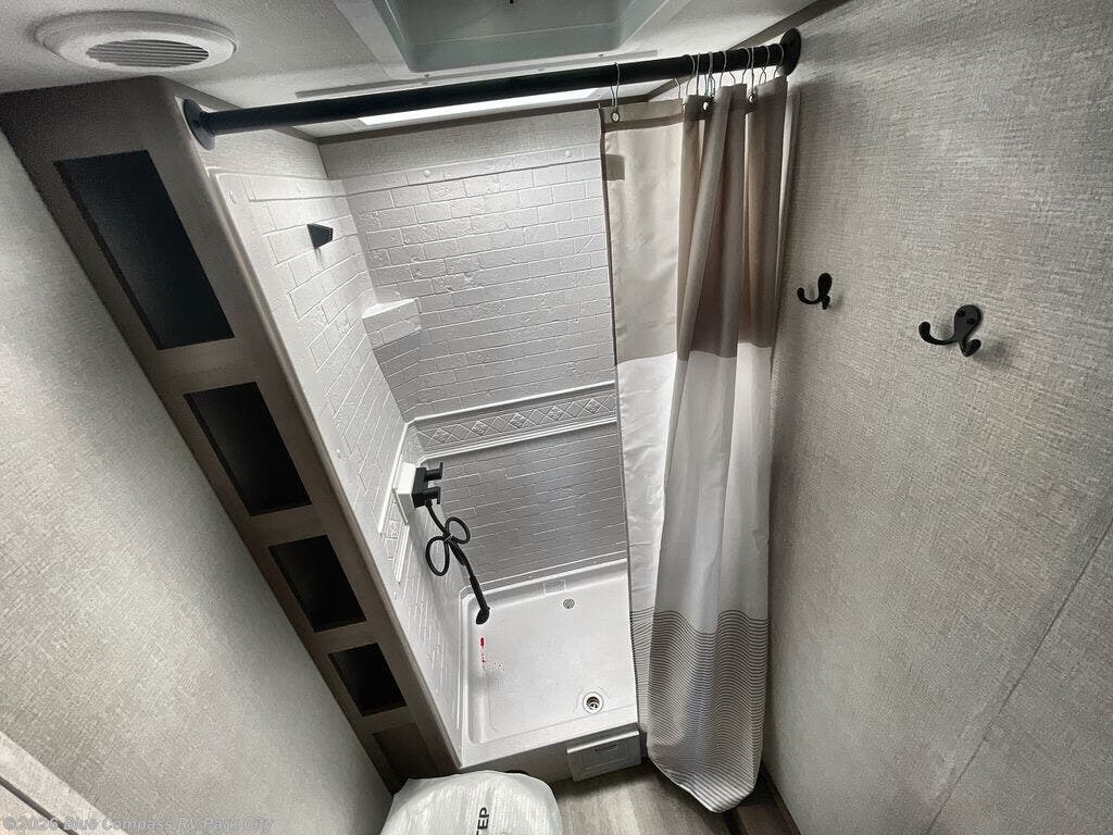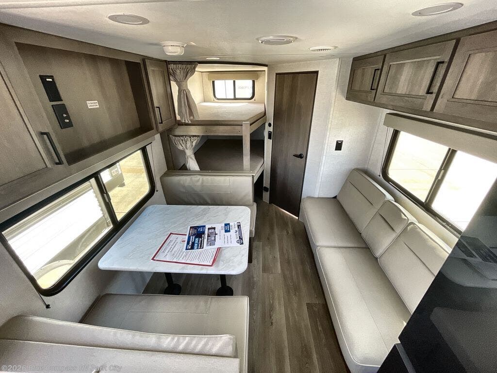 This is the perfect travel trailer if you like to camp with friends and family. Since there are double-size bunks, a queen bed in the front bedroom, plus a booth dinette and sofa, you can sleep eight campers each night! The three burner range and microwave in the kitchen will let you cook meals each day, and the 12V refrigerator will keep your cold items fresh. This model also includes a counter with extra storage underneath, a pull-out trash can storage for convenience, and a full bath to freshen up in each day. And you'll love having your own space in the front bedroom with a privacy curtain, dual wardrobes, and TV prep if you want to add a television!