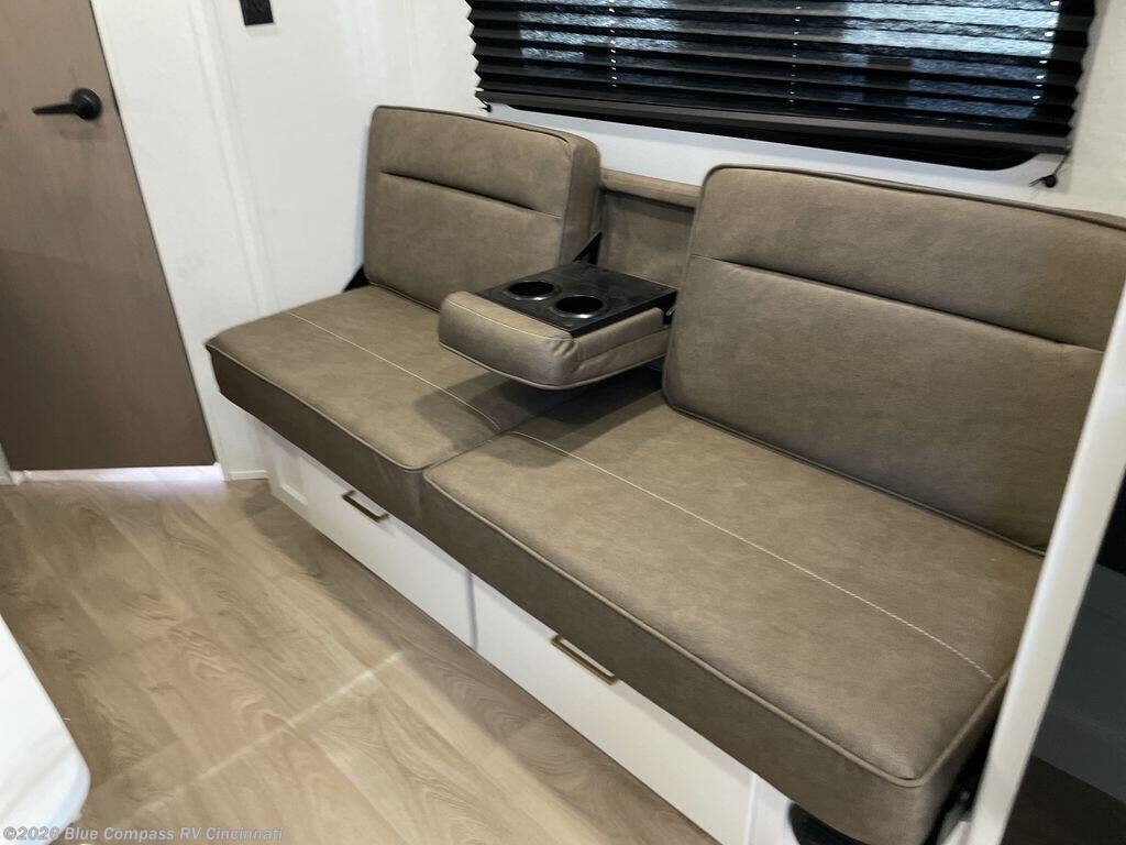 This is the perfect travel trailer if you like to camp with friends and family. Since there are double-size bunks, a queen bed in the front bedroom, plus a booth dinette and sofa, you can sleep eight campers each night! The three burner range and microwave in the kitchen will let you cook meals each day, and the 12V refrigerator will keep your cold items fresh. This model also includes a counter with extra storage underneath, a pull-out trash can storage for convenience, and a full bath to freshen up in each day. And you'll love having your own space in the front bedroom with a privacy curtain, dual wardrobes, and TV prep if you want to add a television!