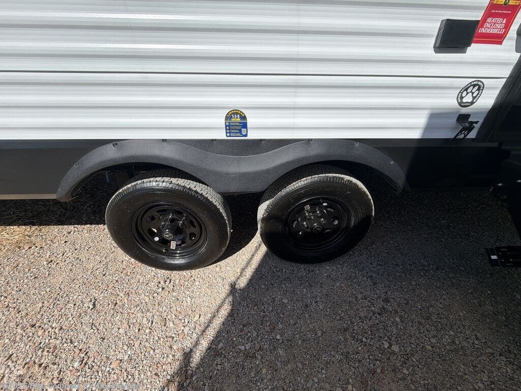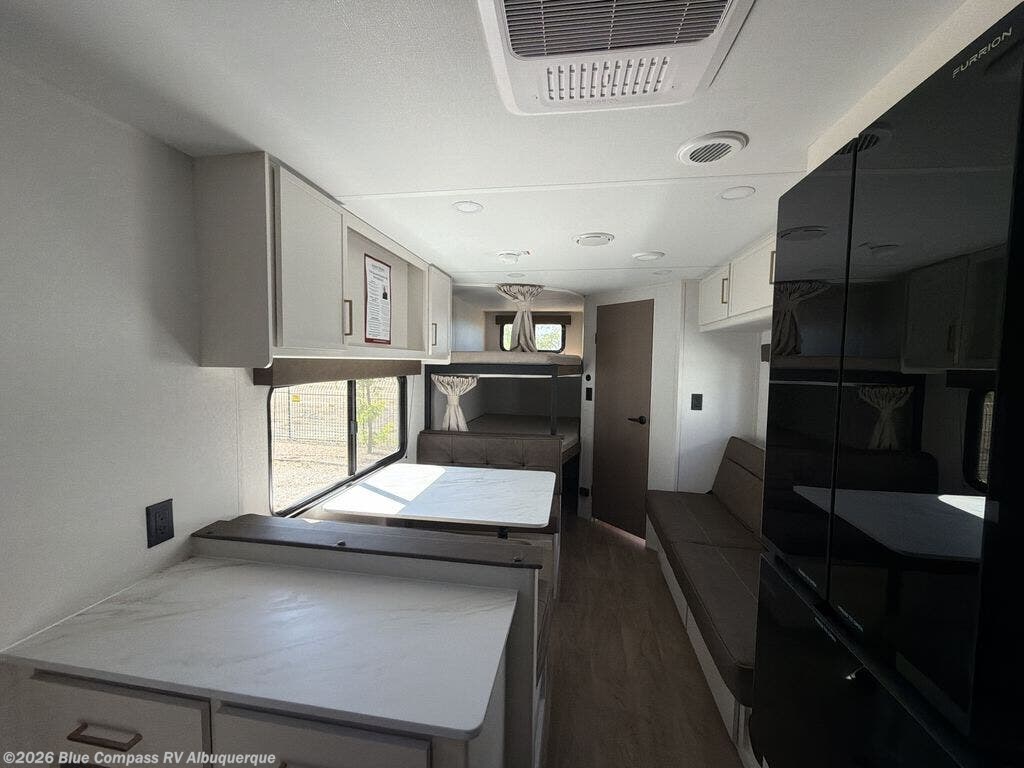 This is the perfect travel trailer if you like to camp with friends and family. Since there are double-size bunks, a queen bed in the front bedroom, plus a booth dinette and sofa, you can sleep eight campers each night! The three burner range and microwave in the kitchen will let you cook meals each day, and the 12V refrigerator will keep your cold items fresh. This model also includes a counter with extra storage underneath, a pull-out trash can storage for convenience, and a full bath to freshen up in each day. And you'll love having your own space in the front bedroom with a privacy curtain, dual wardrobes, and TV prep if you want to add a television!