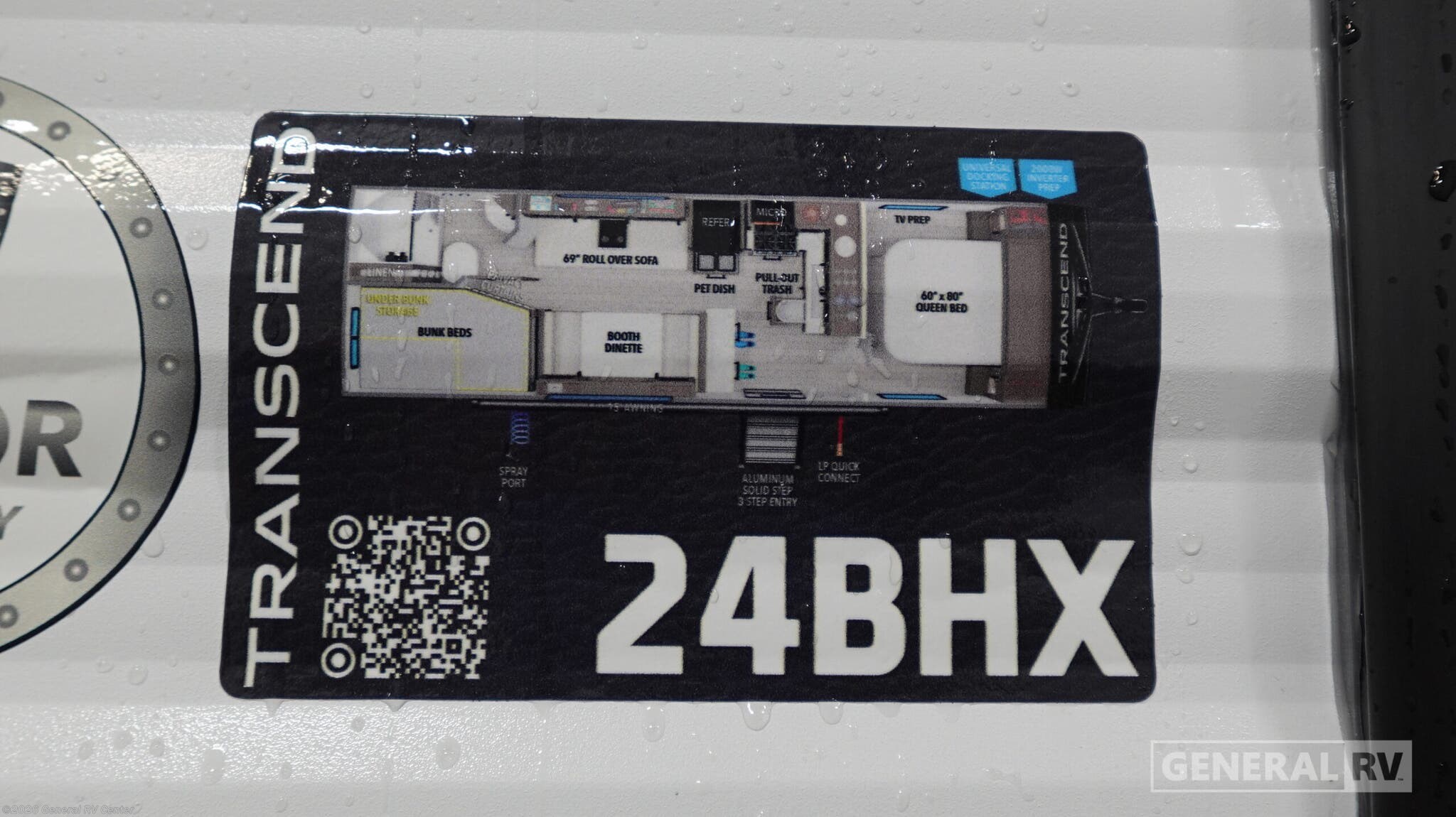 Grand Design Transcend Xplor travel trailer 24BHX highlights: 69" Rollover Sofa Pet Dish 15' Power Awning with LED Light Double-Size Bunks with Curtains This is the perfect travel trailer if you like to camp with friends and family. Since there are double-size bunks, a queen bed in the front bedroom, plus a booth dinette and sofa, you can sleep eight campers each night! The three burner range and microwave in the kitchen will let you cook meals each day, and the 12V refrigerator will keep your cold items fresh. This model also includes a counter with extra storage underneath, a pull-out trash can storage for convenience, and a full bath to freshen up in each day. And you'll love having your own space in the front bedroom with a privacy curtain, dual wardrobes, and TV prep if you want to add a television! The customer-focused, quality-built Transcend Xplor travel trailers by Grand Design are your ticket to fun and adventure. You will appreciate the power tongue jack when it comes time to set up, as well as the all-in-one utility center and the detachable power cord with an LED light. These models include many outlets throughout, USB ports to charge your gadgets, and a JBL exterior speaker to listen to your favorite tunes. The interior of the Transcend Xplor will have you feeling right at home with upgraded residential furniture, residential countertops, residential cabinet doors, and the list goes on!