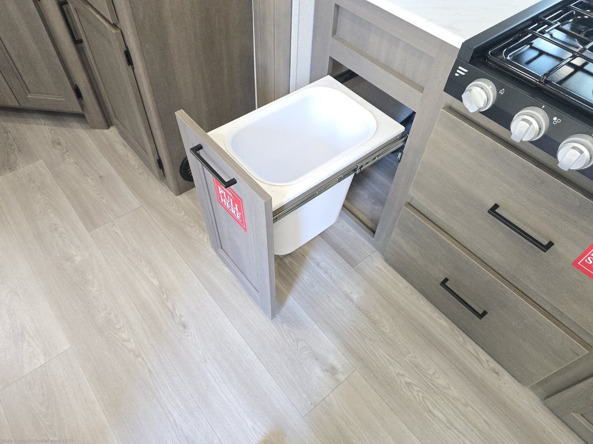 Rear Kitchen Layout – Enjoy a wraparound countertop, deep stainless sink, pull-out trash bin, and a panoramic window over the stove