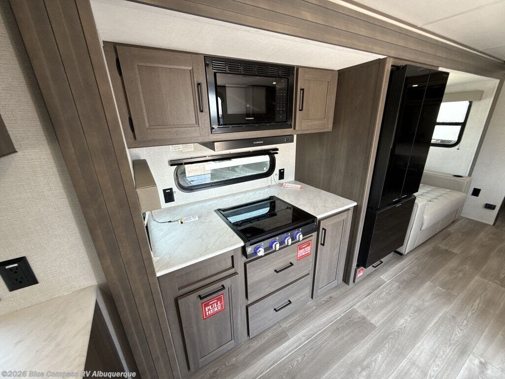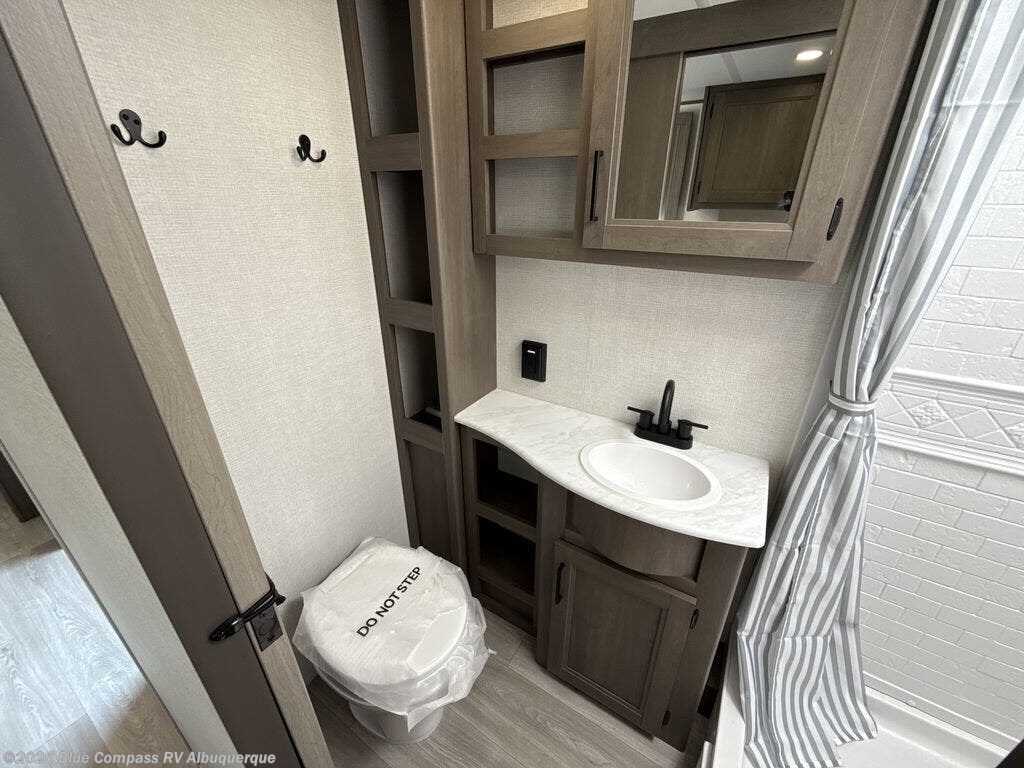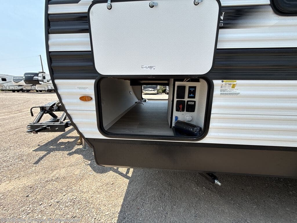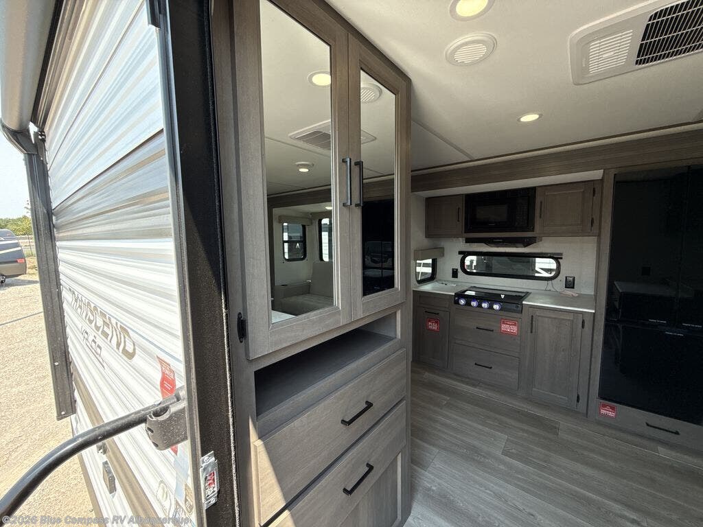 It will be so easy to enjoy camping trips in this travel trailer for five to six! The main living area is made spacious by the large slide out, and here you'll find the 60" sleeper sofa and the kitchen appliances. A booth dinette across the room provides a place to dine and play board games, or you can head outdoors to sit under the 17' power awning with LED lights. The queen bed in the front private bedroom will have you feeling right at home, and the TV prep here gives you the option to watch movies in bed. This model also includes a rear corner kitchen with ample counter space and a large sink, and you'll find the full bath in the other rear corner!
