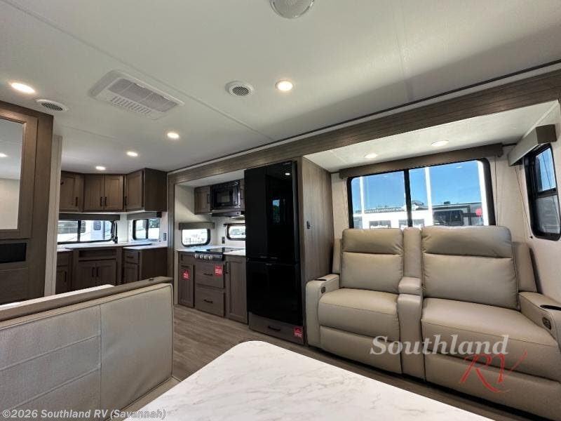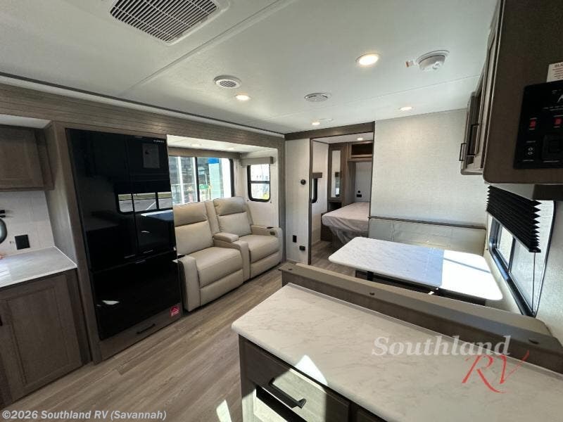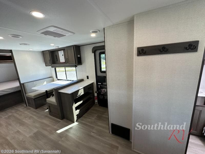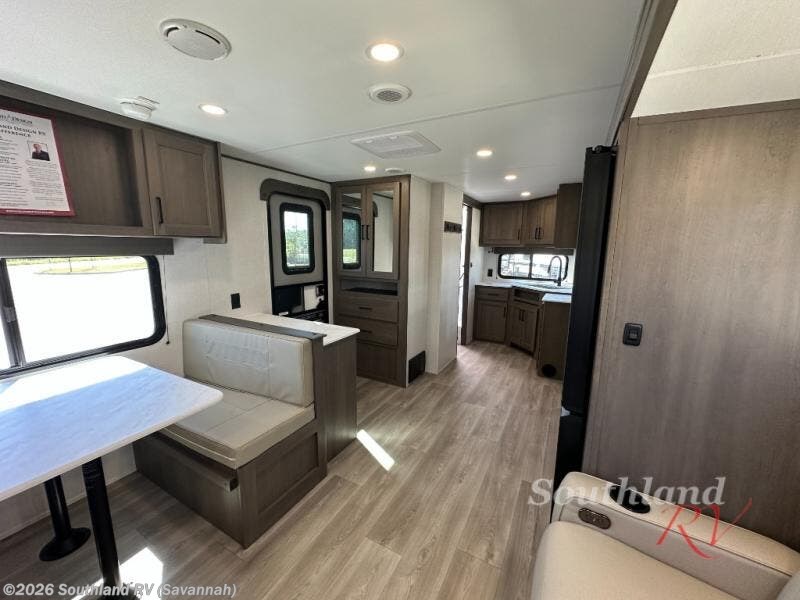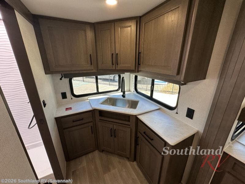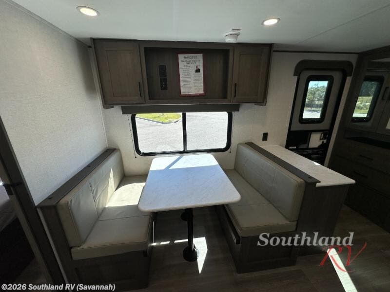It will be so easy to enjoy camping trips in this travel trailer for five to six! The main living area is made spacious by the large slide out, and here you'll find the 60" sleeper sofa and the kitchen appliances. A booth dinette across the room provides a place to dine and play board games, or you can head outdoors to sit under the 17' power awning with LED lights. The queen bed in the front private bedroom will have you feeling right at home, and the TV prep here gives you the option to watch movies in bed. This model also includes a rear corner kitchen with ample counter space and a large sink, and you'll find the full bath in the other rear corner!