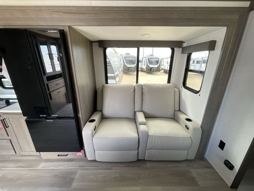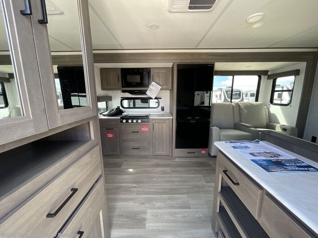 It will be so easy to enjoy camping trips in this travel trailer for five to six! The main living area is made spacious by the large slide out, and here you'll find the 60" sleeper sofa and the kitchen appliances. A booth dinette across the room provides a place to dine and play board games, or you can head outdoors to sit under the 17' power awning with LED lights. The queen bed in the front private bedroom will have you feeling right at home, and the TV prep here gives you the option to watch movies in bed. This model also includes a rear corner kitchen with ample counter space and a large sink, and you'll find the full bath in the other rear corner!