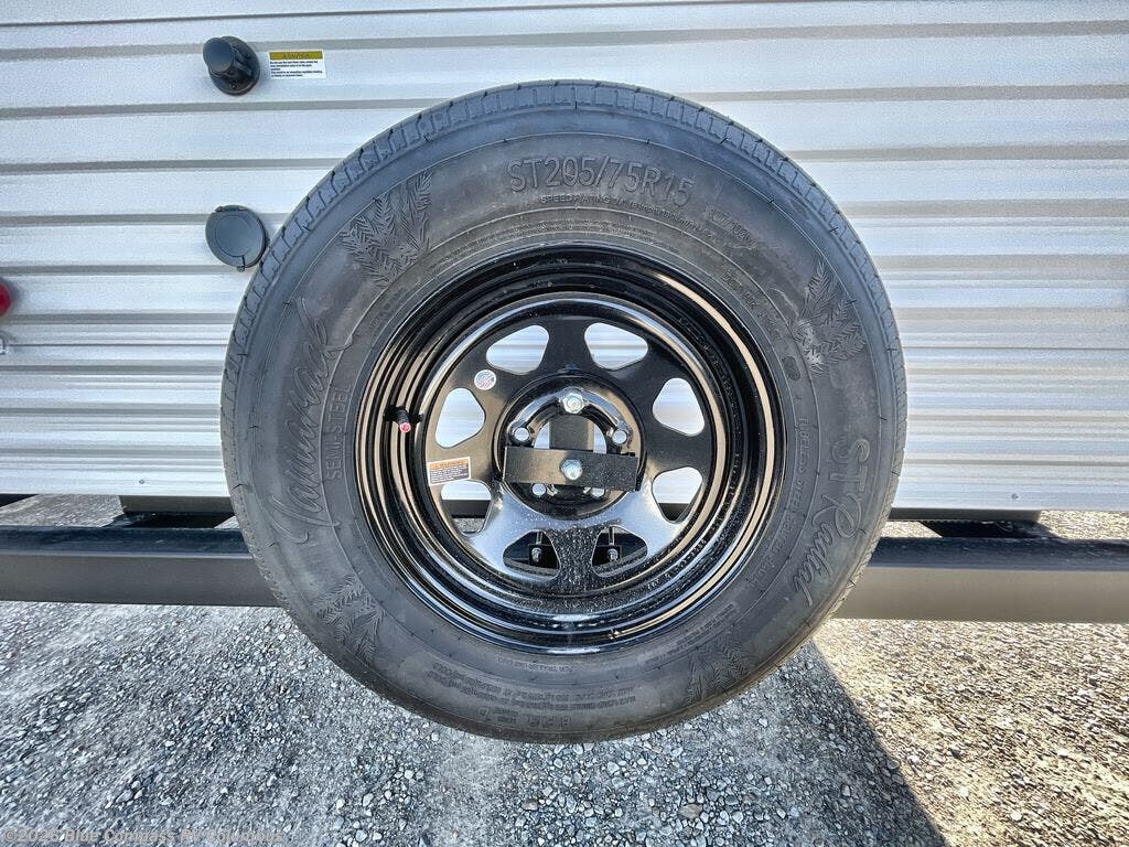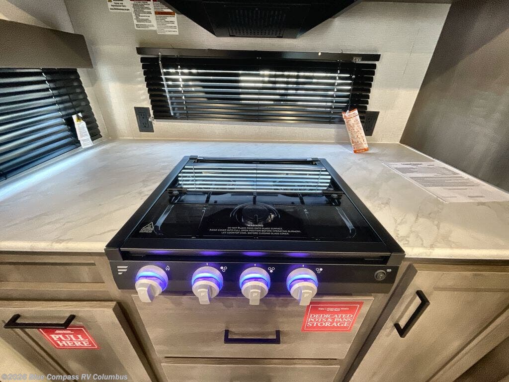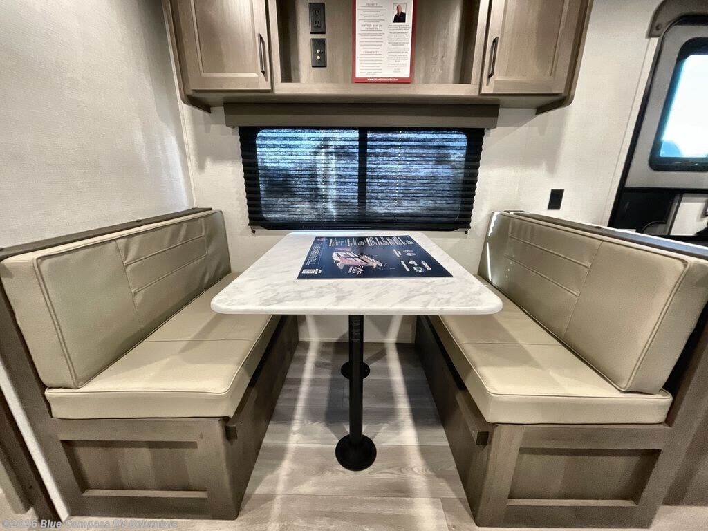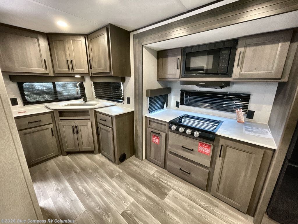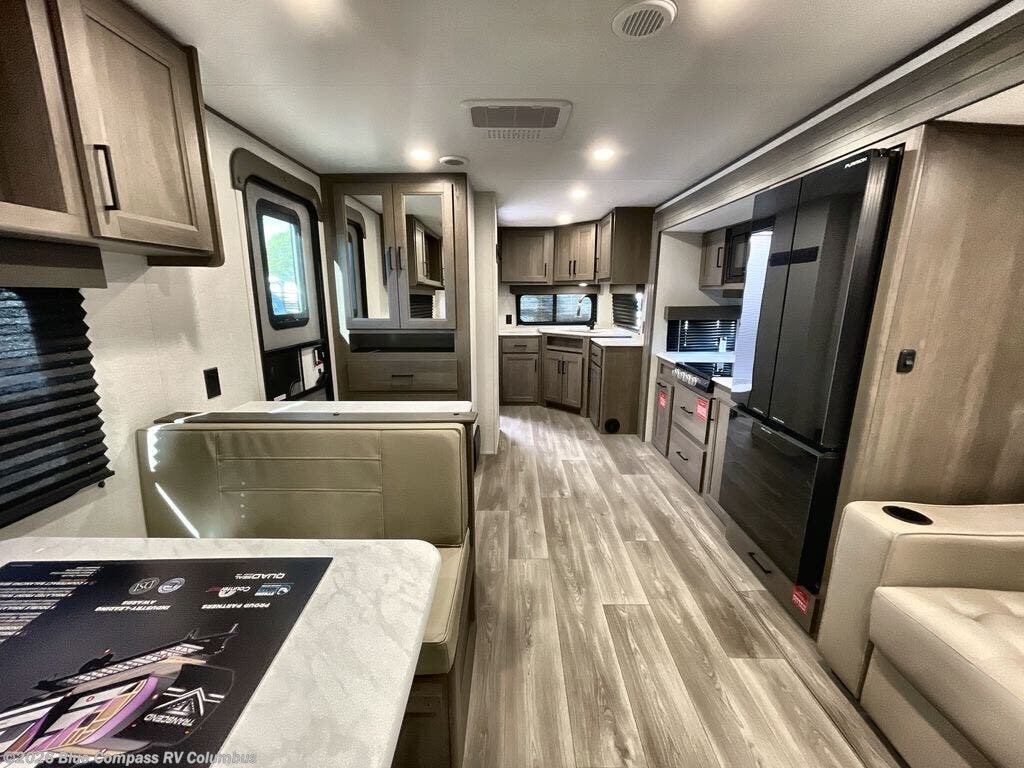 It will be so easy to enjoy camping trips in this travel trailer for five to six! The main living area is made spacious by the large slide out, and here you'll find the 60" sleeper sofa and the kitchen appliances. A booth dinette across the room provides a place to dine and play board games, or you can head outdoors to sit under the 17' power awning with LED lights. The queen bed in the front private bedroom will have you feeling right at home, and the TV prep here gives you the option to watch movies in bed. This model also includes a rear corner kitchen with ample counter space and a large sink, and you'll find the full bath in the other rear corner!